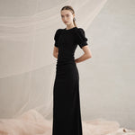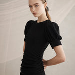 Luxe De Valentina Ruched Como Maxi Dress in Black Metallic Knit. Our Ruched Como Maxi Dress in Black Metallic Knit is designed to flatter the body where ruching detail smooth and contour the body, offering gentle shaping and ease. Puff sleeves with shoulder pad support bring a touch of volume, while a round neckline finished with contrast piping and gold buttons deliver elegant detailing.