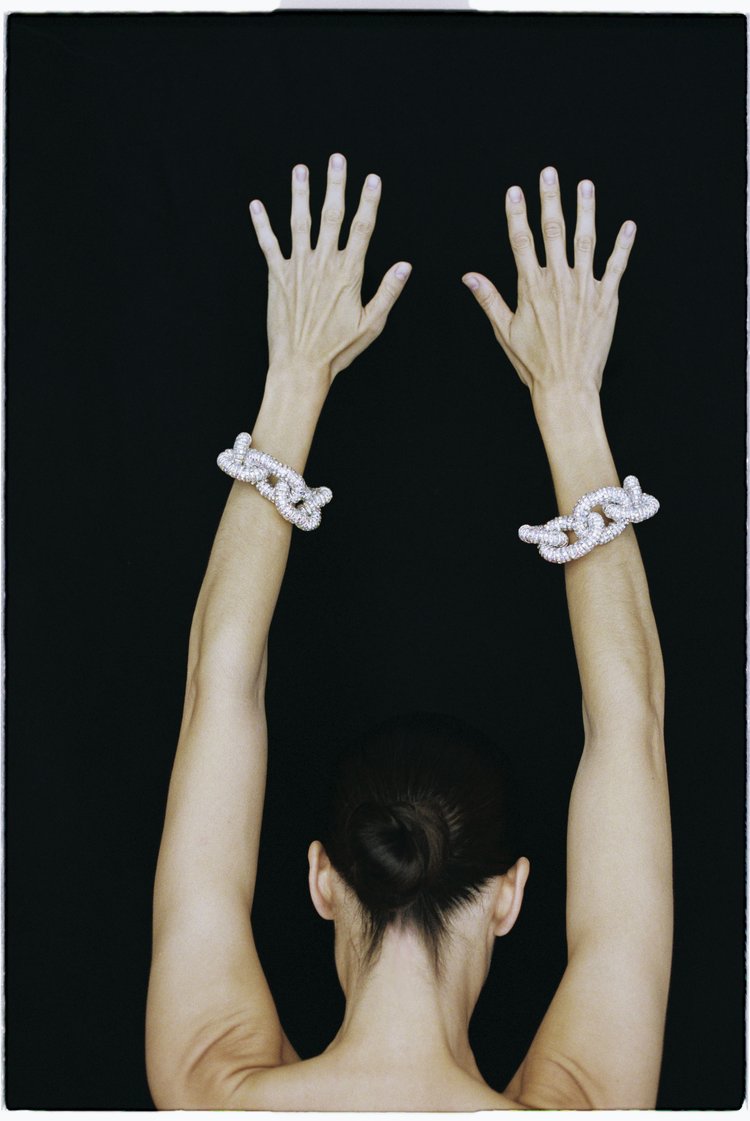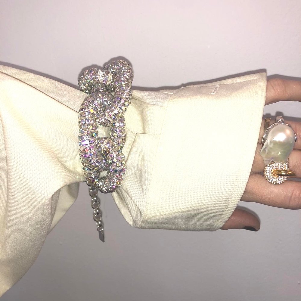 Pearl Octopuss.y Diamond Tire Bracelet in Silver. THE PEARL OCTOPUSS.Y DIAMOND TIRE BRACELET made with Round shaped Silver Plated beads with light reflecting glass crystals. Oversized Spring Ring made in Silver plated brass.