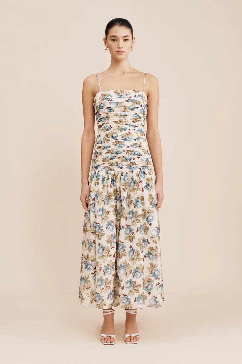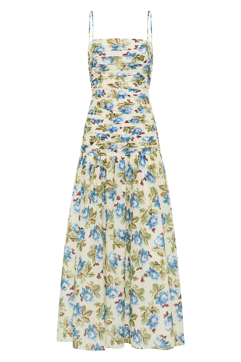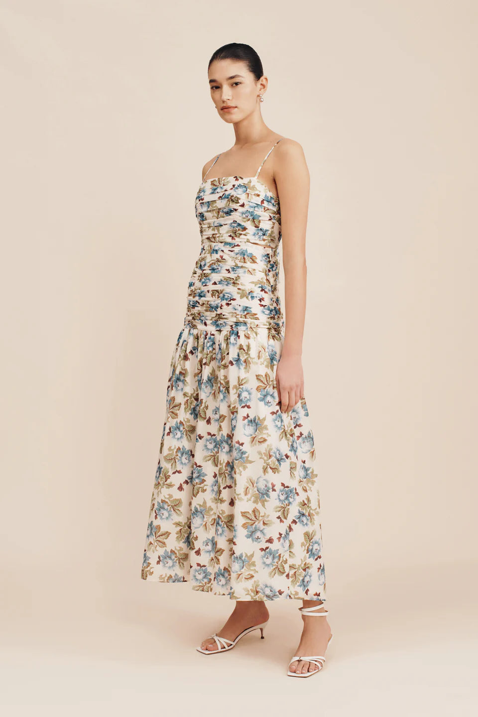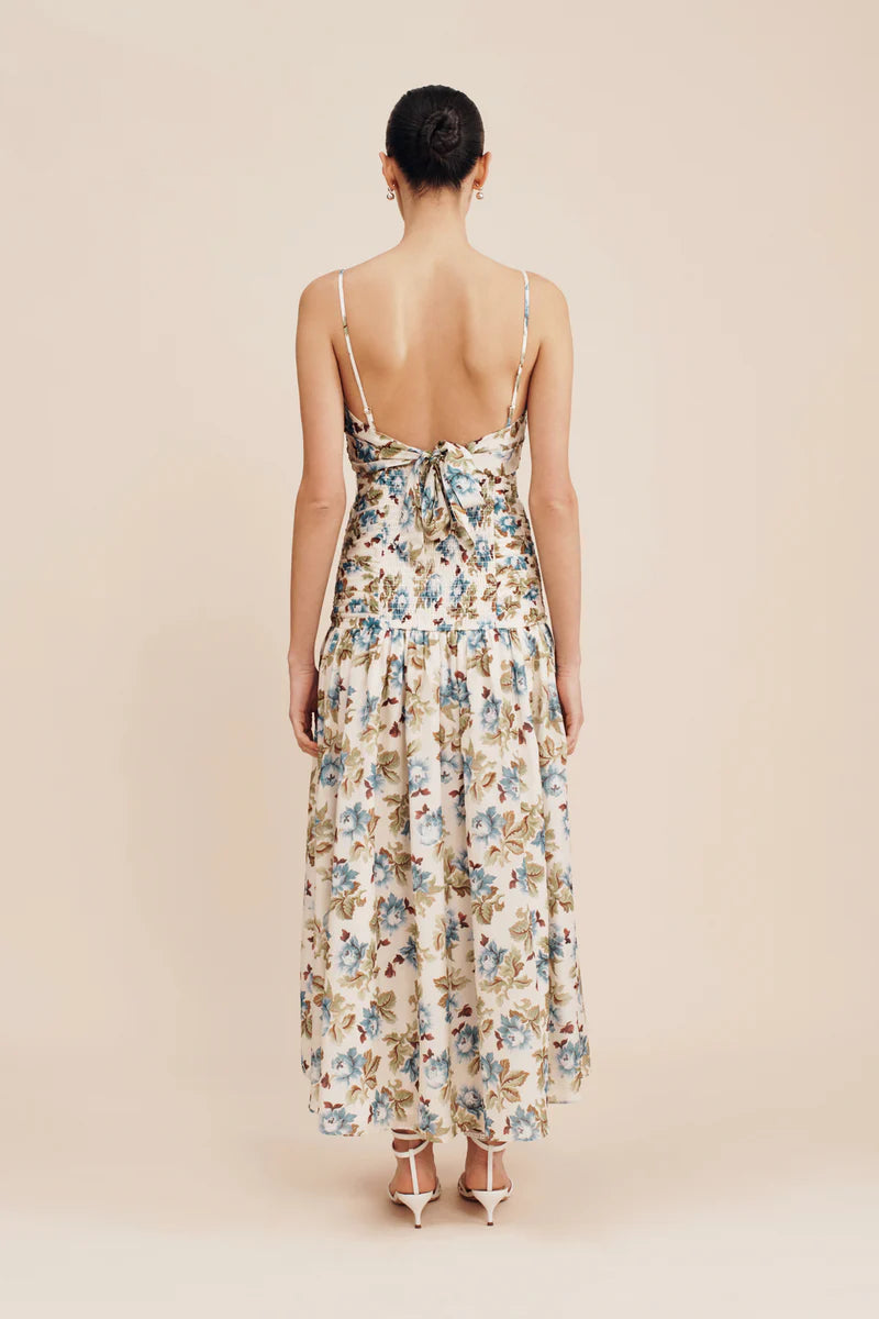 Crafted from a luxurious silk-cotton blend and adorned with vintage-inspired florals, the Raquel Dress is designed for a close fit. It's gathered throughout the waist and has a free-flowing, softly pleated skirt before turning to reveal a stunning tie feature at the back.