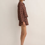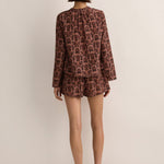 Sarah-Jane Clarke Tie Front Blouse in Sunset Leopard. The Tie Front Blouse pairs a classic mandarin collar with our exclusive Sunset Leopard print. Cut from silk-cotton blend with a relaxed body and slim sleeves, finished with self-ties at front.