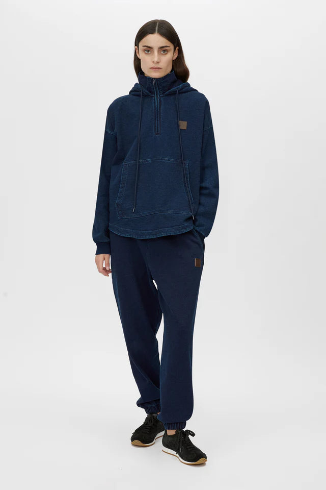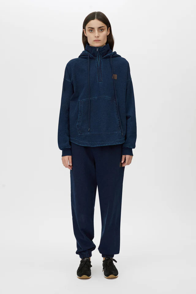 Camilla and Marc Gravitas Zip Up Denim Yarn Hoodie in Ink. The Gravitas Zip Up Denim Yarn Hoodie combines modern style with everyday practicality. Featuring a high neck collar, self-fabric lined hood, and a functional zipper opening, this hoodie is designed for effortless comfort and versatility. Finished with a supple embossed leather patch, ribbed cuffs, and a shaped hem with twin needle stitching, it delivers a refined and timeless look. Style notes: Perfect for weekend getaways, pair with Gravitas Denim Yarn Trackpant for a tonal approach to loungewear.