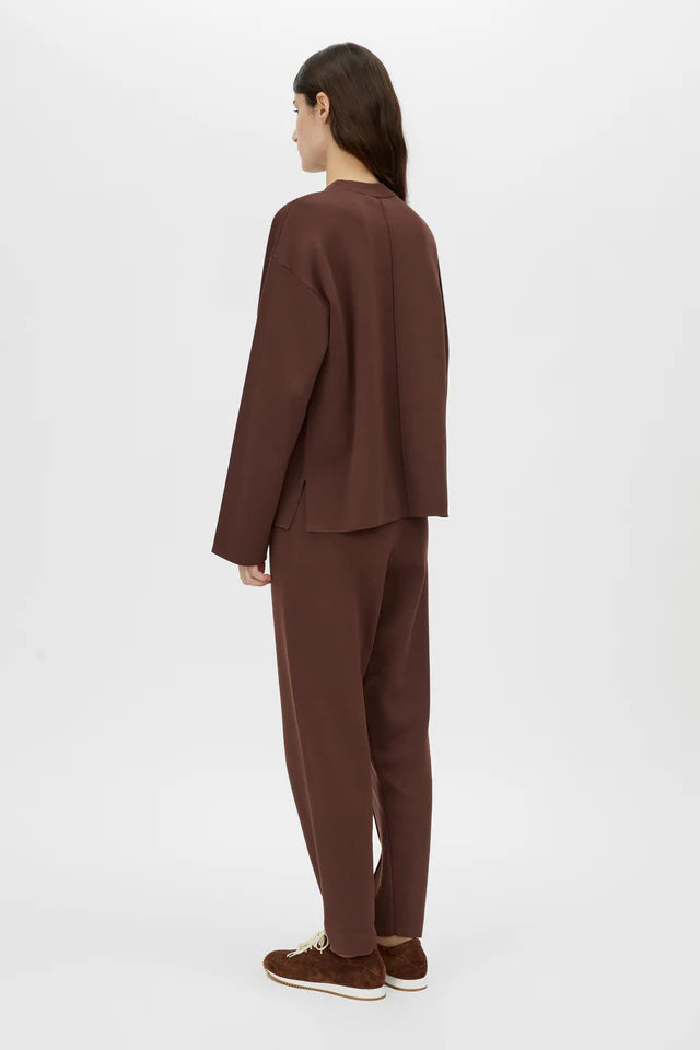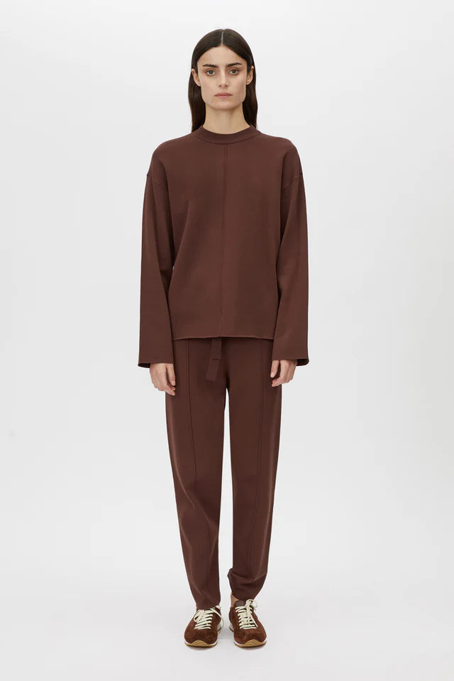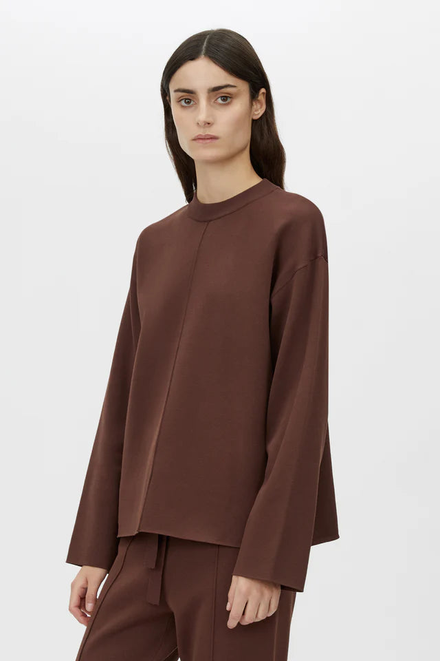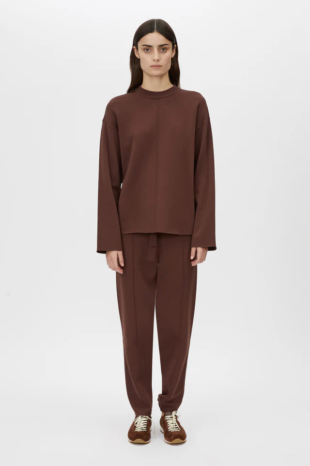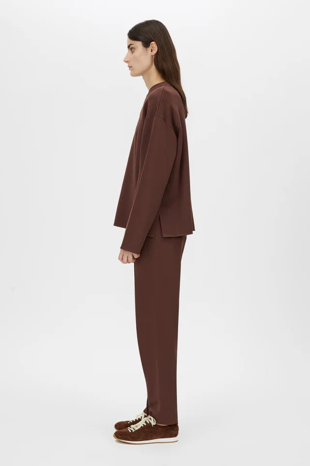 Camilla and Marc Lyndon Knit Sweater in Chocolate. The Lyndon Knit Sweater is a versatile and refined piece with a crew neck and rib knit neckline for a modern, flattering fit. Its side seam splits and pintuck details down the front and back add an elevated touch to the classic silhouette. With a regular fit, this sweater offers an effortless balance of practicality and contemporary style. Style notes: For effortless style, pair with the coordinating Lyndon Knit Pant in Chocolate.