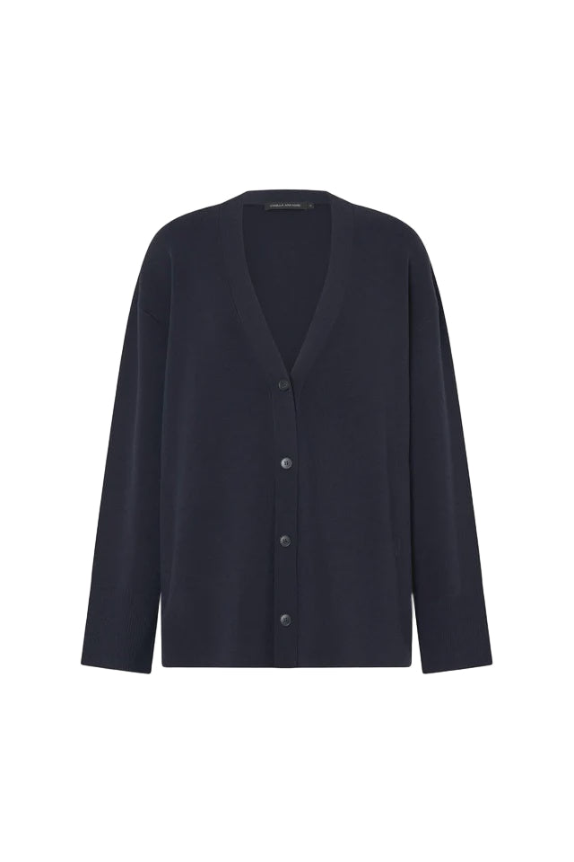 Camilla and Marc Orwell Milano Knit Cardigan in Navy. The Orwell Milano Knit Cardigan offers a refined boxy fit with a modern V-neck silhouette, perfect for layering. Featuring rib fashioning on the placket seams and a subtly embroidered monogram on the front, this piece exudes contemporary style. The oversized fit, ribbed sleeve hems, and rolled-back shoulder details complete the cardigan's practical yet elevated design.