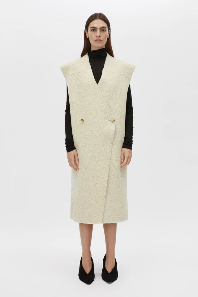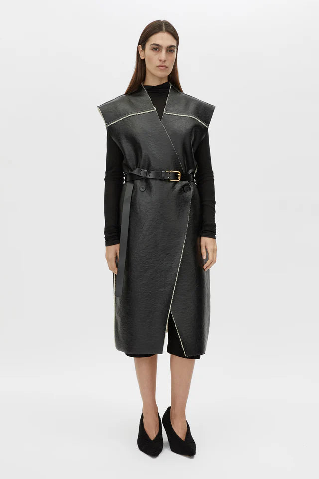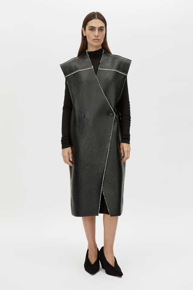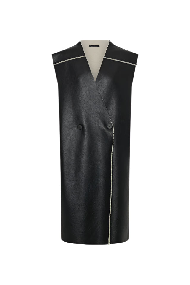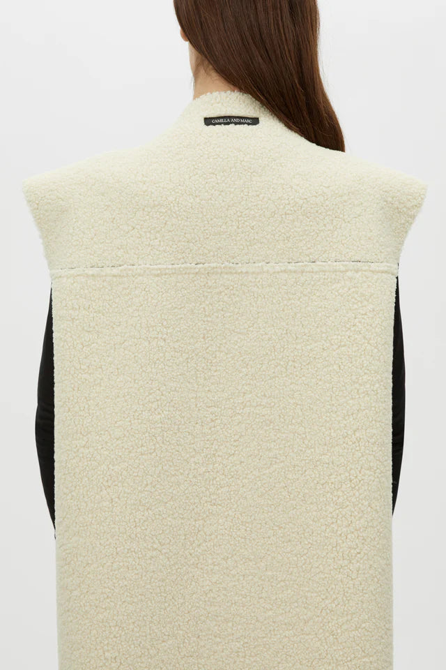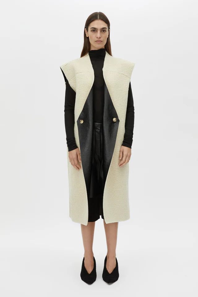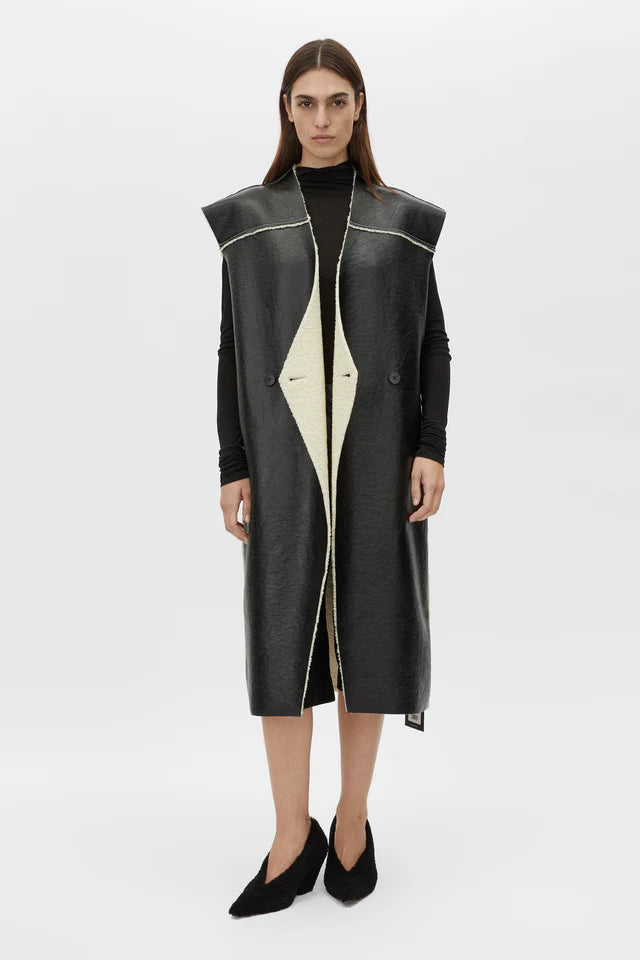 Camilla and Marc Oswald Reverse Shearling Long Vest in Black.  CAMILLA AND MARC Oswald Reverse Shearling Long Vest in Black. The Oswald Reverse Shearling Long Vest offers a modern twist on classic styling with its reversible design and double-breasted silhouette. Crafted with twin needle seams and a raw cut hem, it showcases a refined attention to detail, highlighted by its monogram buttons. This piece provides a contemporary yet timeless look, effortlessly elevating any wardrobe. Style notes: From alfresco dining to modern business ventures, pair with classic tailoring for a sleek approach.
