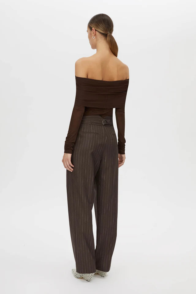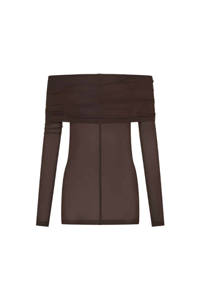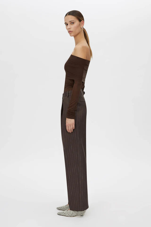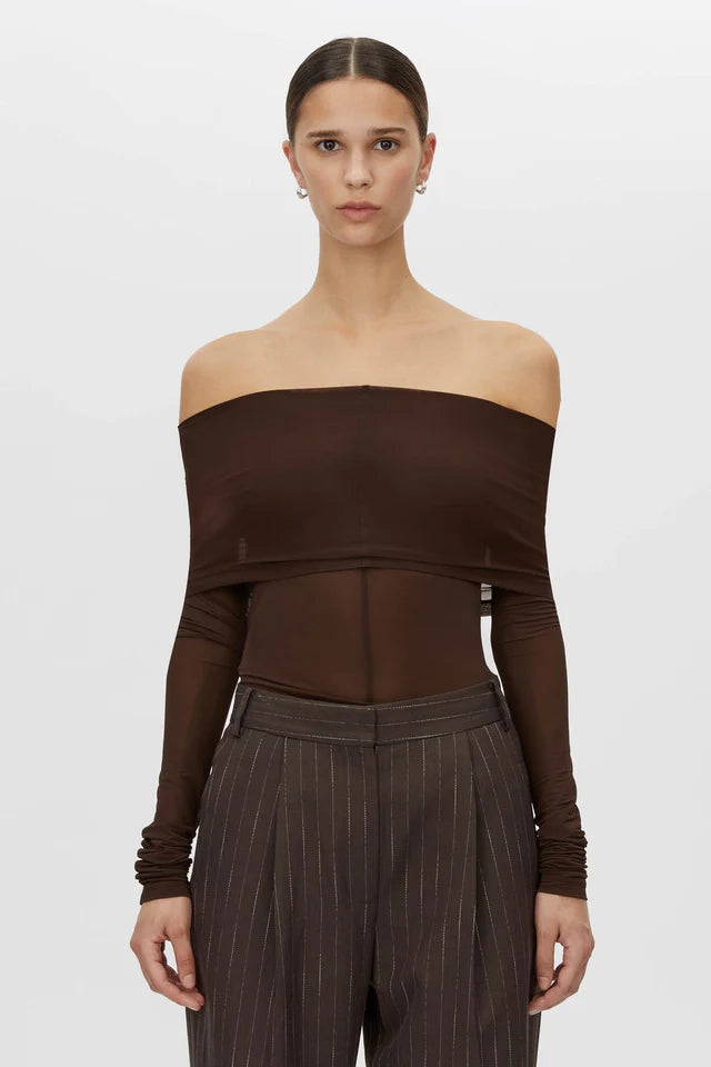 Camilla and Marc Siphon Off Shoulder Top in Chocolate. The Siphon Off Shoulder Top combines modern design with timeless appeal, featuring a wide off-shoulder drape that gracefully falls over the bust. Its fitted sleeves and torso offer a refined silhouette, while the hosiery seam detailing adds a subtle, elevated touch. This top captures an effortless femininity, perfect for making a statement with precision.