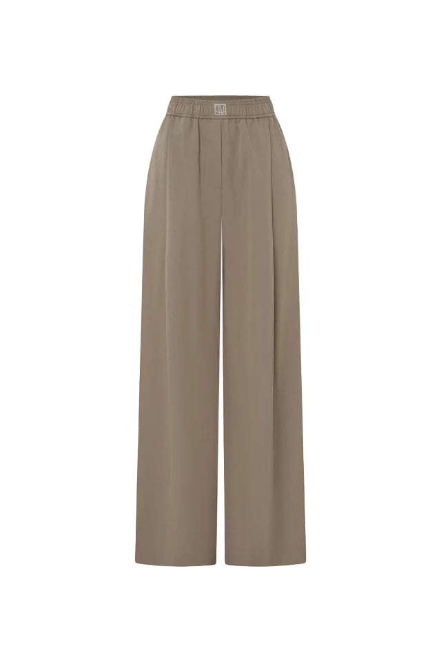 Camilla and Marc Zeno Monogram Elastic Pant in Khaki. The Zeno Monogram Elastic Pant combines modern design with refined detailing. Featuring a self-fabric waistband with a centrally embroidered monogram, the deep tucks and gathers at the waist provide a flattering, structured silhouette. Slant pockets, twin needle stitching, and a blind hem enhance the pants practical yet elevated style.