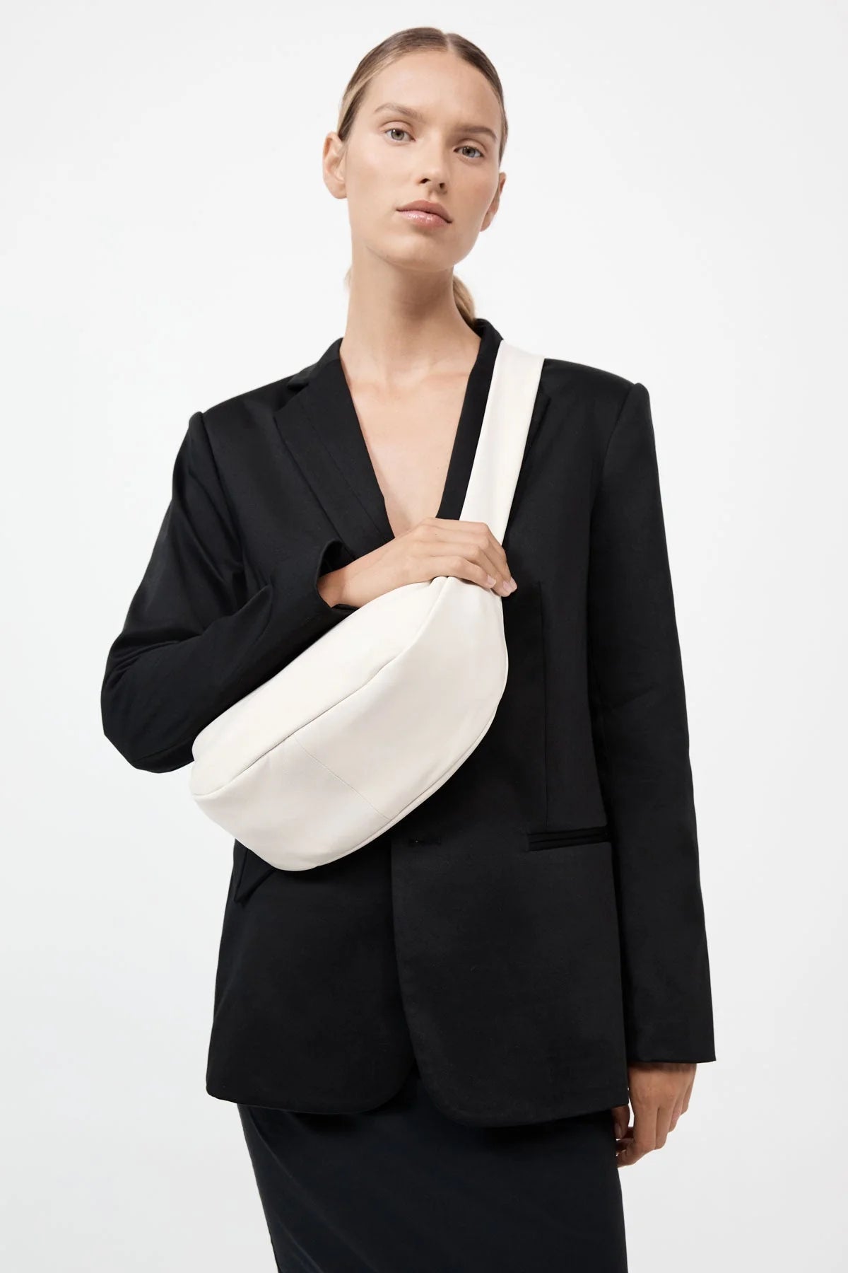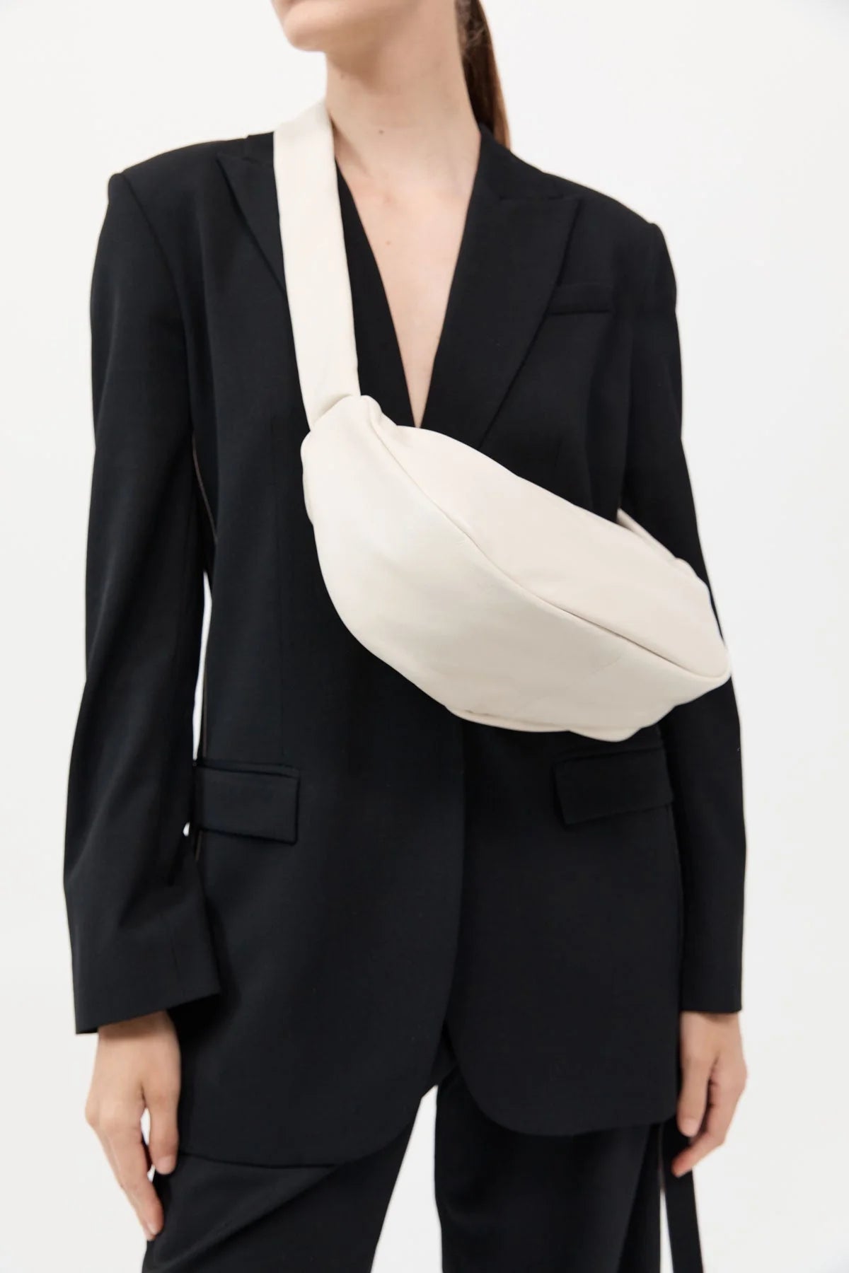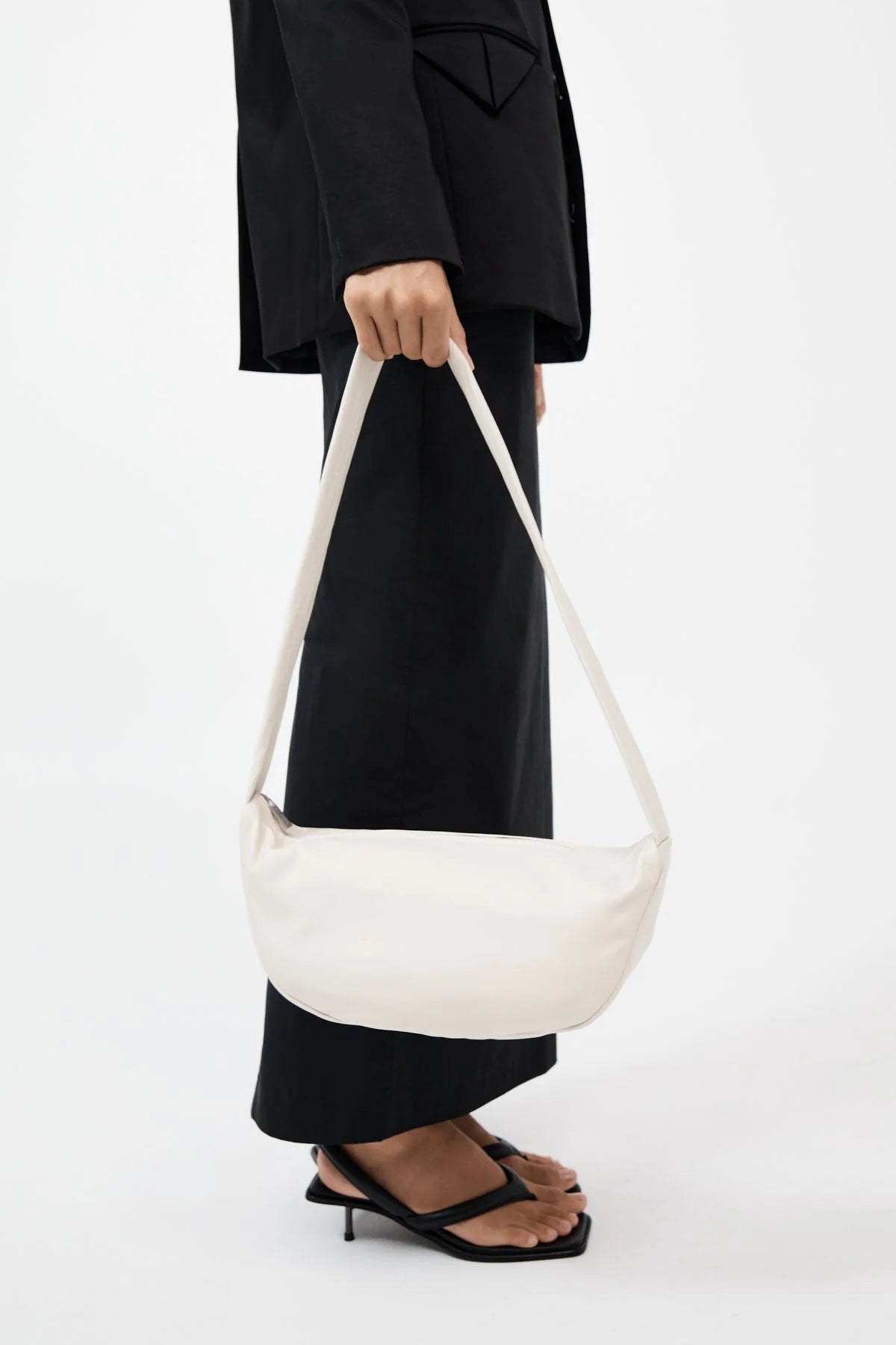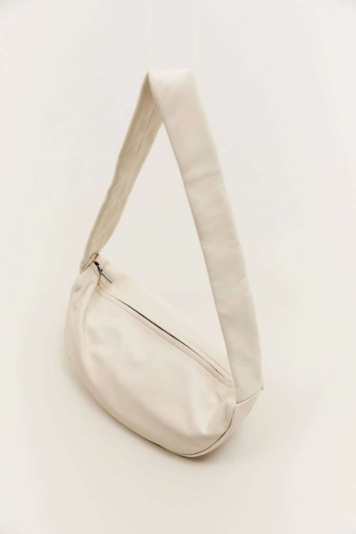 St Agni Soft Crescent Bag in Tofu. The Soft Crescent Bag combines contemporary style with functionality. Featuring a sleek croissant shape and crafted from 100% leather with a plush suede lining. Designed for effortless wear, the Soft Crescent Bag makes an everyday accessory for the modernist on the move.