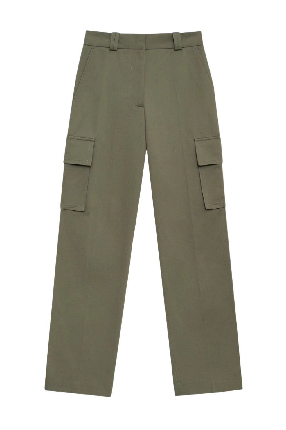 Anine Bing Dayton Cargo Pant in Olive. A utility-inspired bottom constructed from a midweight textured wool blend with a dry, slick hand. The Dayton Cargo Pant is half lined to the knee and features a relaxed, straight wide leg with oversized cargo pockets and back patch pockets. Complete with a front zip opening with a hook and bar closure and functional belt loops.