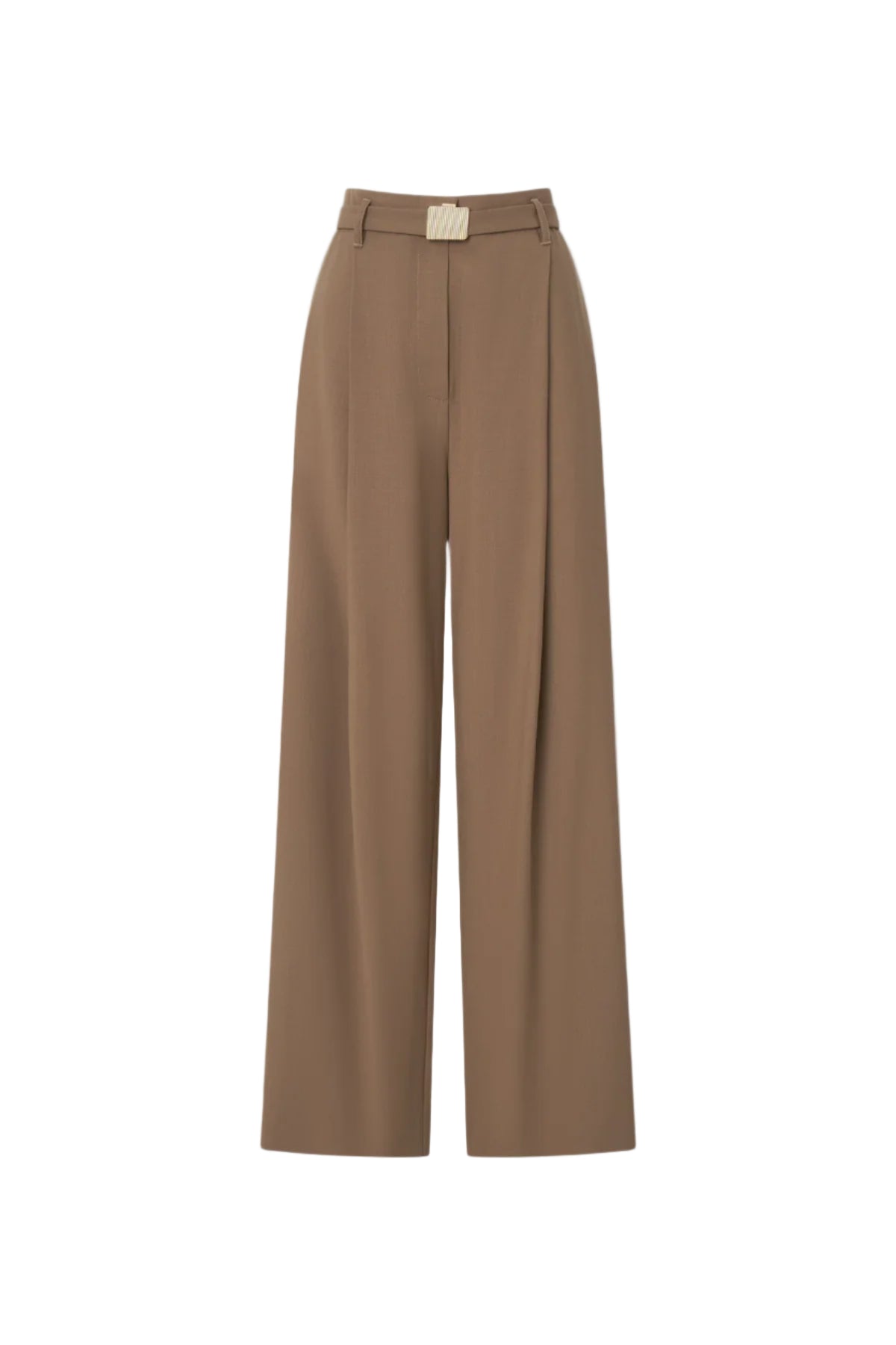 Camilla and Marc Balsam Pant in Camel. The Balsam Pant features a tailored fit with a bold contrast side stripe and topstitching detail for a refined yet modern look. Designed with permanent pressed pleats down both the front and back legs, it offers a sharp, structured silhouette. The waist is accentuated with a speciality metal buckle belt, adding an elegant touch to this statement piece.