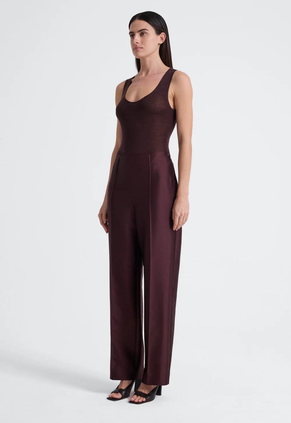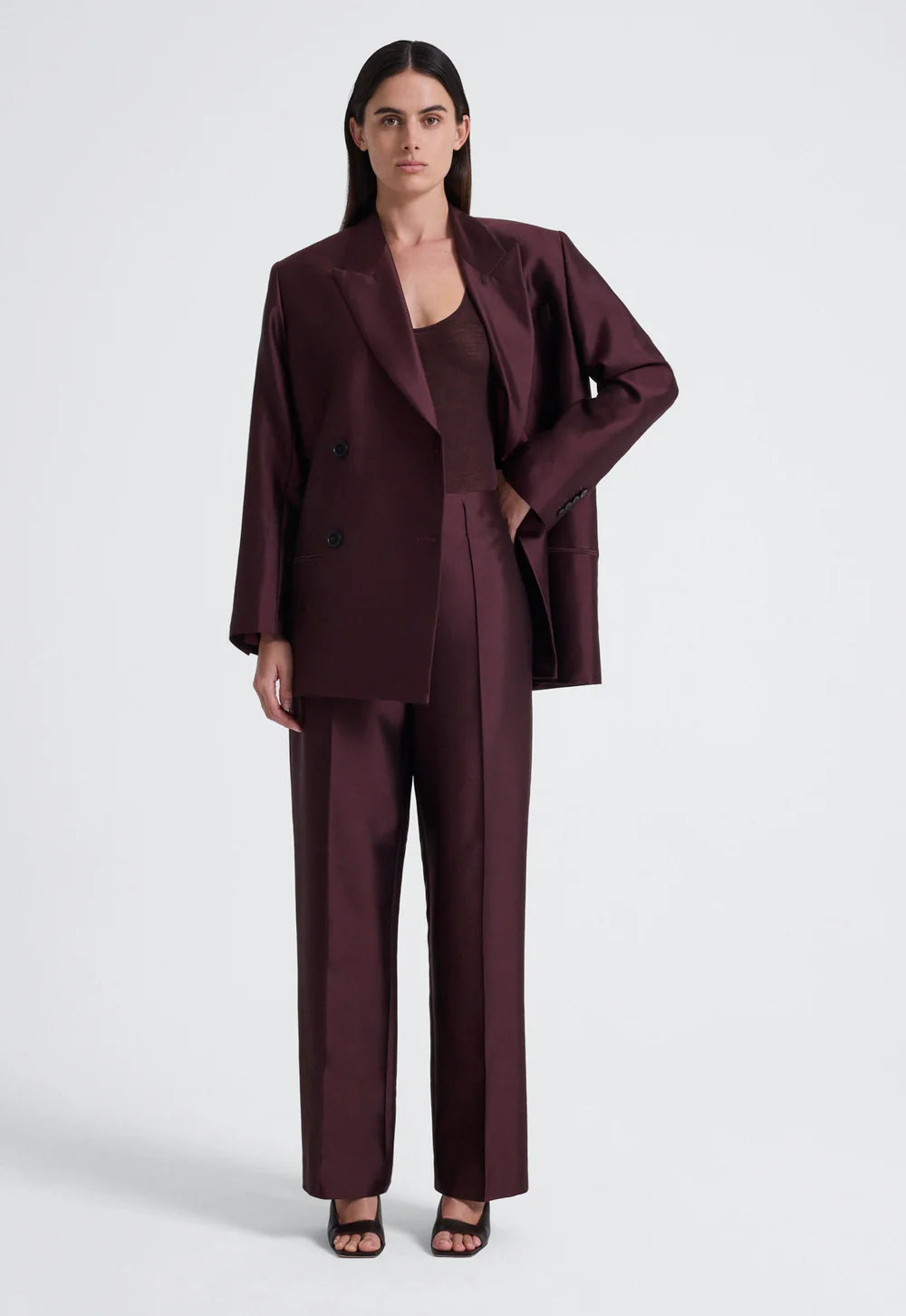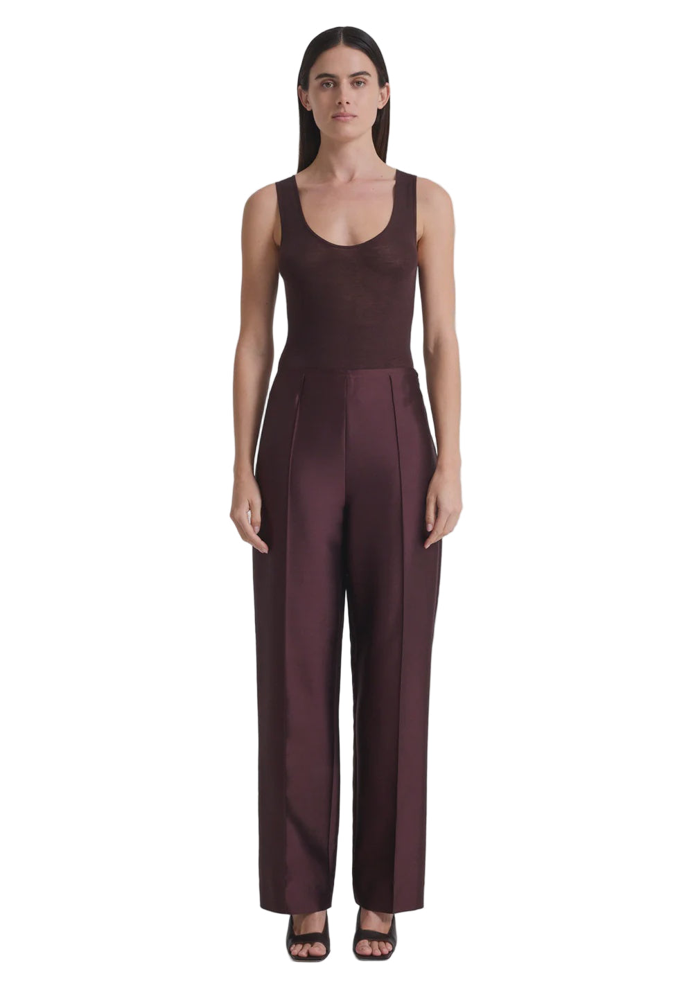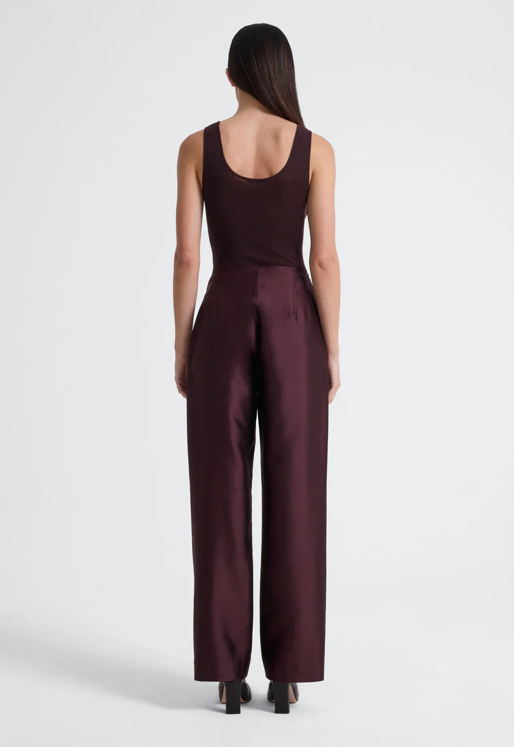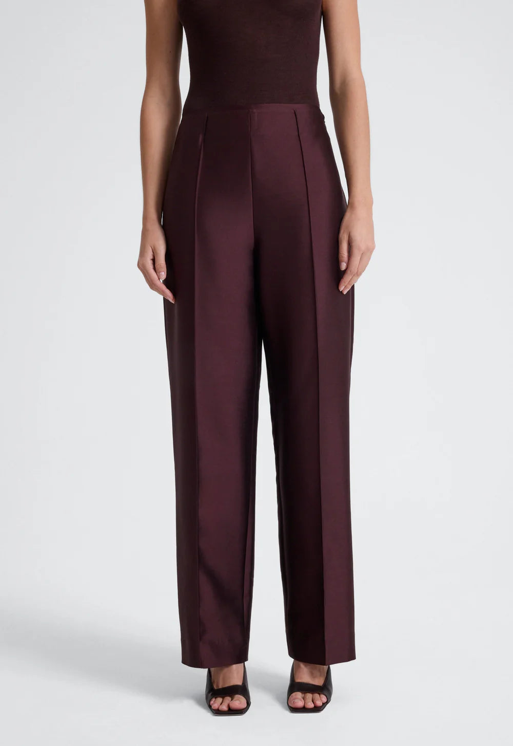 Jac and Jack Roller Pant in Drew. With a gloss finish, pin stitch detailing, micro waistband and full-length straight leg, these clean and sophisticated, high-waisted pants pair perfectly with an oversized sweater or matching jacket.