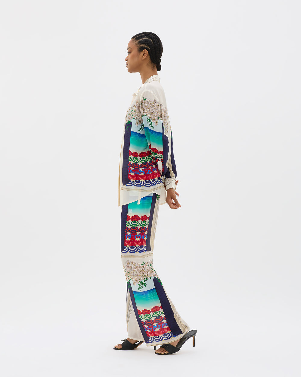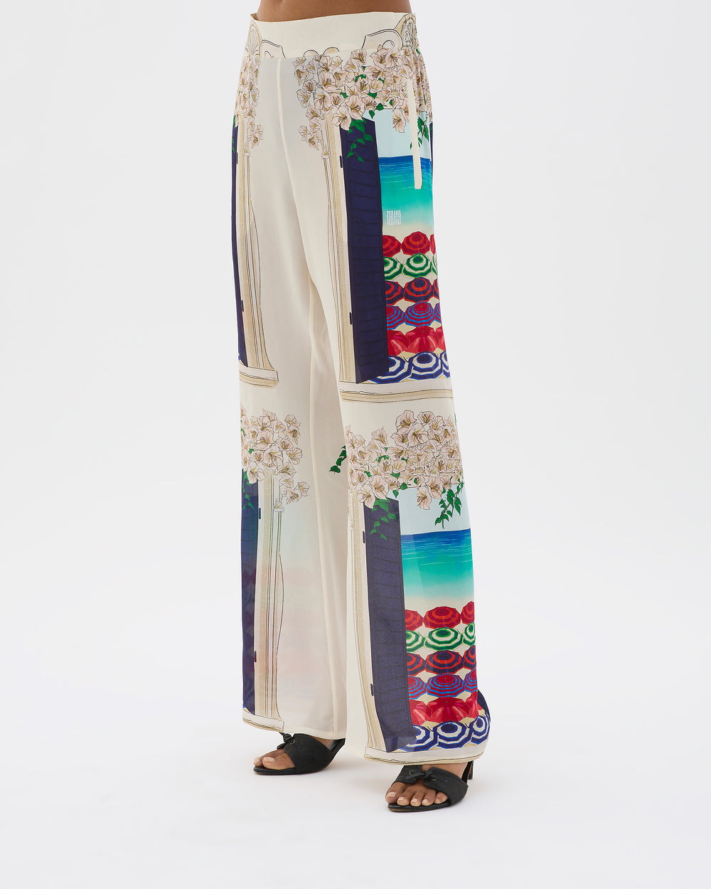 Muma World Riviera Bias Pant in Riviera. Featuring our signature hand-illustrated & hand-placed prints in a new mediterranean-inspired setting featuring the setting of the French Riviera. With a loose, flowing silhouette that drapes beautifully to the ankles, they offer both comfort and sophistication. This co-ordinated set whether paired together or contrasted with other stories, is perfect for making an elevated statement with ease.