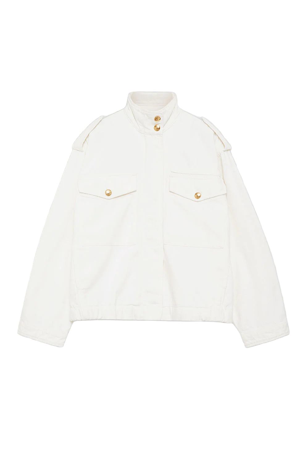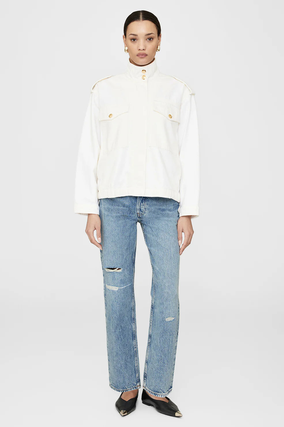 The Audrey Jacket is made from a midweight, rigid organic cotton denim blend. Its utilitarian construction features a high collar, epaulets at the shoulders, back sleeve vents, discrete adjustable cording at the hem, and snap buttons down its center-front opening. Finished with two flap pockets at the chest.