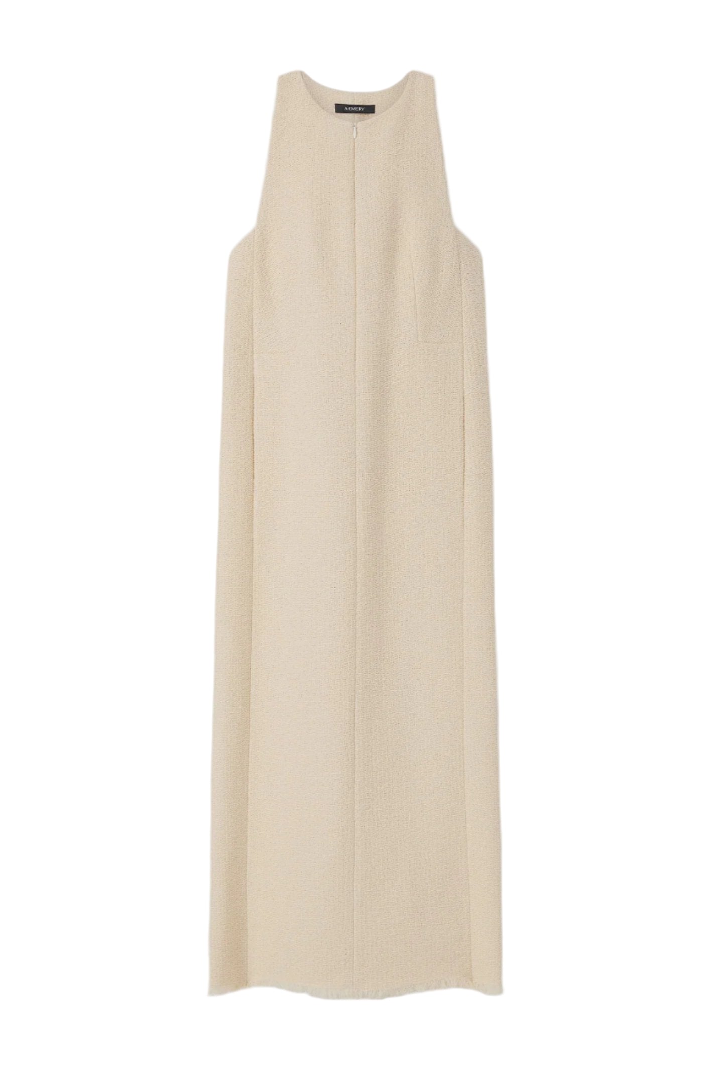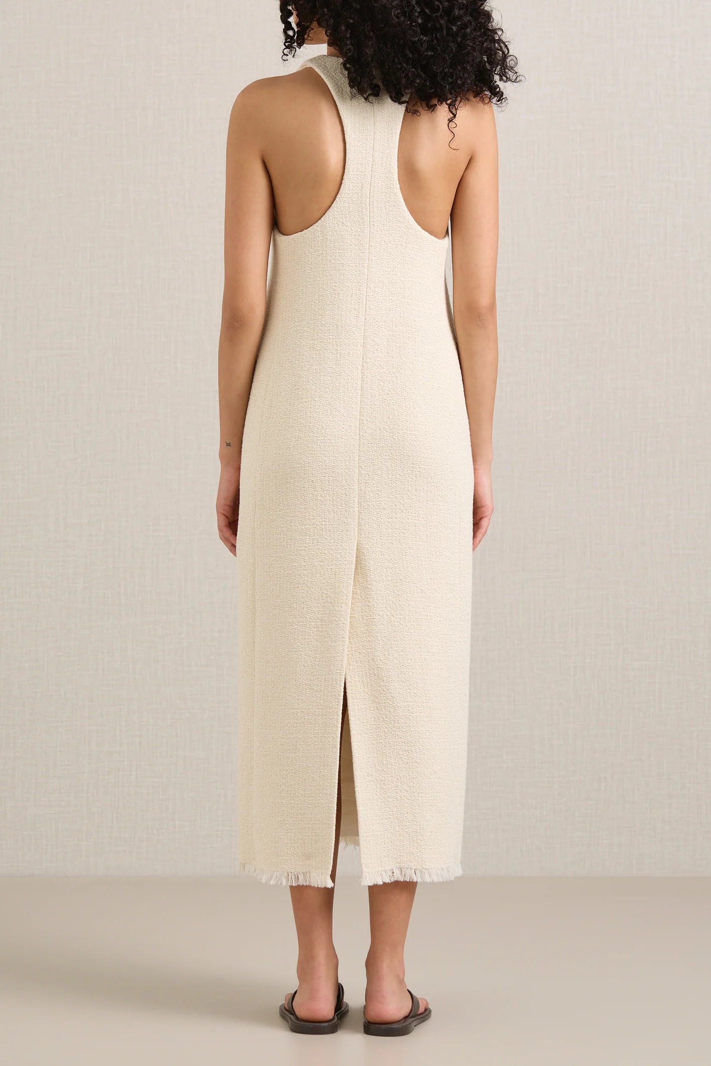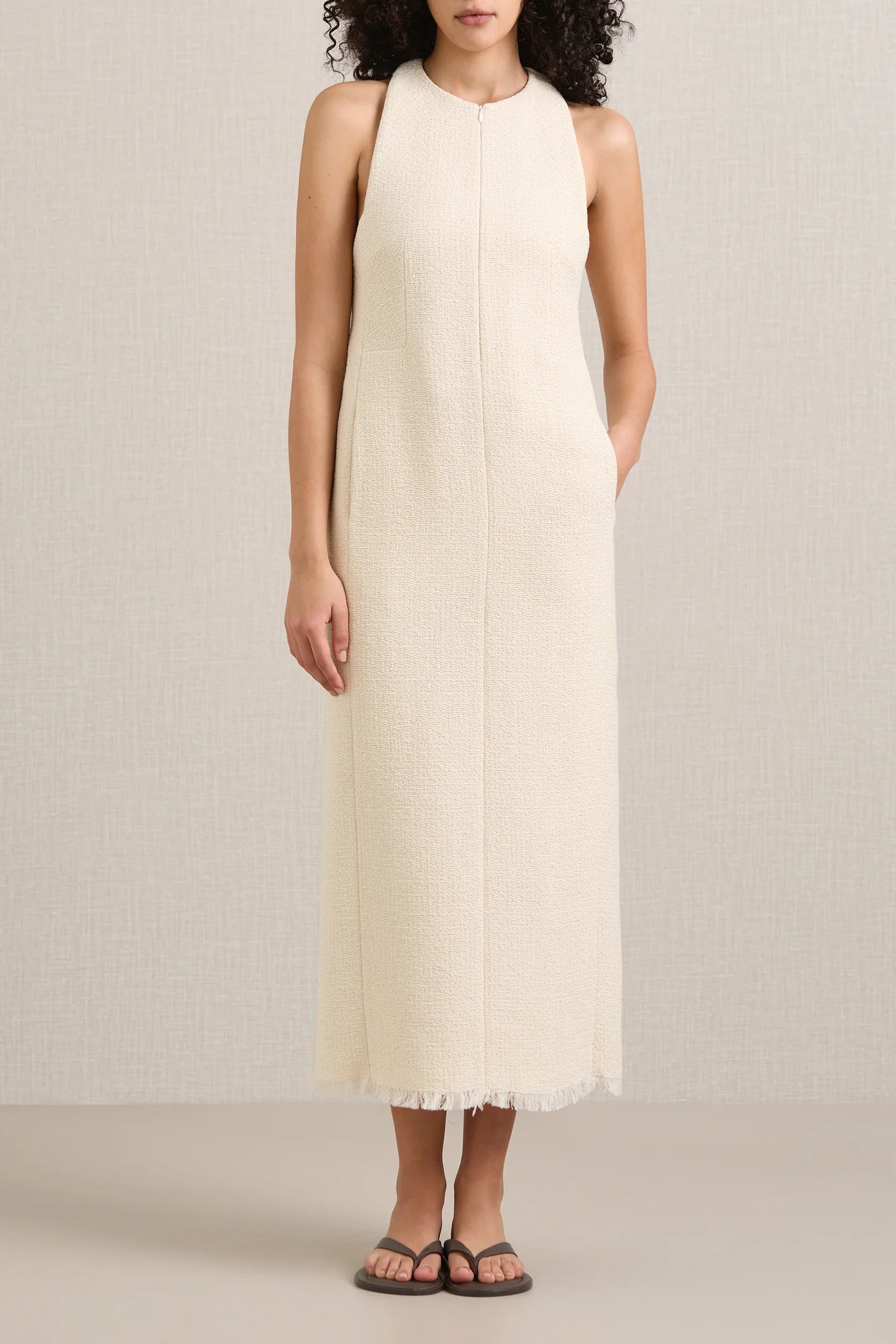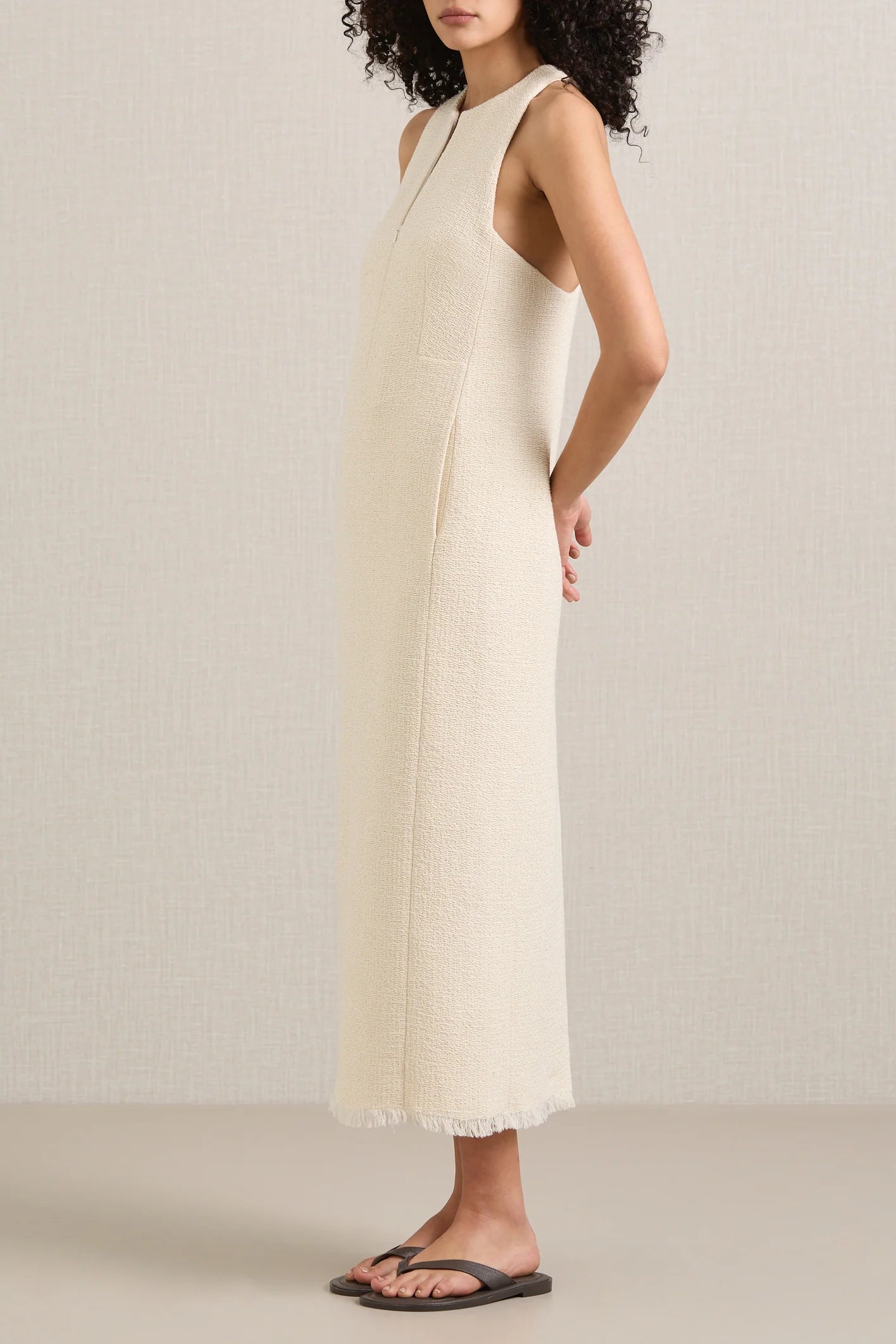 A Emery Avril Dress in Natural. Structured yet airy, the Avril Dress is crafted from heavyweight Italian cotton. Its flowing silhouette, adjustable invisible-zip neckline and raw hem bring texture and versatility. Perfect for layering or warmer days.