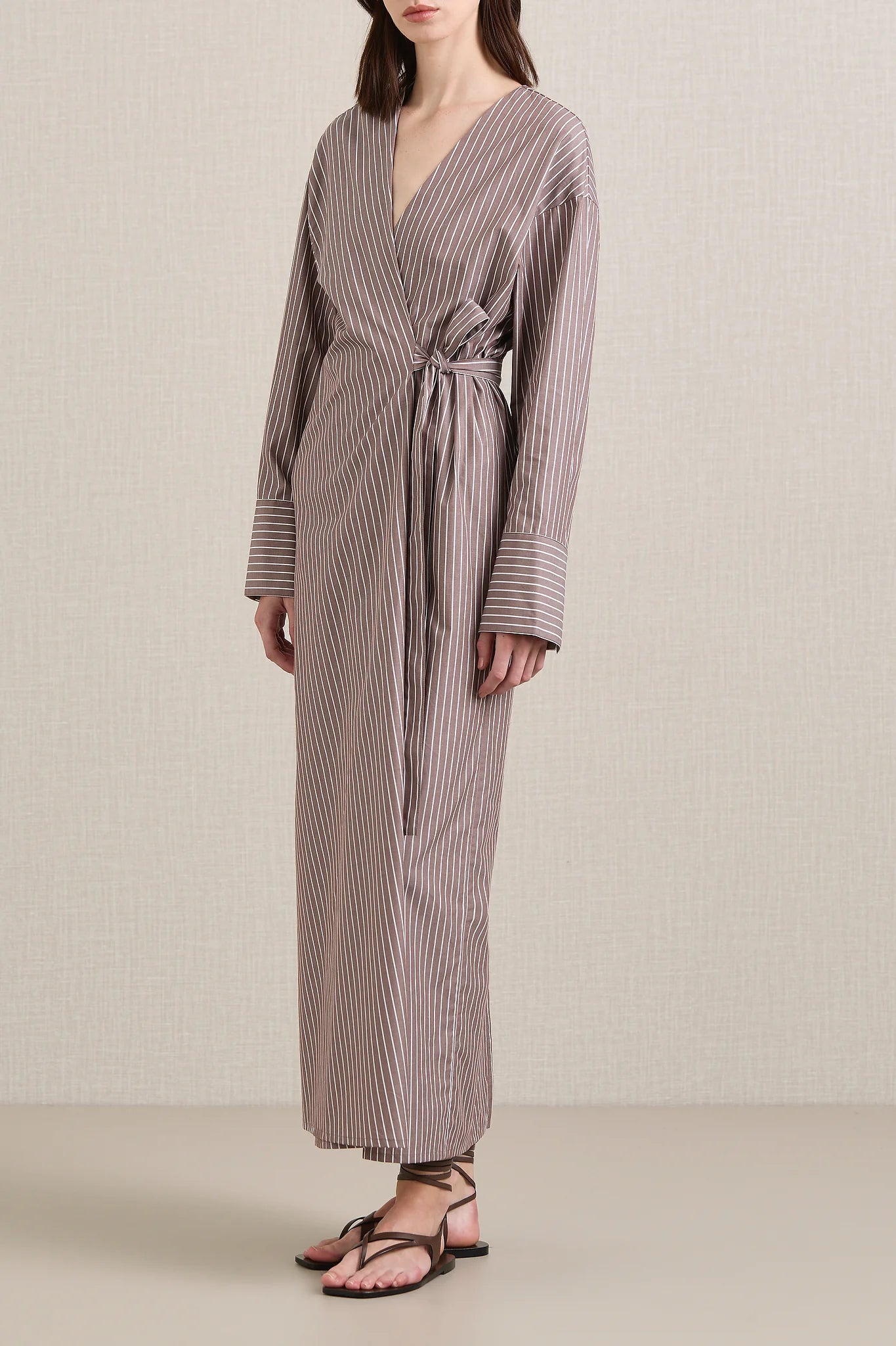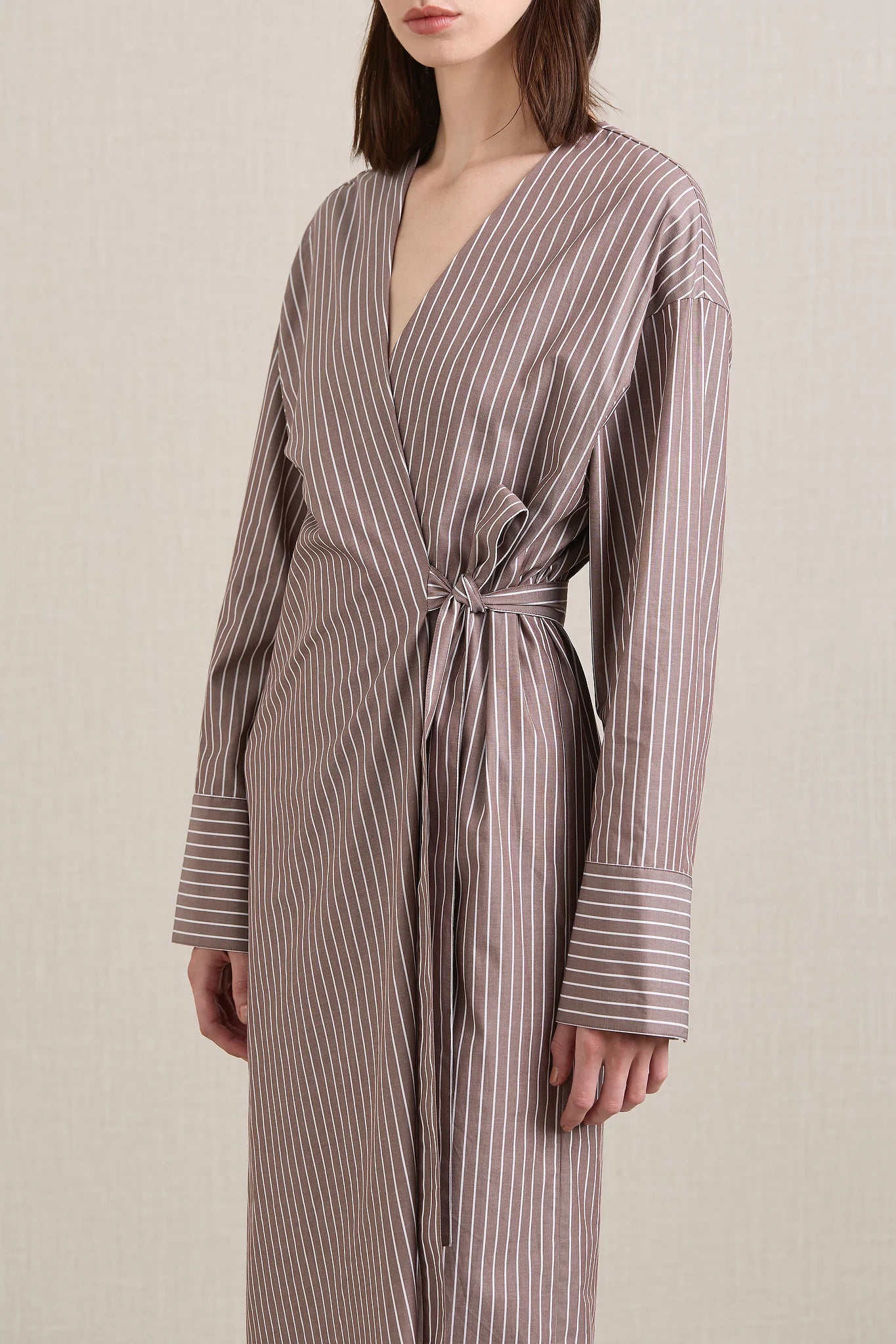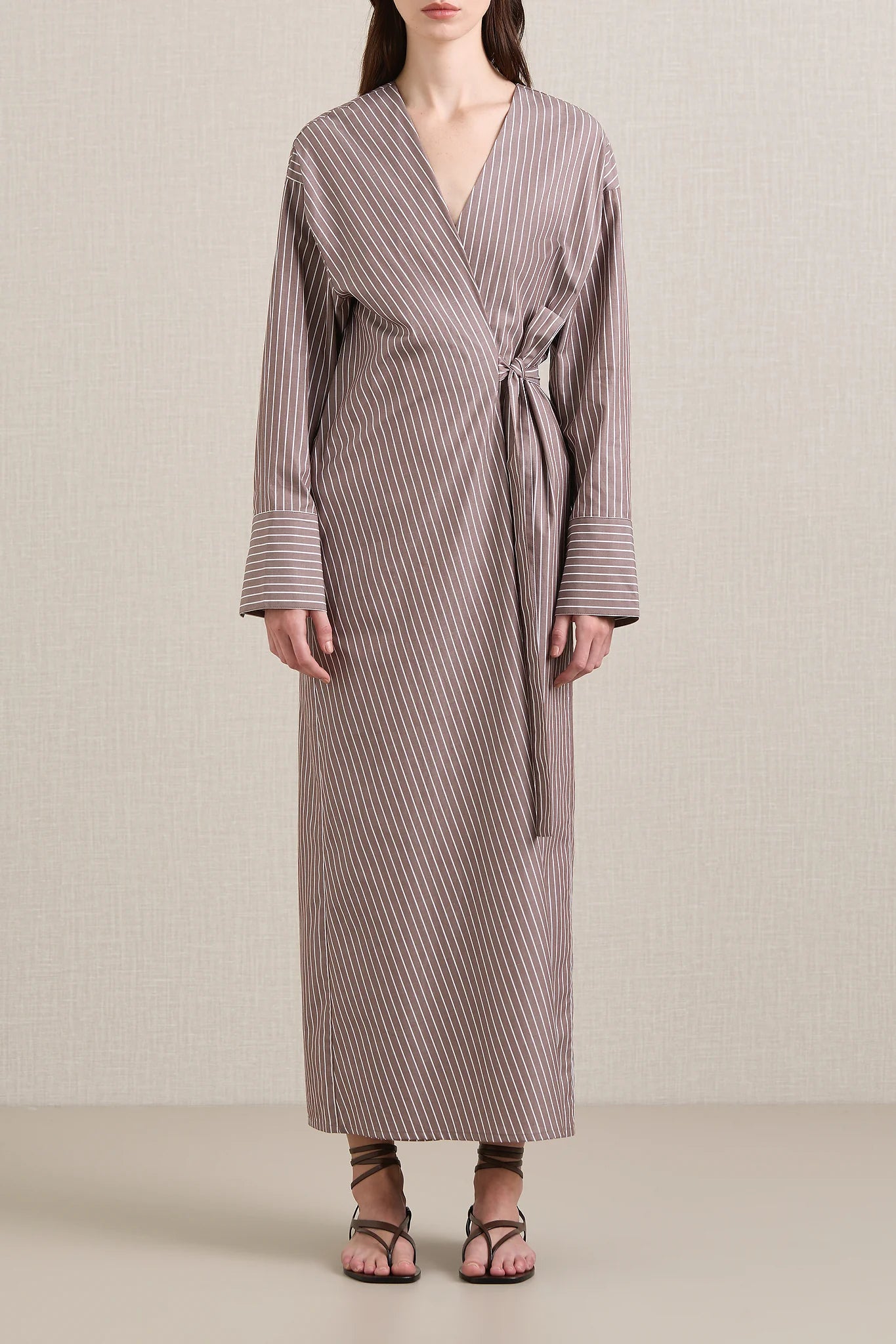 A Emery Huxem Dress in Mocha Stripe. The Huxem Dress is a midi wrap dress crafted from a crisp cotton shirting featuring an asymmetrical waist-tie and sizeable cuffs, combining structure with ease for a flattering summer style.