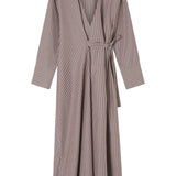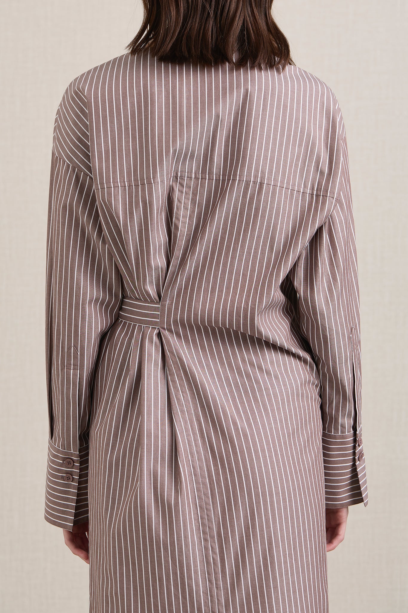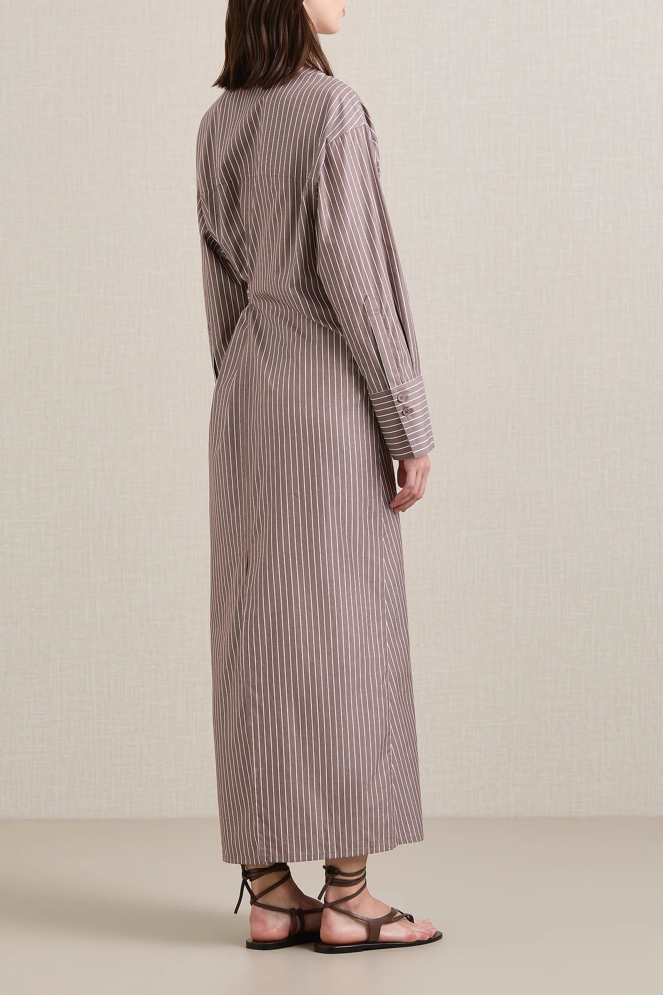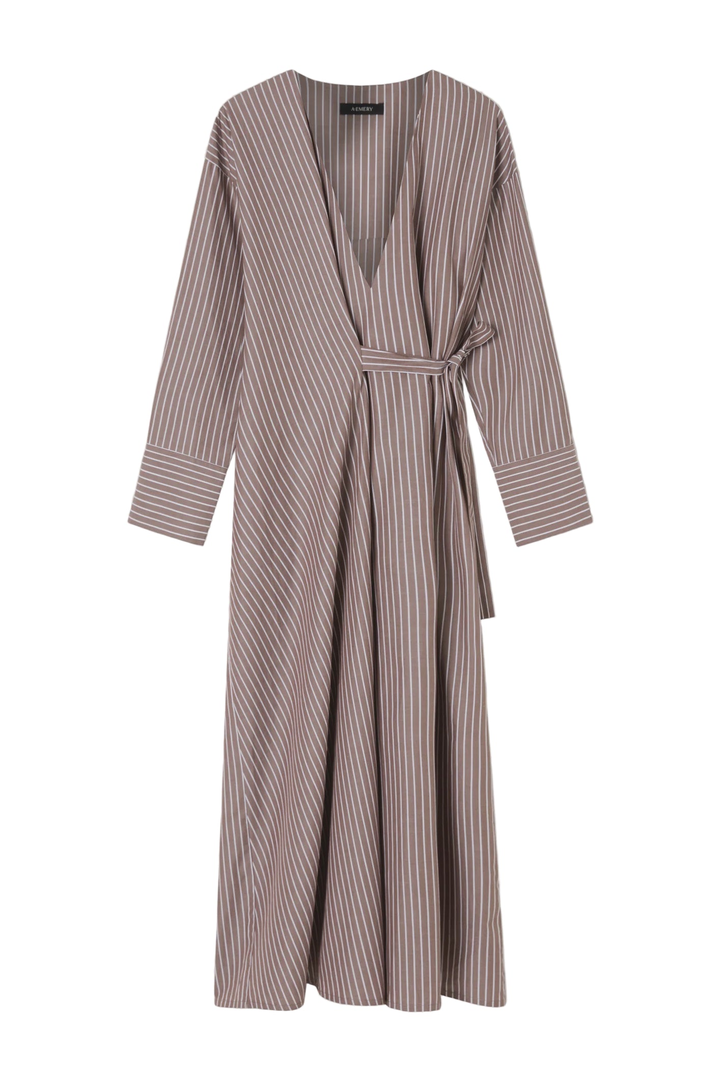 A Emery Huxem Dress in Mocha Stripe. The Huxem Dress is a midi wrap dress crafted from a crisp cotton shirting featuring an asymmetrical waist-tie and sizeable cuffs, combining structure with ease for a flattering summer style.