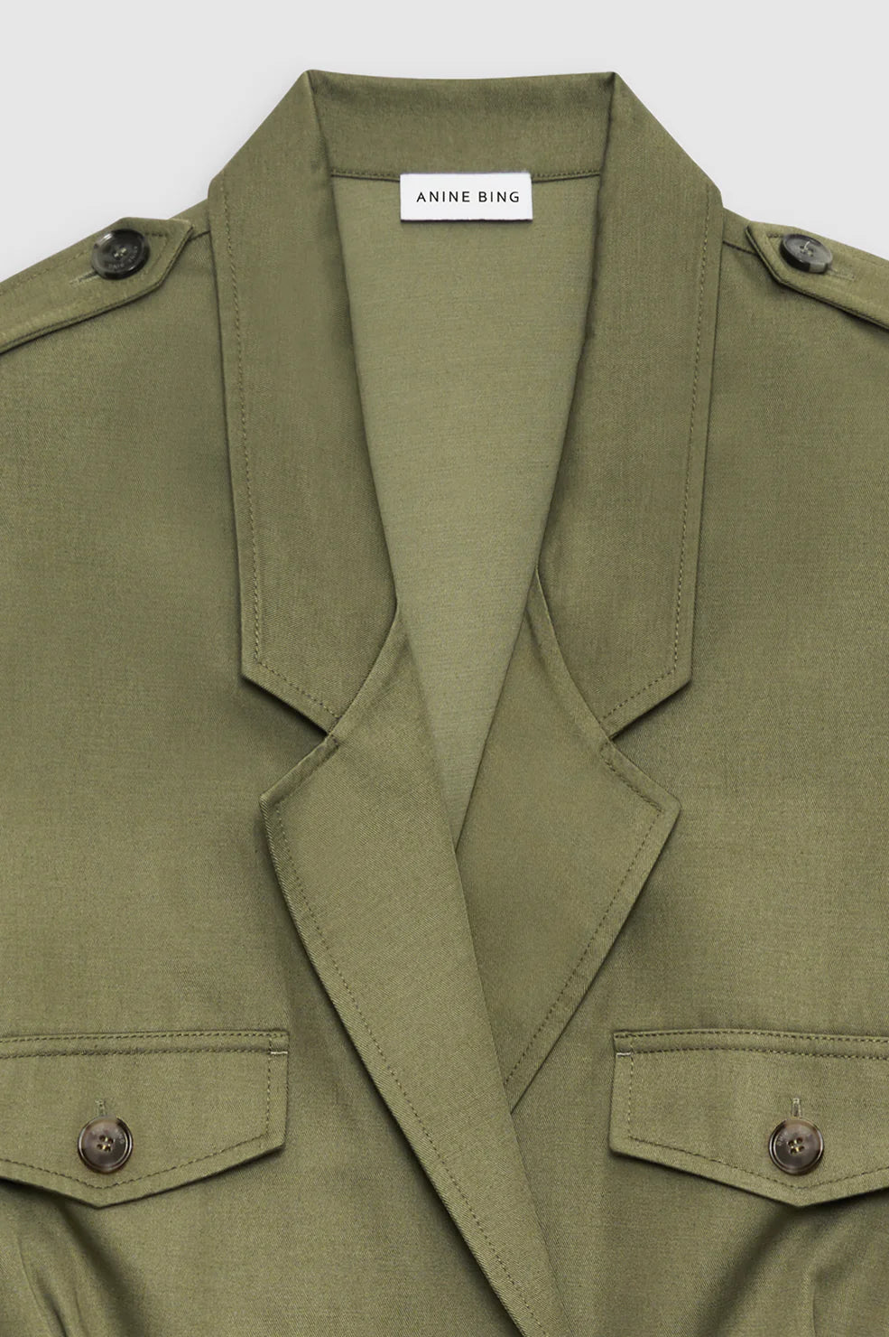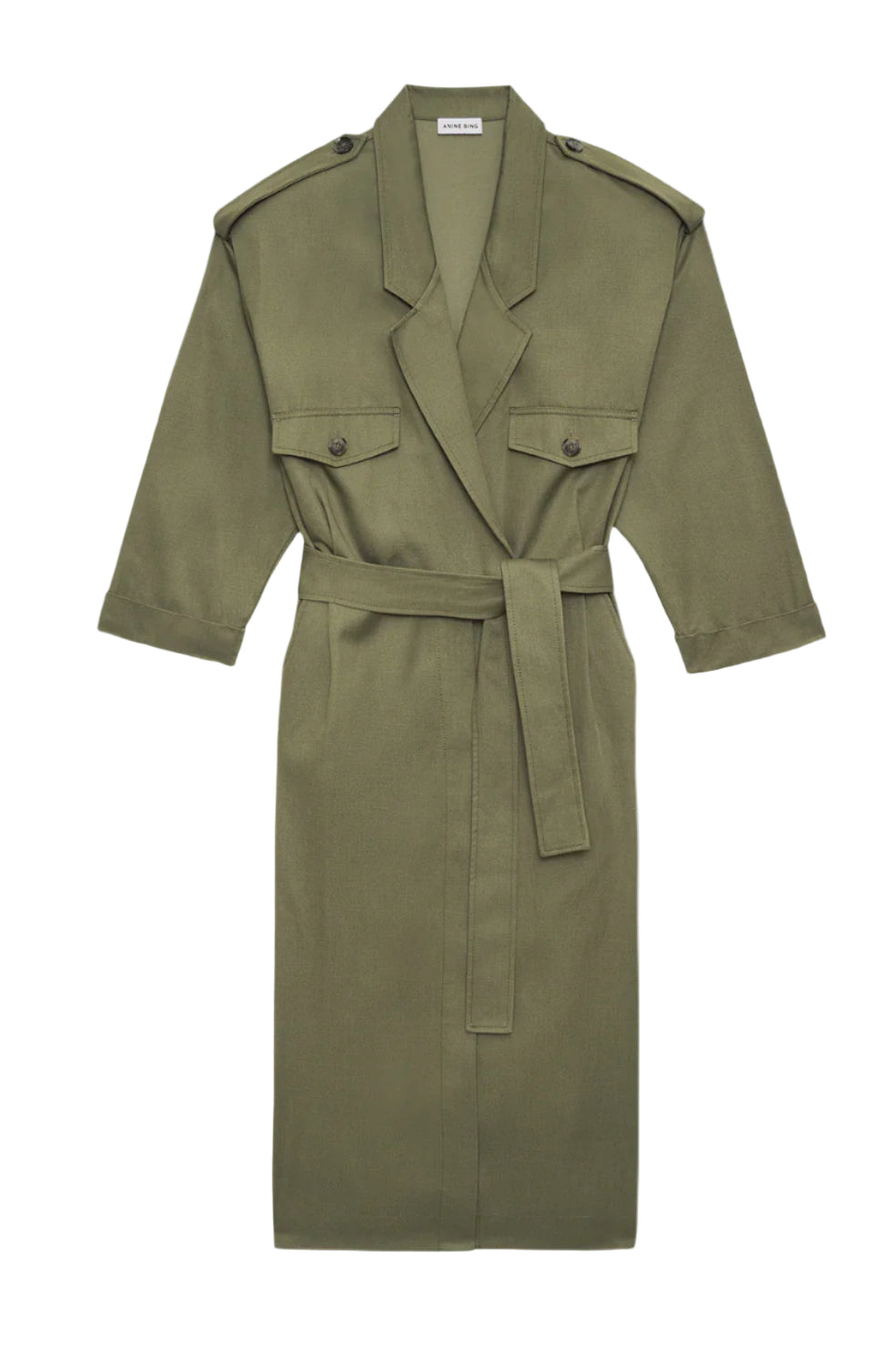 Anine Bing Zelda Dress in Olive. A utility-inspired statement dress crafted from a light-to-midweight cotton-twill blend. The Zelda Dress' tailored construction features notched lapels, epaulets, dropped shoulder seams, removable shoulder pads, and a fixed elasticated back waistband with belt loops. Complete with two functional patch pockets at the chest, slanted side pockets, folded and tacked sleeve cuffs, and a concealed button closure from the waist down.