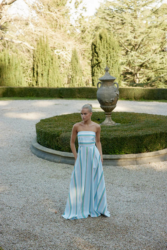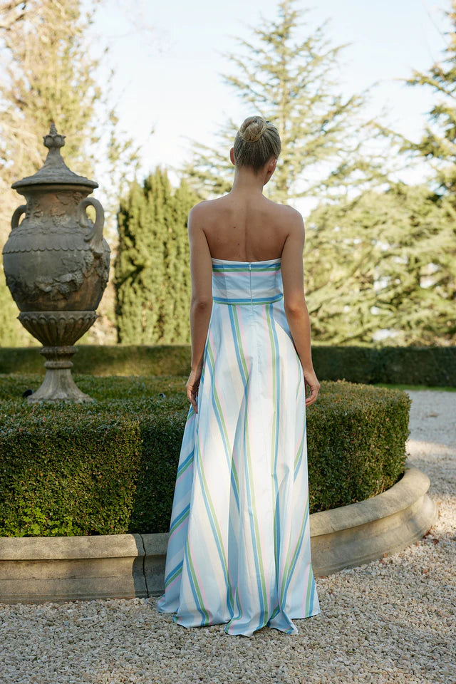 Aston Studio Hazel Dress in Baby Powder Stripe. Reimagined in our exclusive Baby/Powder Stripe, the Hazel Dress exudes timeless elegance. With its strapless neckline and voluminous circle skirt, this classic silhouette effortlessly moves from one occasion to the next, offering a refined balance of sophistication and versatility.