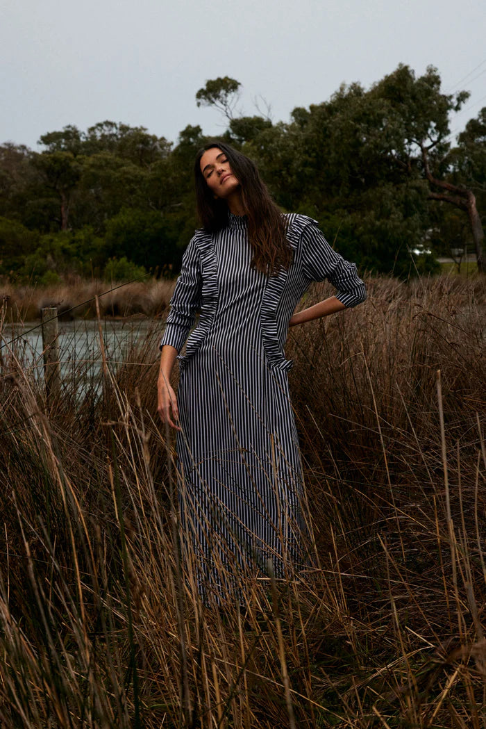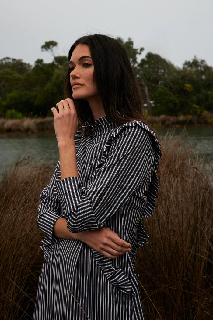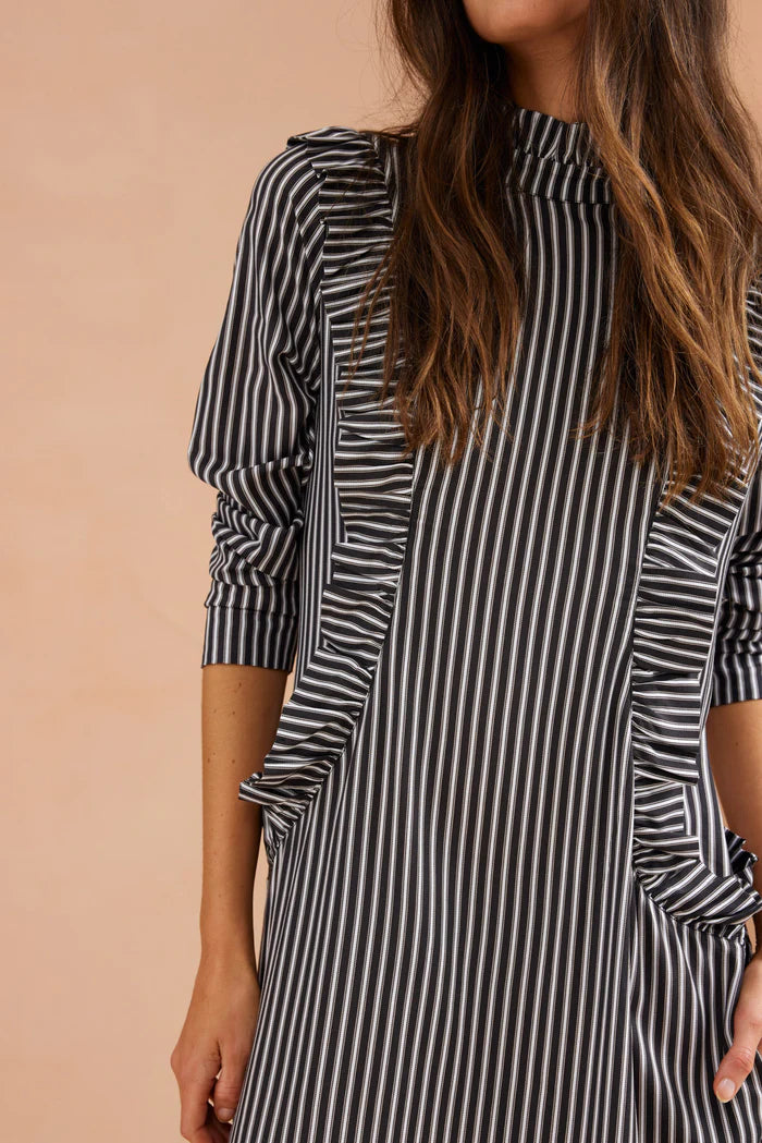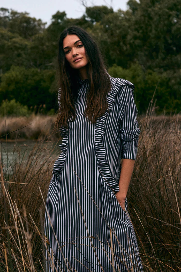 Binny Mrs Elly Stewart Dress. Classic, timeless, beautiful manners, guaranteed good times & a keeper. We're not just talking about the person this dress is named after. For days when you need to look like you’ve got your life together, with good chats & great ideas (without actually having to iron anything) Mrs Elly Stewart has your back. Literally. This stripey, matte viscose number zips up the back for easy escapes, and sports just the right amount of traditional ticking stripe & frill to suggest you’re both intelligent but very fun at parties.