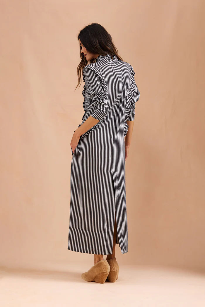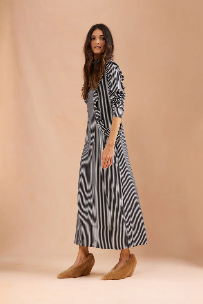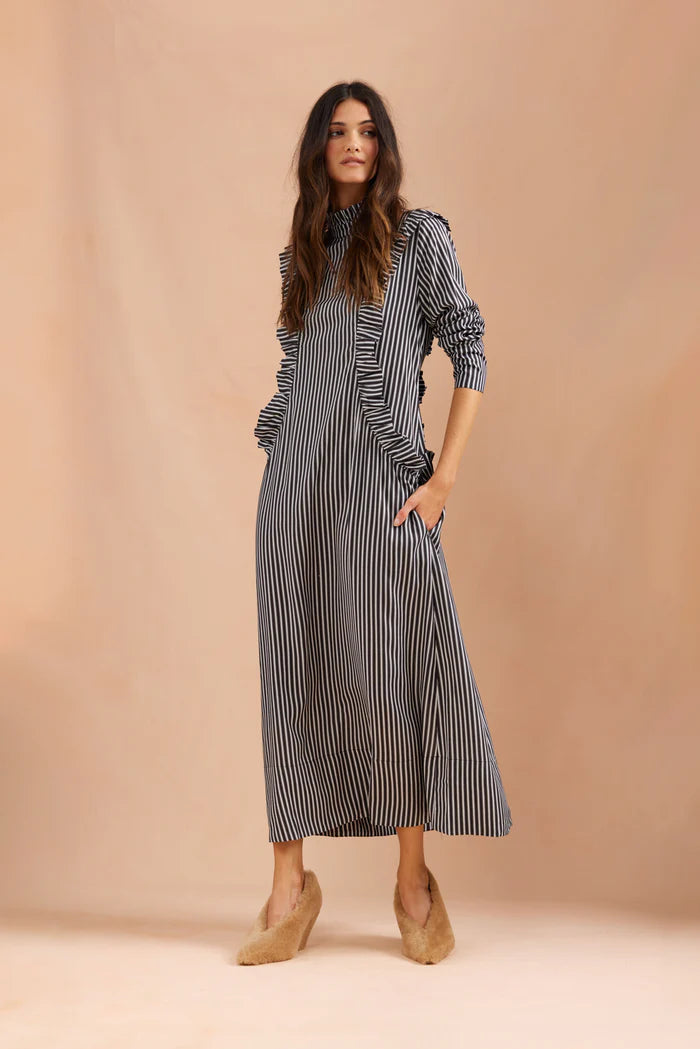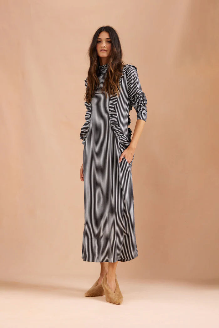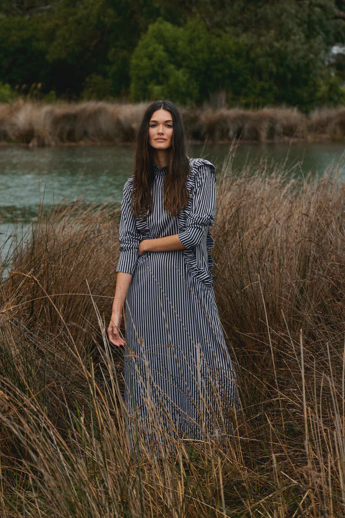 Binny Mrs Elly Stewart Dress. Classic, timeless, beautiful manners, guaranteed good times & a keeper. We're not just talking about the person this dress is named after. For days when you need to look like you’ve got your life together, with good chats & great ideas (without actually having to iron anything) Mrs Elly Stewart has your back. Literally. This stripey, matte viscose number zips up the back for easy escapes, and sports just the right amount of traditional ticking stripe & frill to suggest you’re both intelligent but very fun at parties.