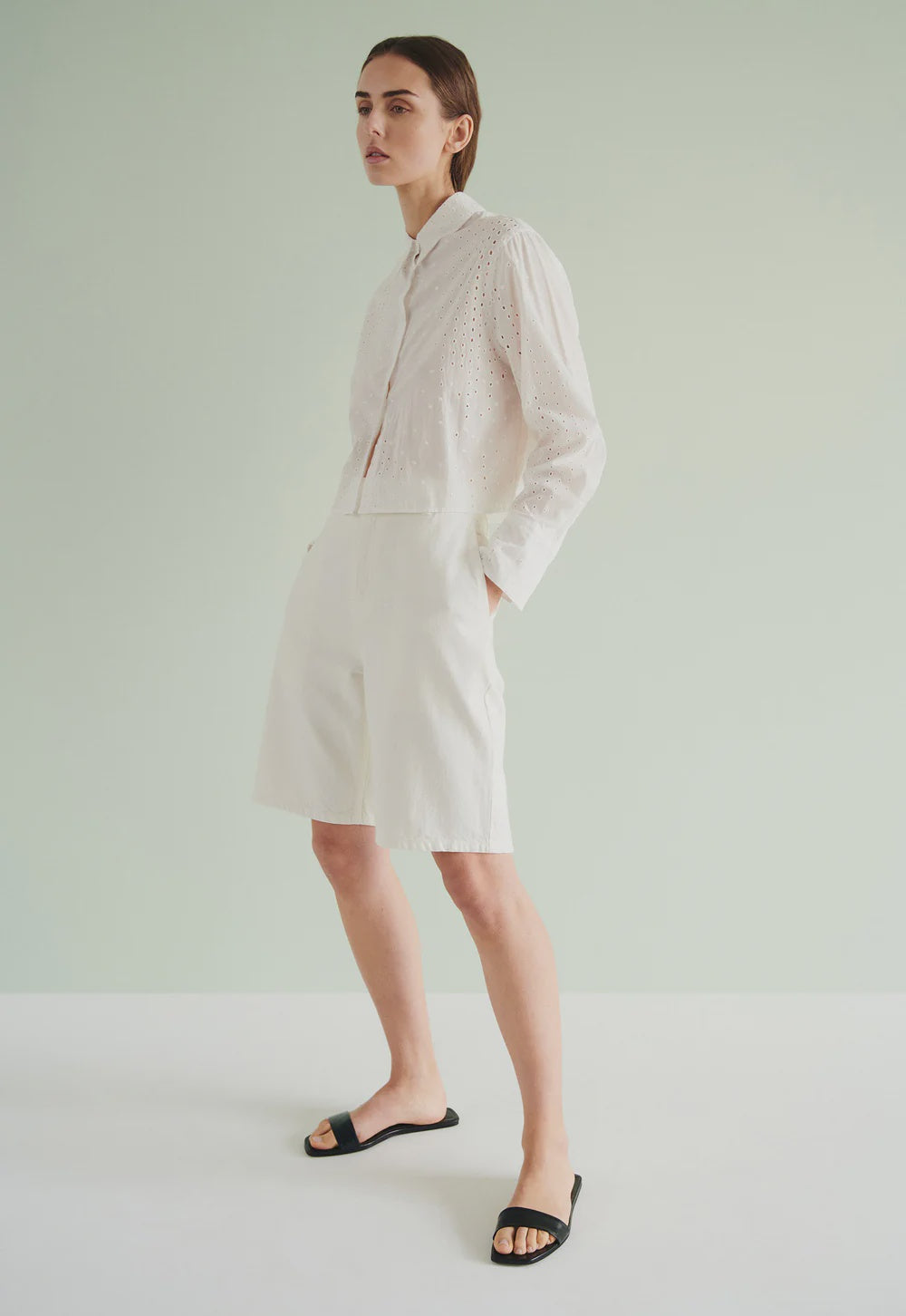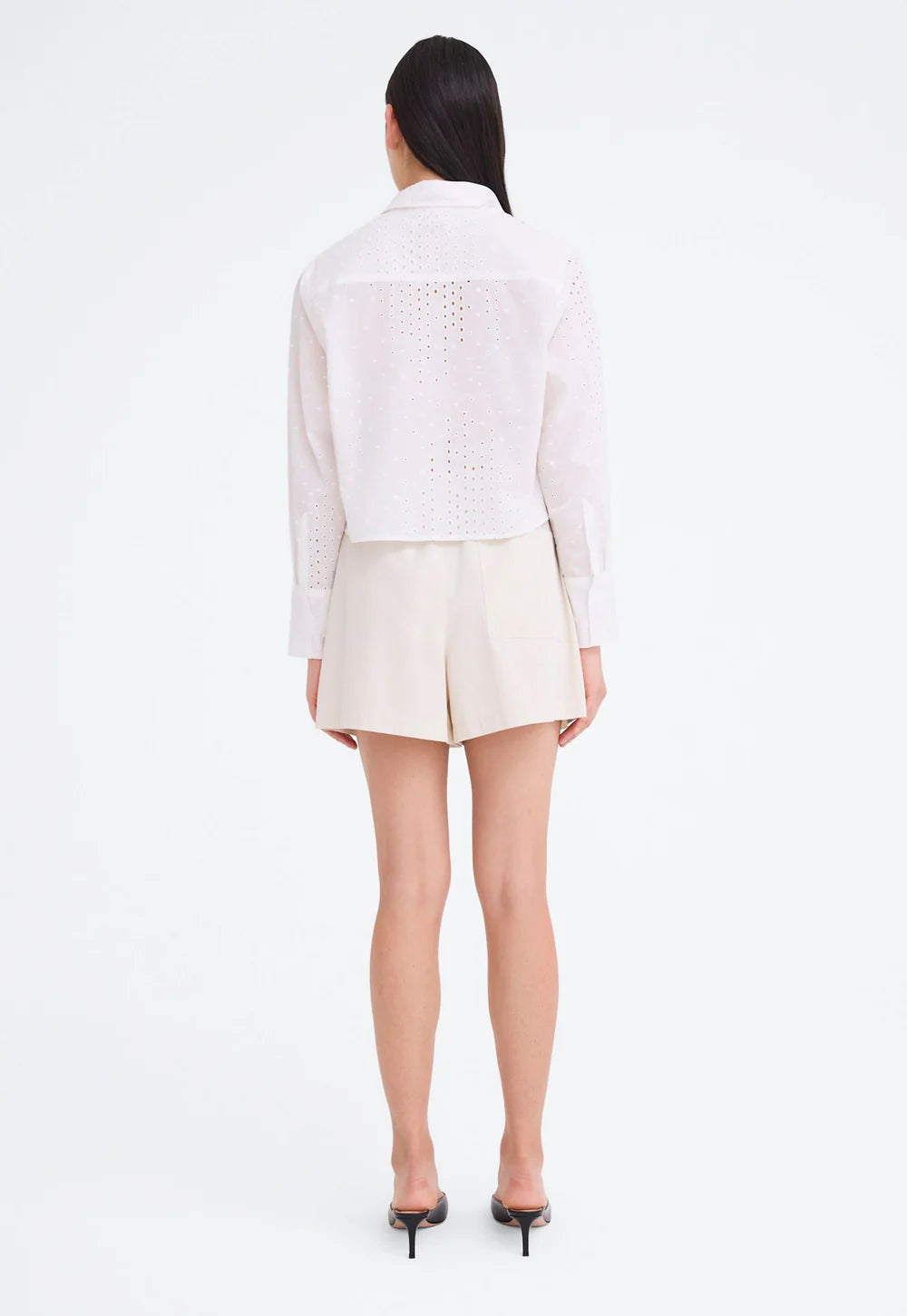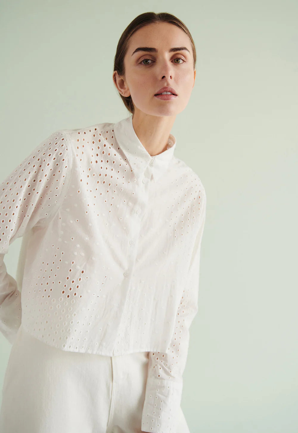 Jac and Jack Fenix Shirt in White. A modern update to the classic shirt. This cropped shirt is crafted in a bespoke broderie detailed cotton fabric. With a regular fit thourghout the body that falls to a cropped length, perfect with cotton shorts, a flared skirt or a dramatic wide leg trouser.