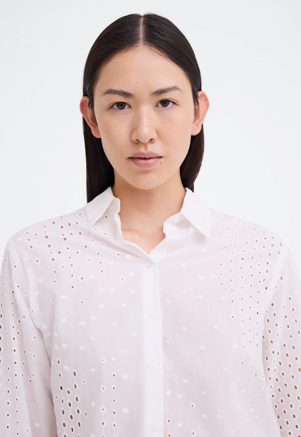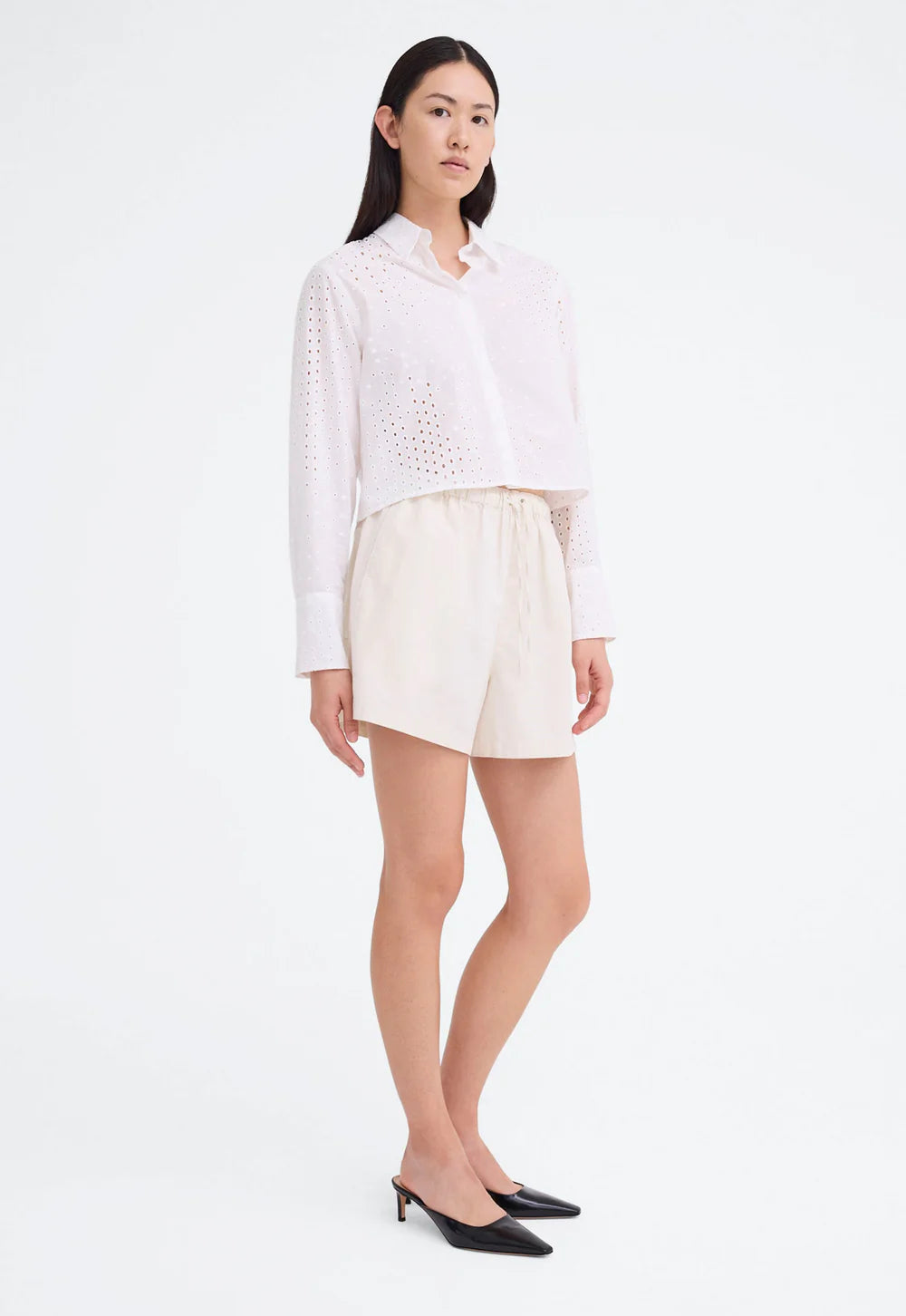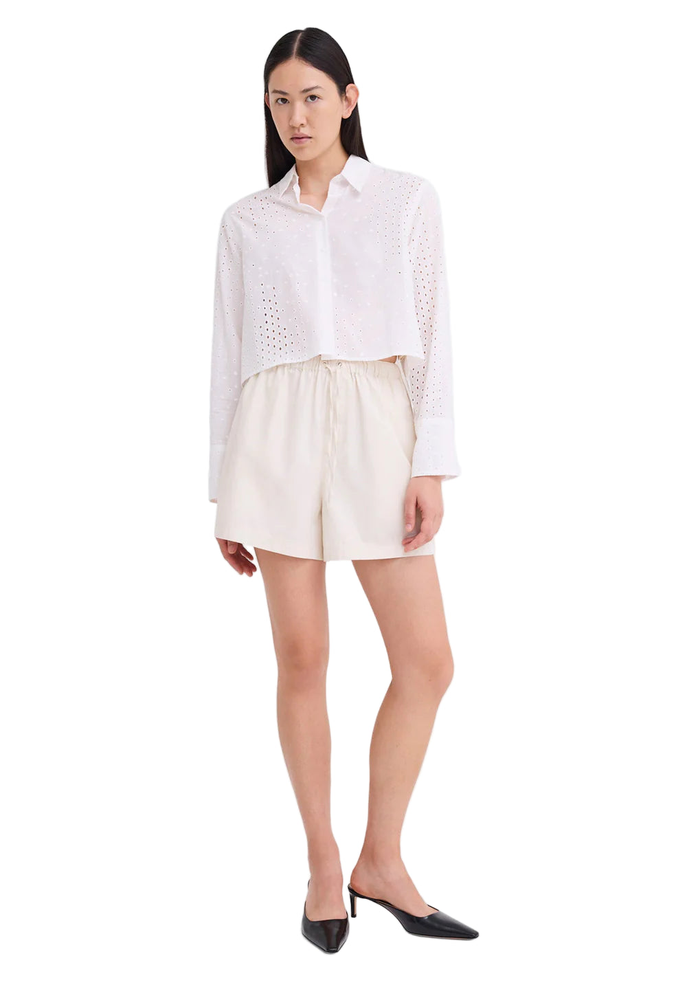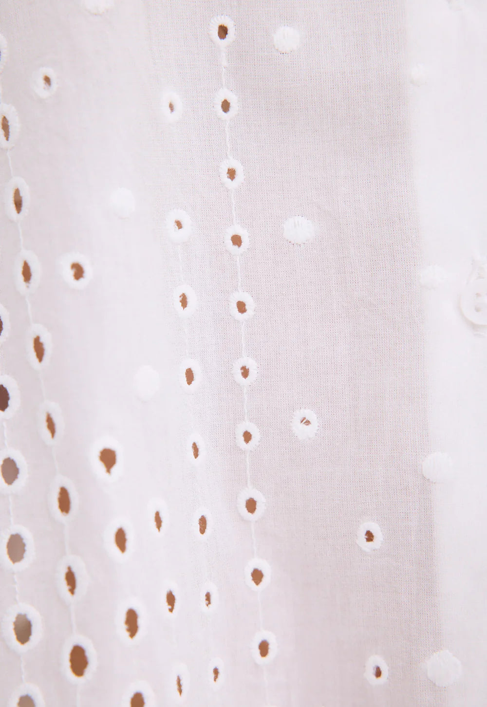 Jac and Jack Fenix Shirt in White. A modern update to the classic shirt. This cropped shirt is crafted in a bespoke broderie detailed cotton fabric. With a regular fit thourghout the body that falls to a cropped length, perfect with cotton shorts, a flared skirt or a dramatic wide leg trouser.