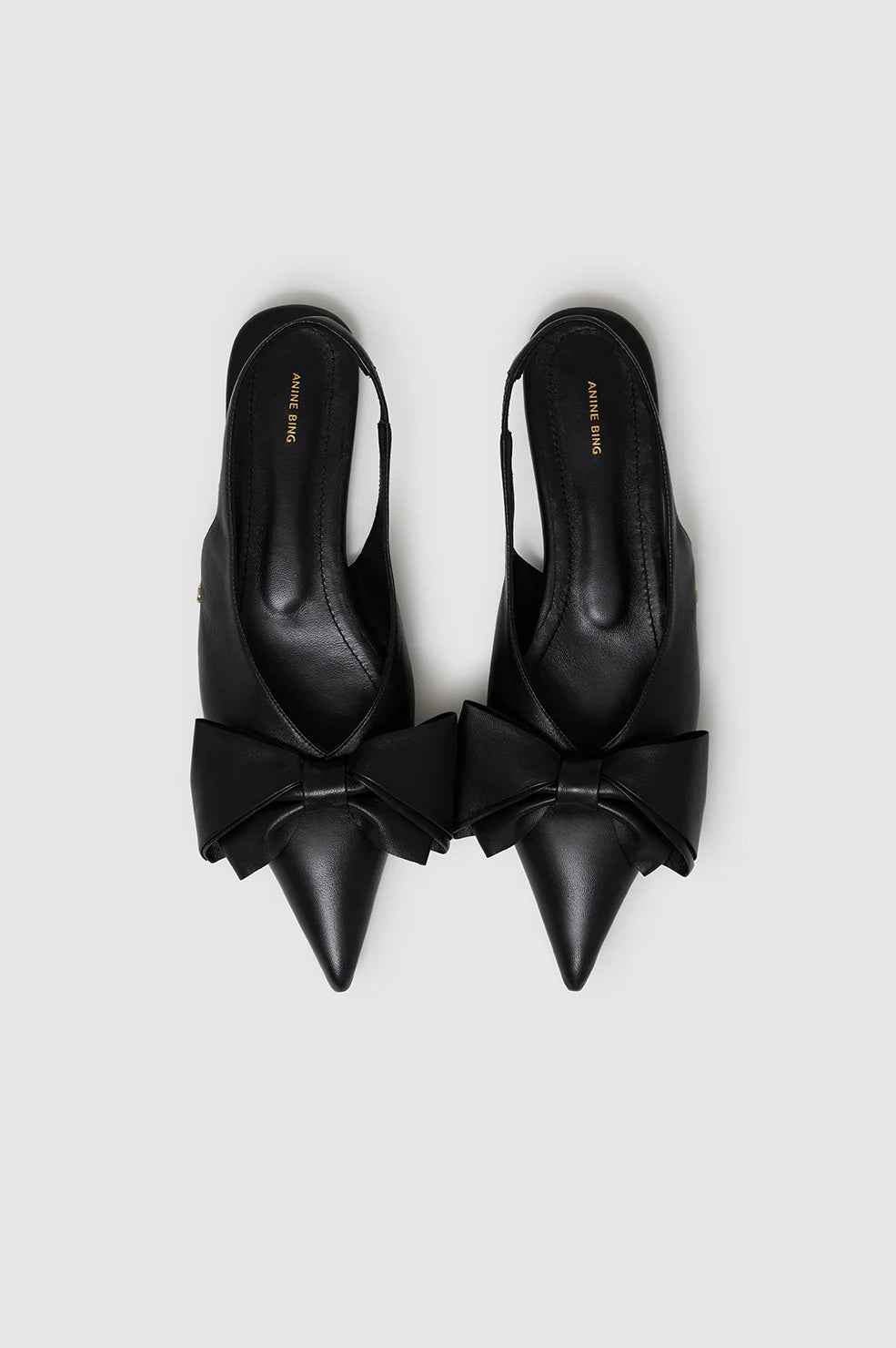 Anine Bing Nina Slingback Flats with Bow in Black. The statement-making Nina Slingback Flats are crafted from soft and smooth 100% Nappa leather with a matte finish. This feminine pair features an oversized leather bow, sharp pointed toe, and thin slingbacks with elastic to comfortably secure your foot. Finished with a padded insole and high-shine leather outsole. Accented with gold-tone ANINE BING hardware.