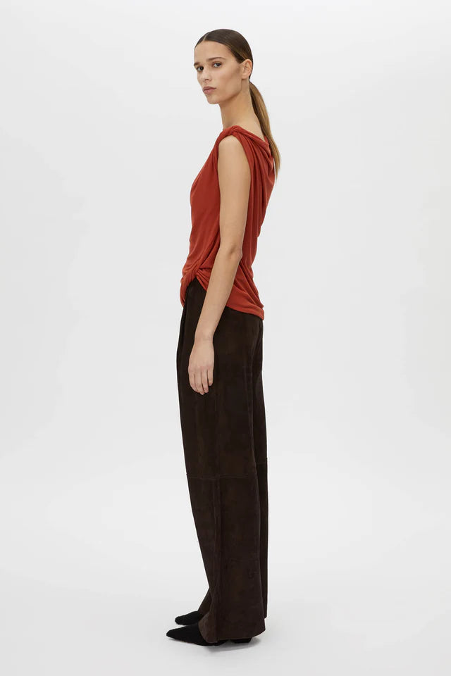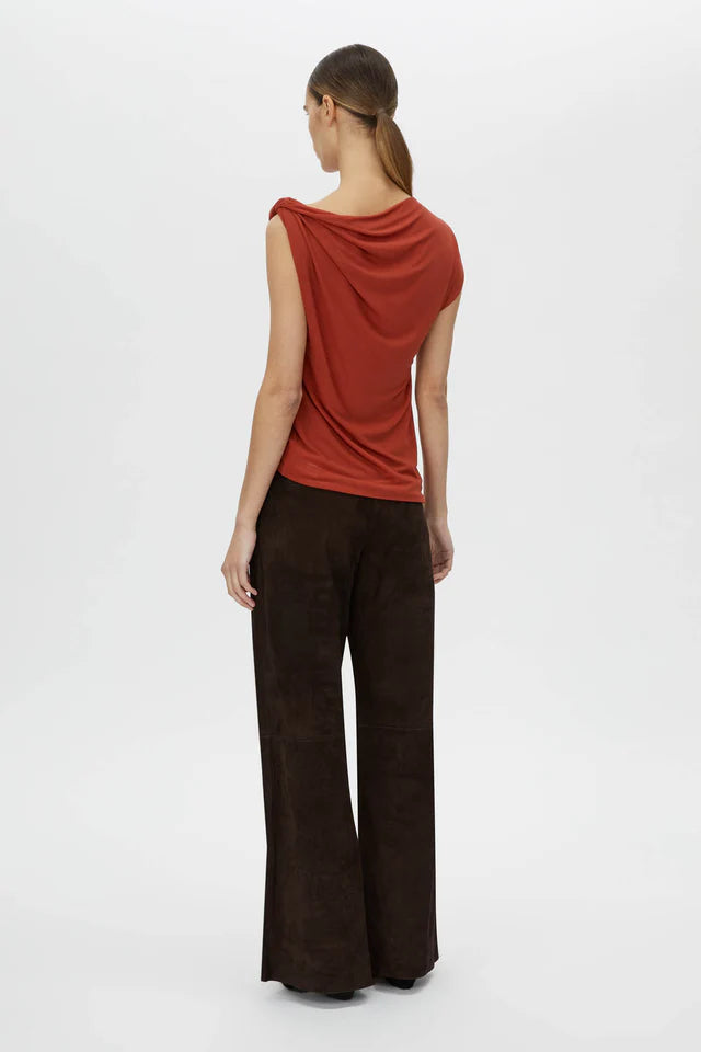 Camilla and Marc Ando Top in Terracotta. The Ando Top is a refined statement piece, featuring an off-shoulder mesh design with an asymmetric drape that twists gracefully over the hip and shoulder. A low scoop back neckline enhances its contemporary allure, while the draped yet fitted waistline flatters the silhouette effortlessly. Designed for versatility, this piece transitions seamlessly from day to evening with understated sophistication.