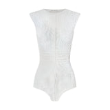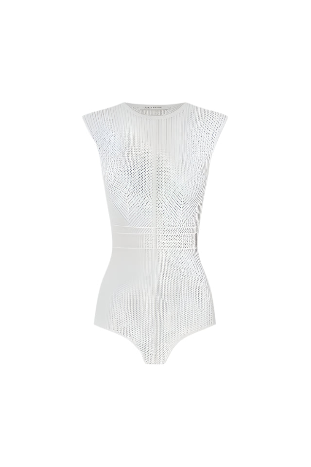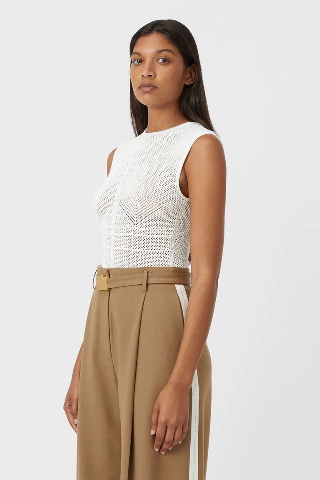 Camilla and Marc Anisia Bodysuit in White. The Anisia Bodysuit features a sleek sleeveless design with intricate tubular stitch detailing, adding a touch of sophistication to its minimalist style. Fashioning seams at the cups enhance its structured silhouette, offering both support and shape. The bodysuit is finished with a snap fastening at the gusset for convenience and comfort.