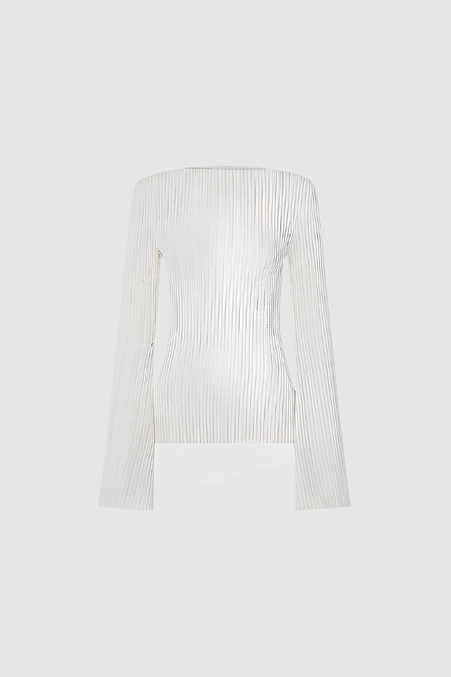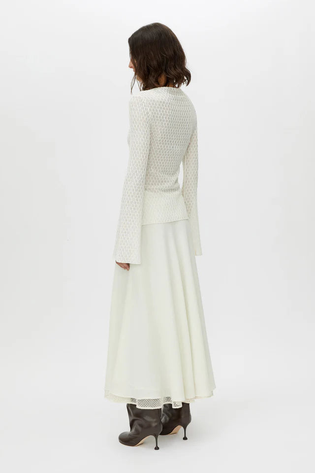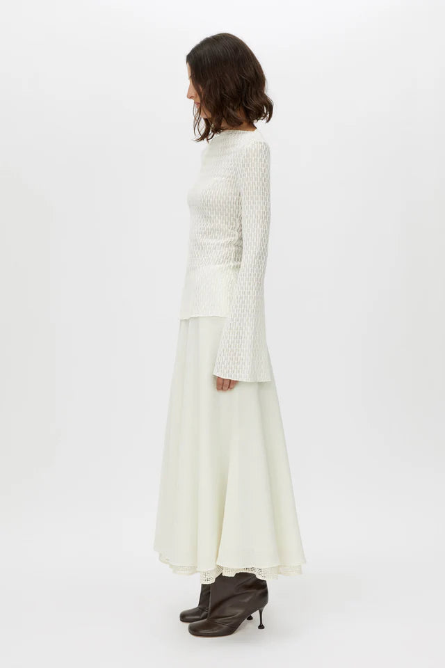 Camilla and Marc Davana Top in Cream. The Davana Top features flared long sleeves that add a touch of movement, perfect for creating an elegant silhouette. Designed for a close fit, it contours the body while maintaining comfort and ease of movement. The boat neckline and baby locked hem finish enhance its refined and contemporary look.