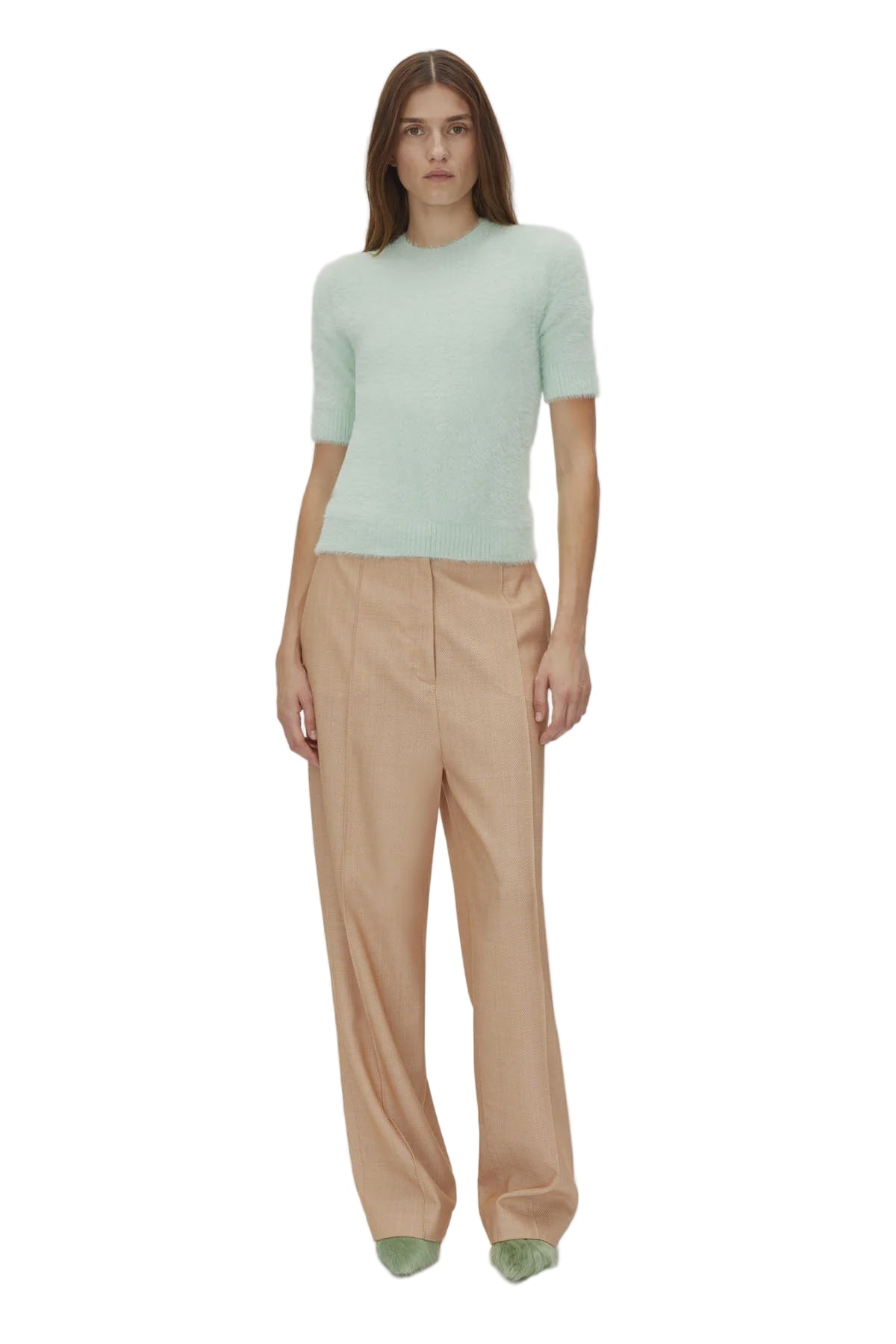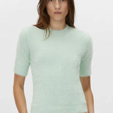 Camilla and Marc Maxime Top in Dusty Mint. The Maxime Top features a textured knit design, expertly crafted for a sleek, fitted silhouette. Its ribbed neckband, hem, and sleeve cuffs offer a refined finish and comfortable fit. Perfect for layering or wearing solo, this top combines style with versatility.