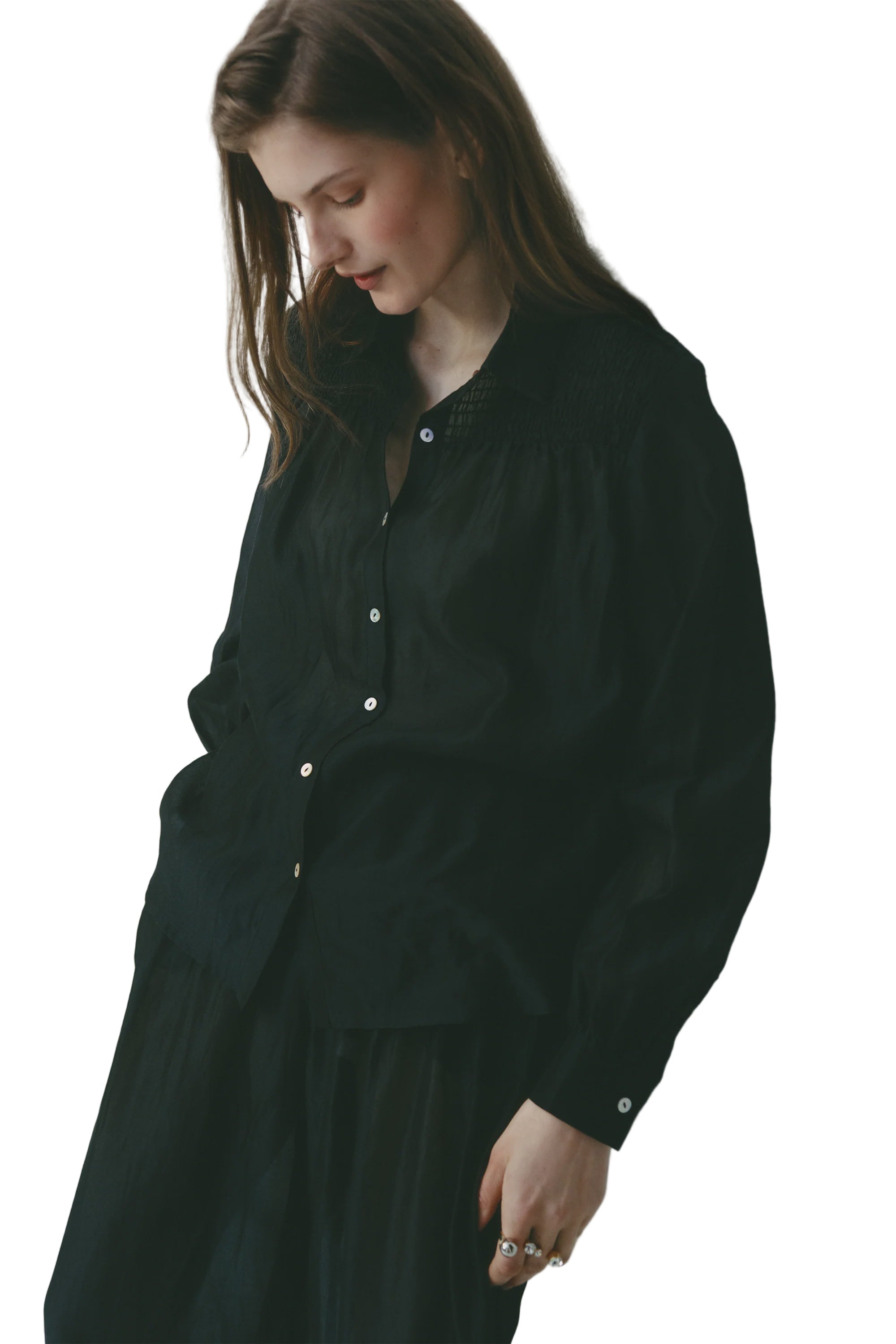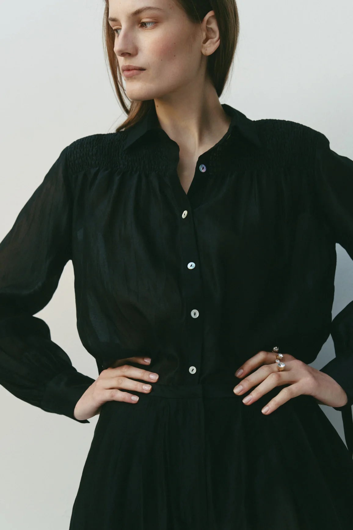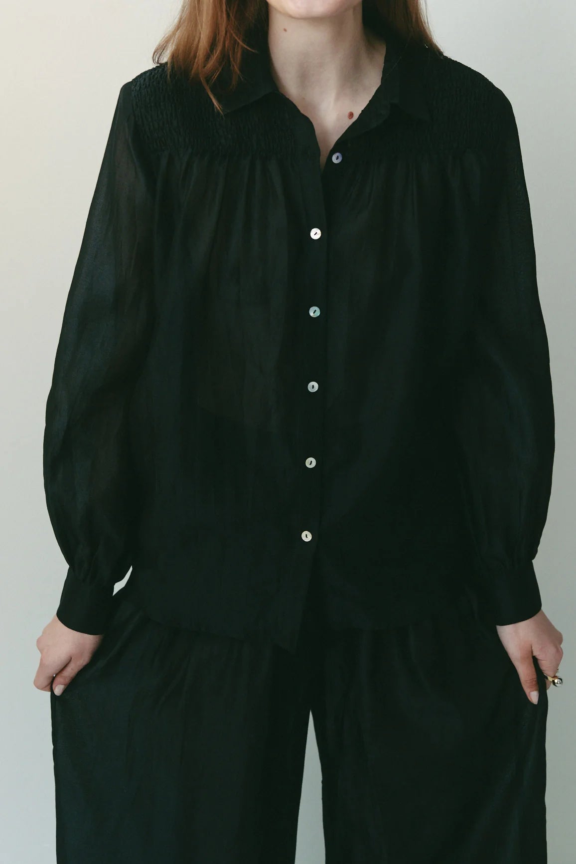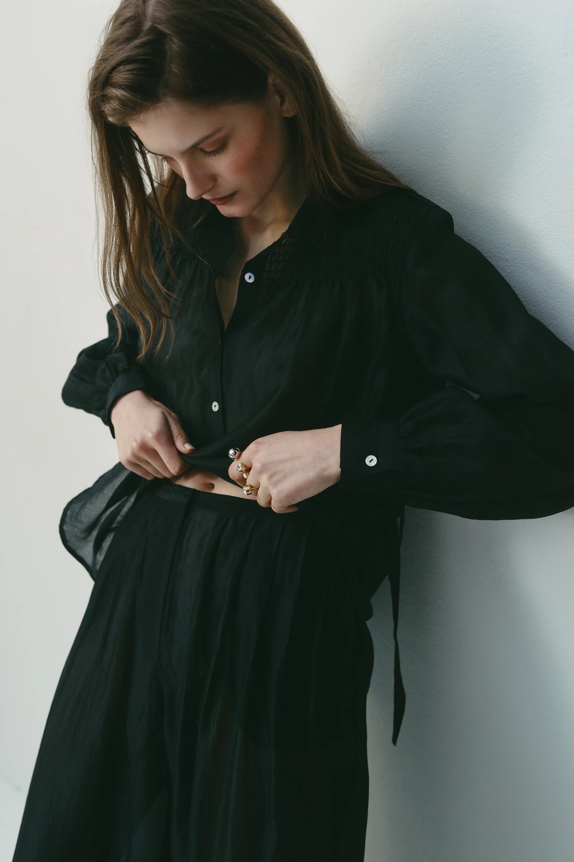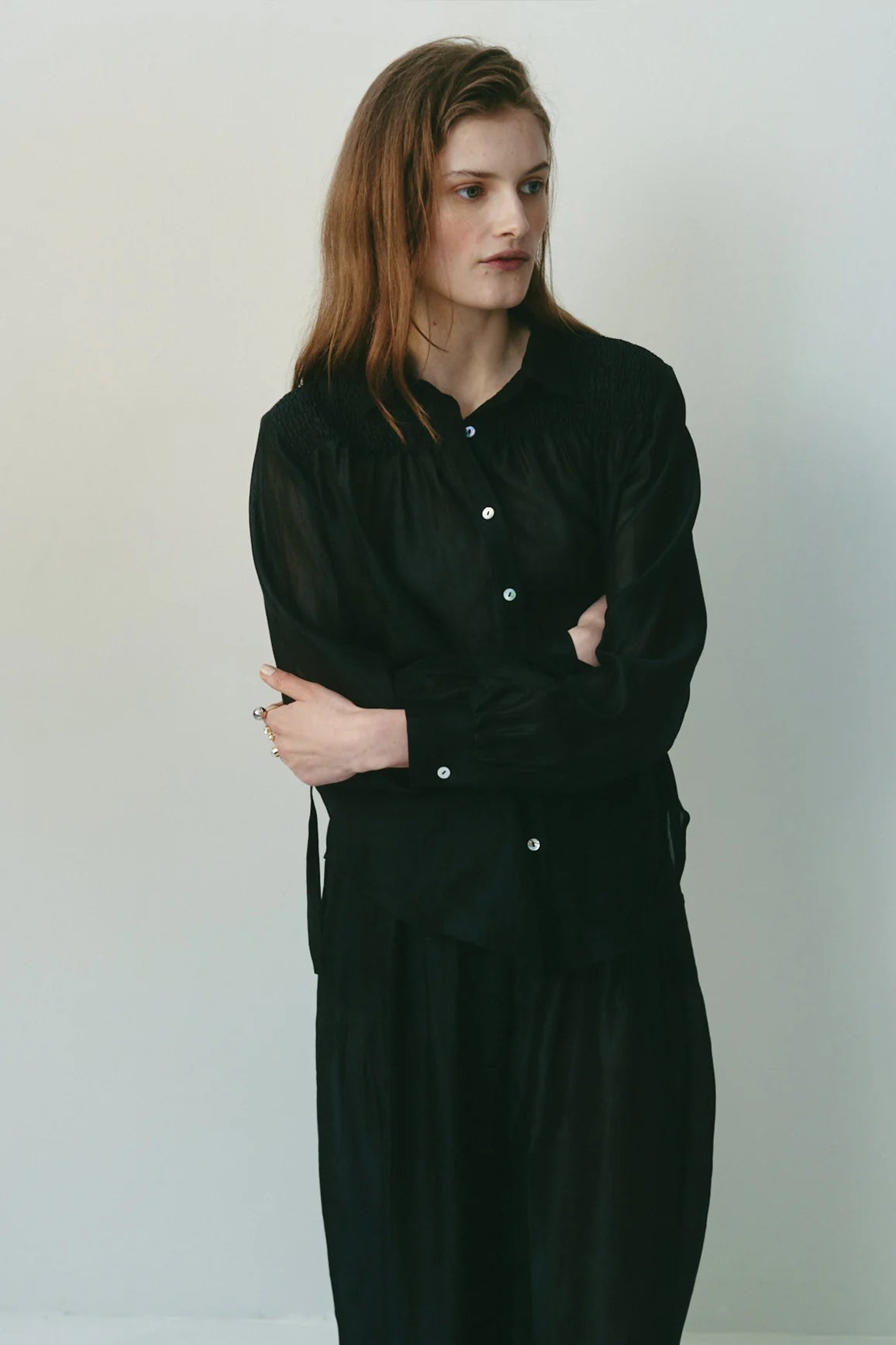 Sarah-Jane Clarke Monet Blouse in Ebony. The Monet Blouse is cut in a semi sheer silk cotton voile. Featuring a classic collar, shirring detail at front and back yoke, long line curved hem and self tie belt.