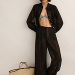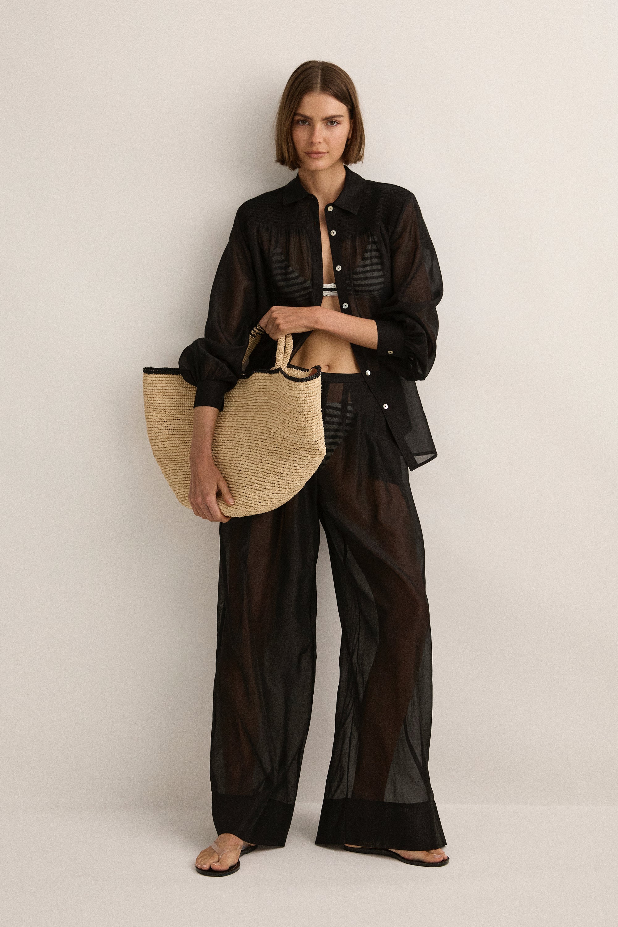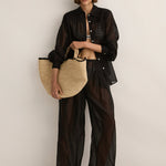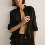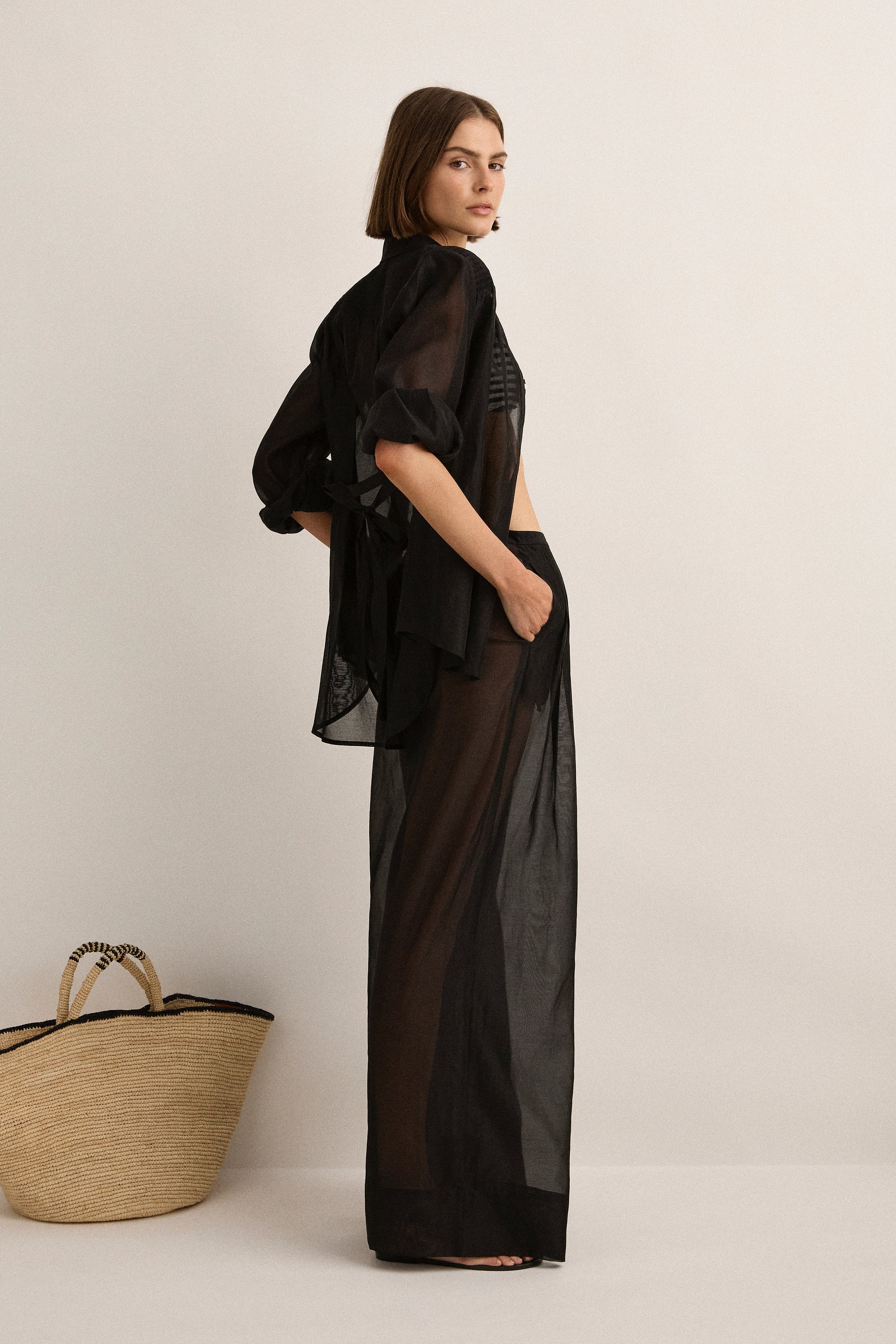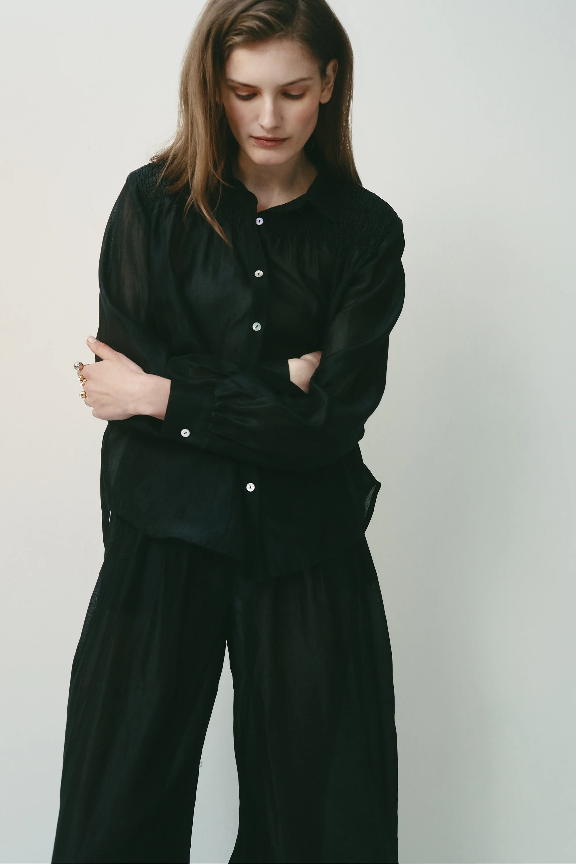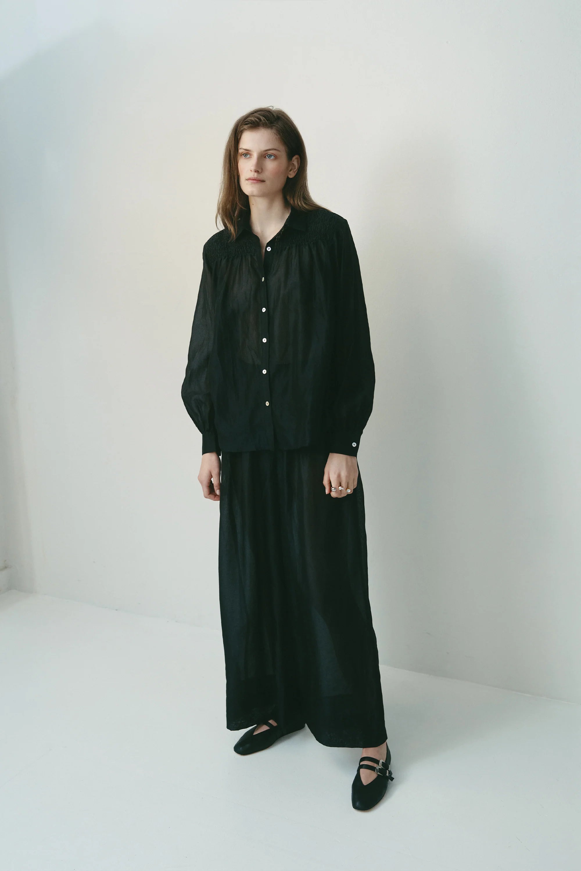Sarah-Jane Clarke Monet Blouse in Ebony. The Monet Blouse is cut in a semi sheer silk cotton voile. Featuring a classic collar, shirring detail at front and back yoke, long line curved hem and self tie belt.