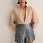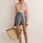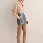 Sarah-Jane Clarke Eos Short in Metallic Silver. The Eos Shorts are cut in an Italian Metallic Blend Cloth. Featuring a flat front, curved hem and elasticated waist at back