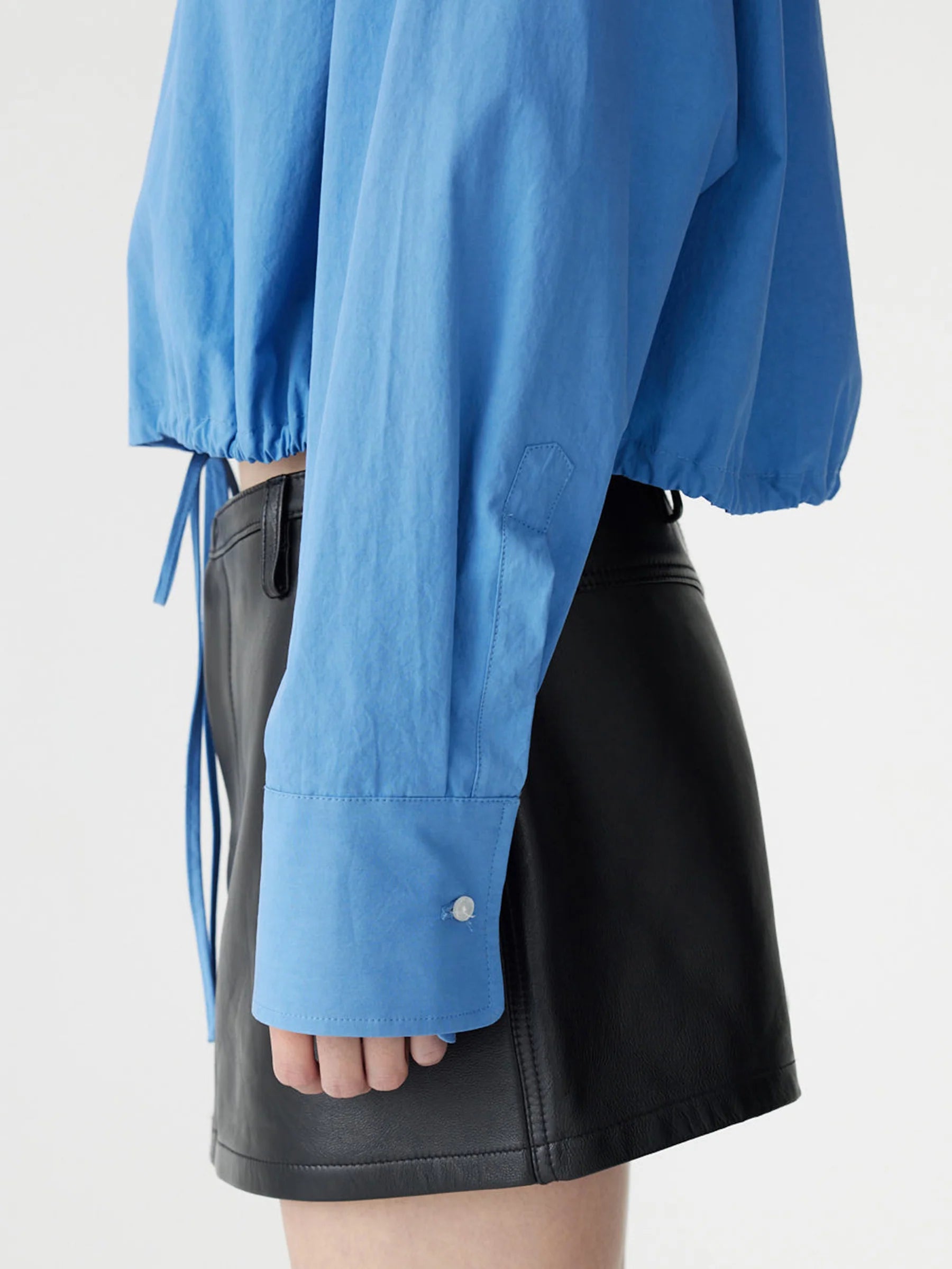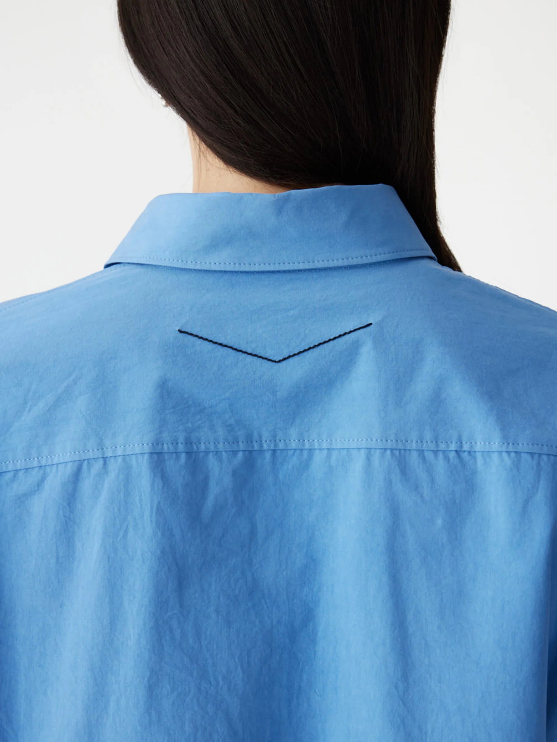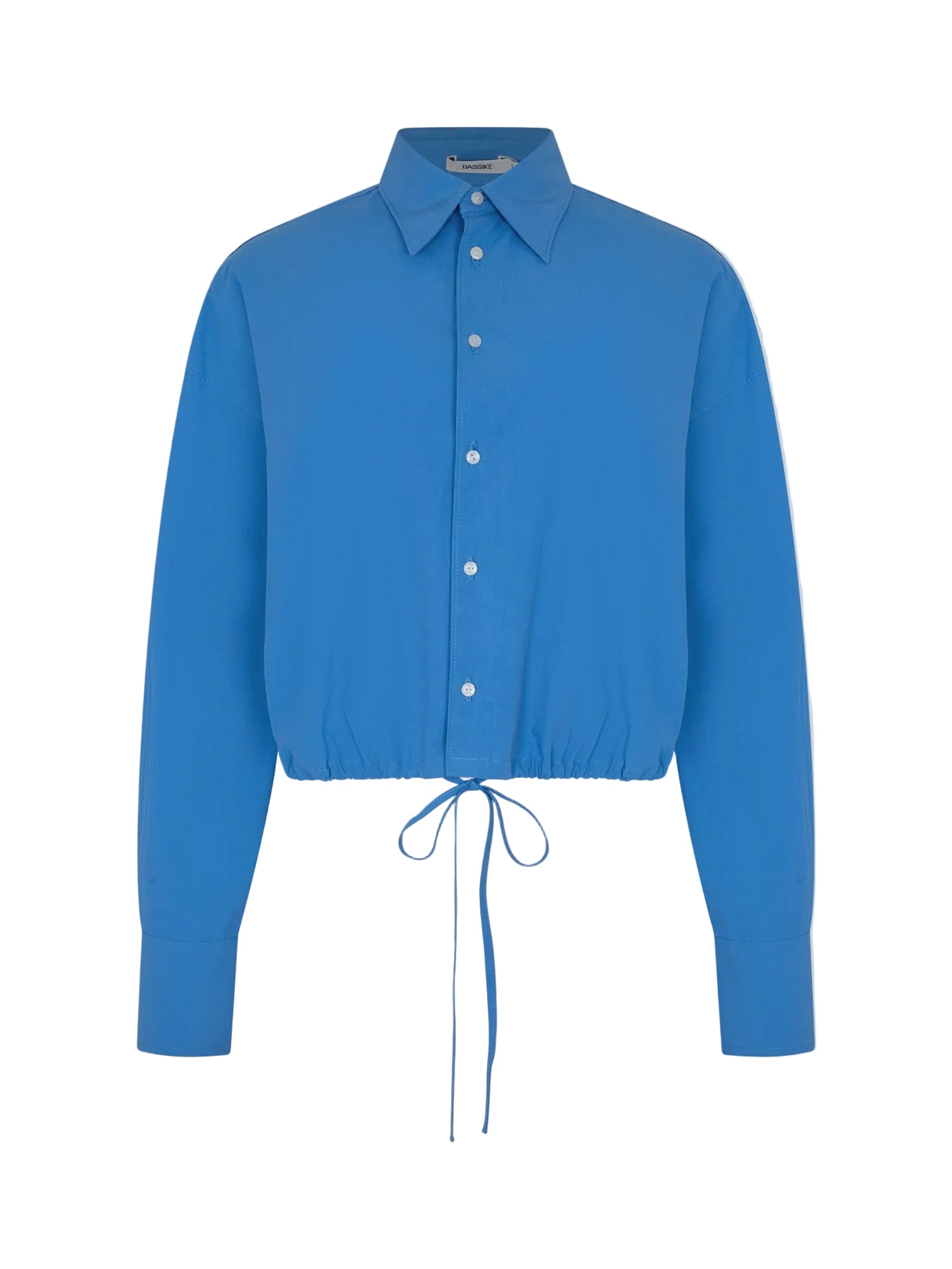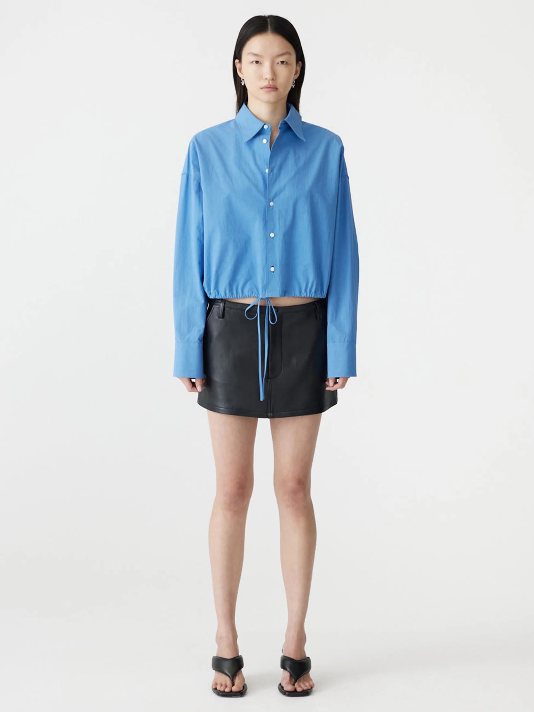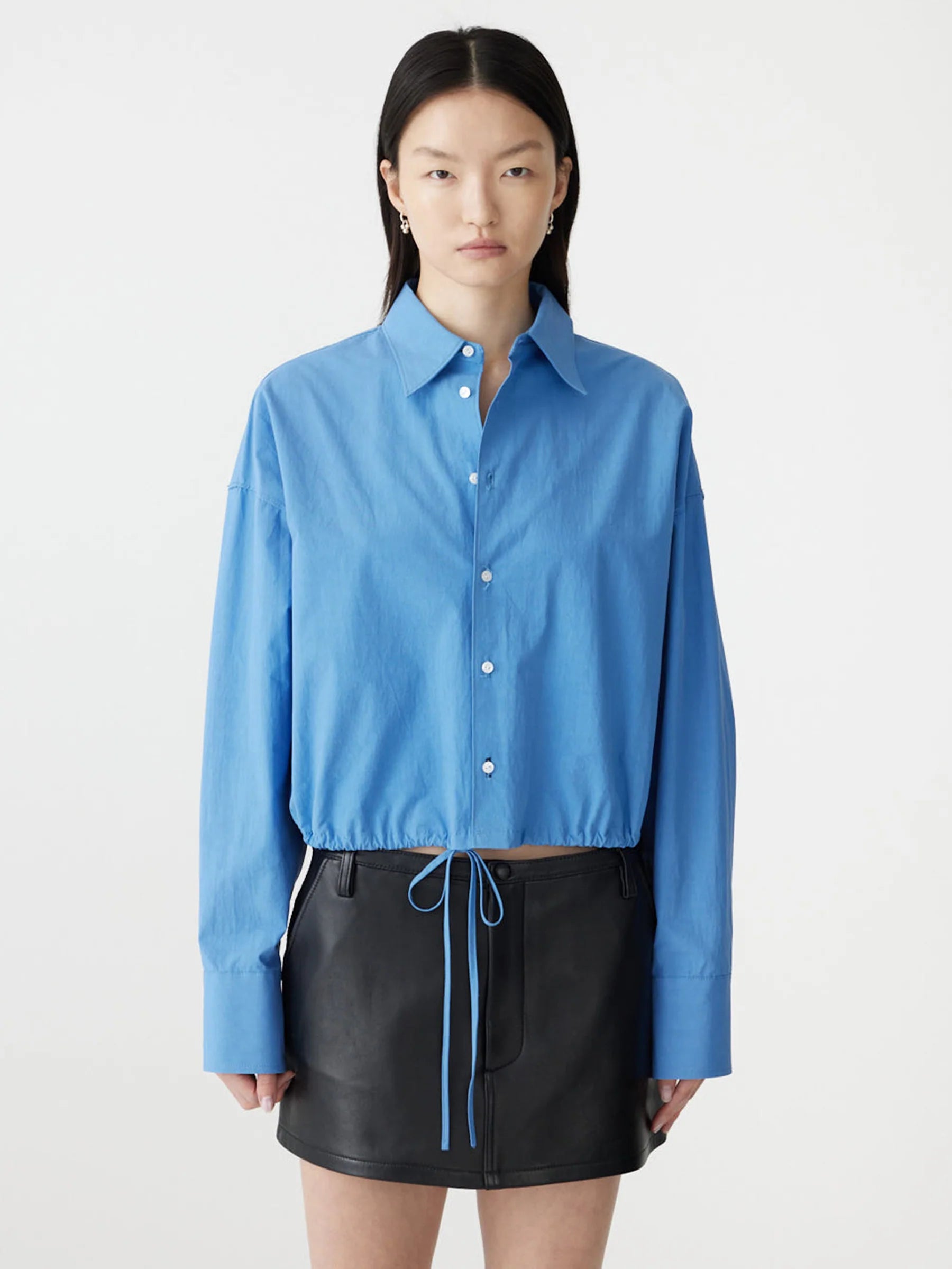 Bassike Crushed Cotton Gathered Shirt in Cornflower. The Crushed Cotton Gathered Shirt is designed in a boxy, cropped silhouette with a drawstring hem that can be cinched for adjustable shape. Featuring a front buttoned placket with a concealed snap at the hem and a double-layered back yoke for subtle structure. Crafted from lightweight compact cotton with a natural crushed texture.