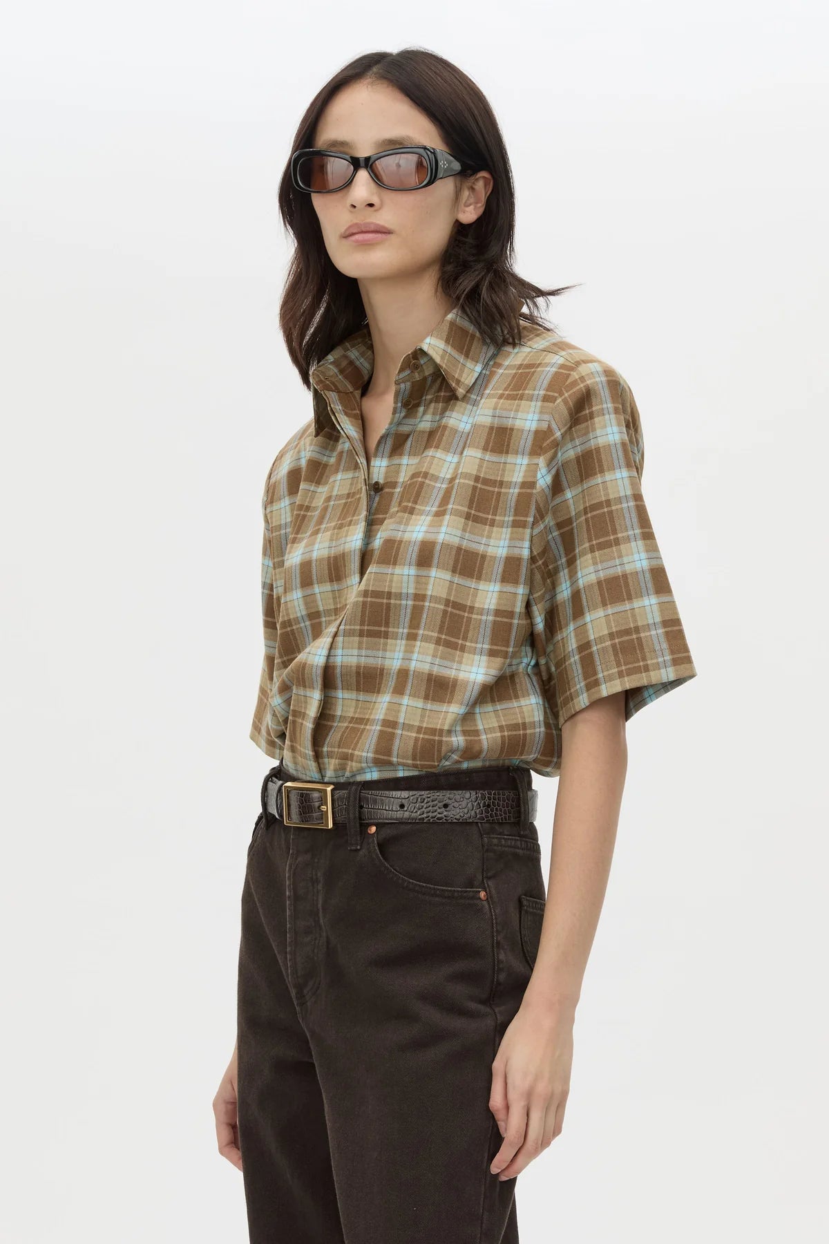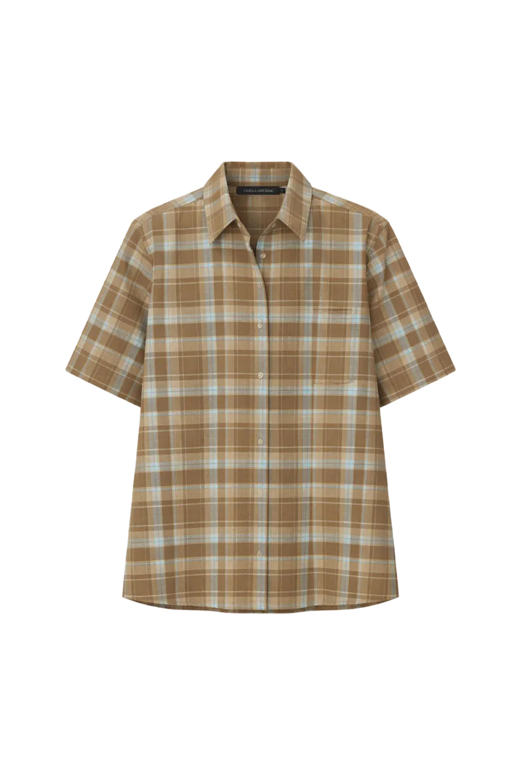 Camilla and Marc Arian Short Sleeve Check Shirt in Chocolate Check. CAMILLA AND MARC Arian short-sleeve collared shirt in chocolate brown check. Centre front corozo button placket, side splits, wide cuffs.