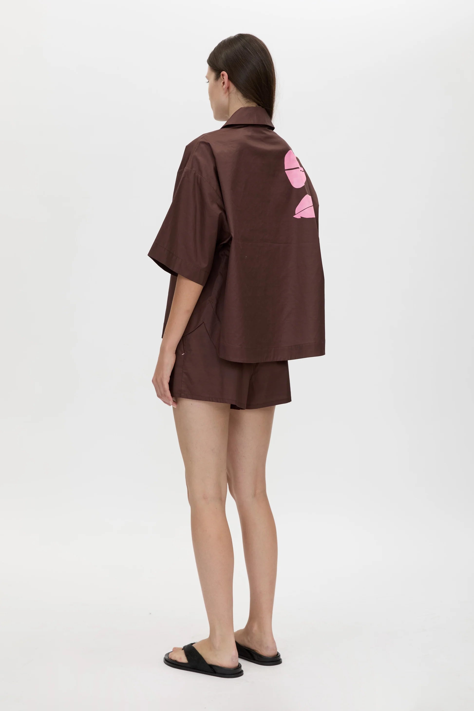 Camilla and Marc Sierra Shirt in Chocolate. The Sierra Shirt is crafted from Australian Cotton in a short-sleeved, boxy silhouette. This shirt features a dropped shoulder and a curved hem with wide facing.