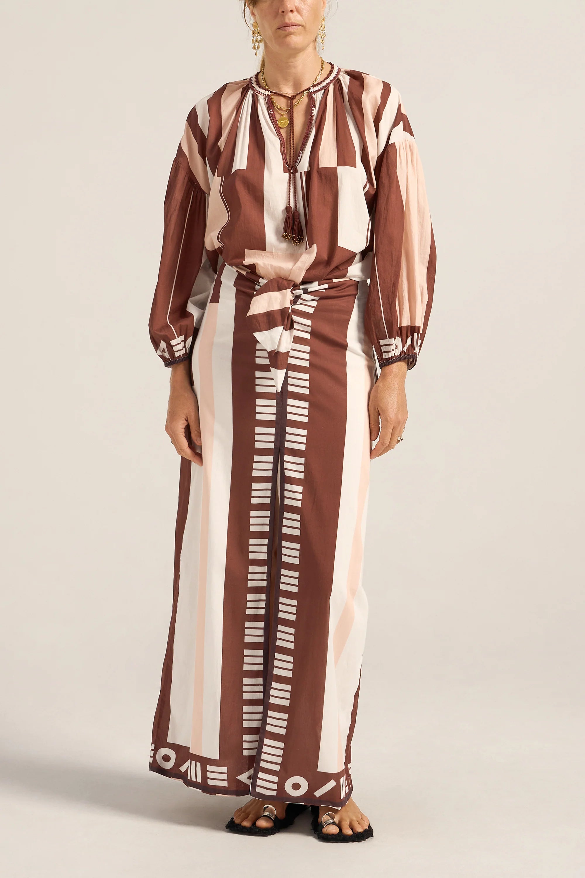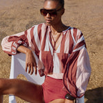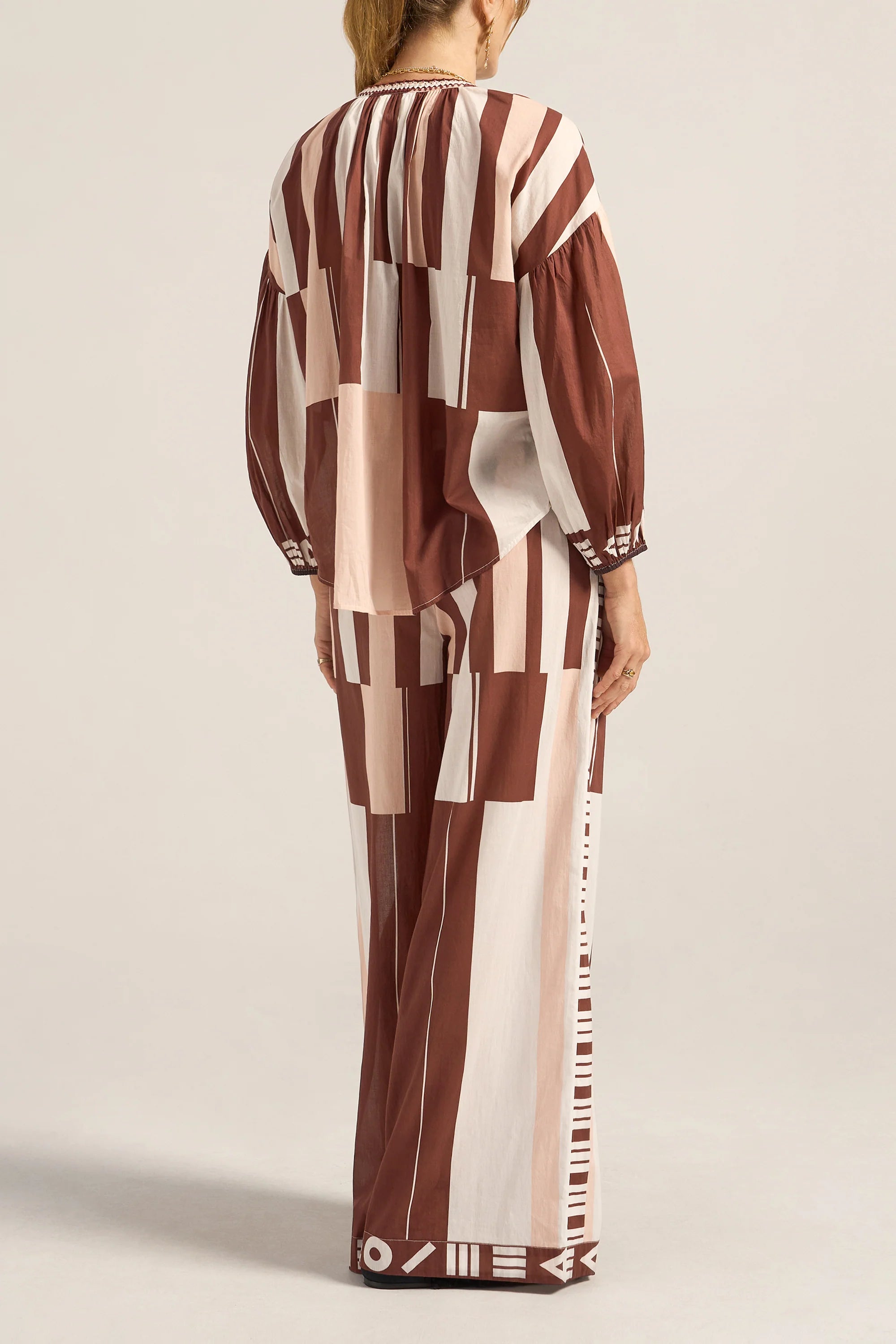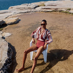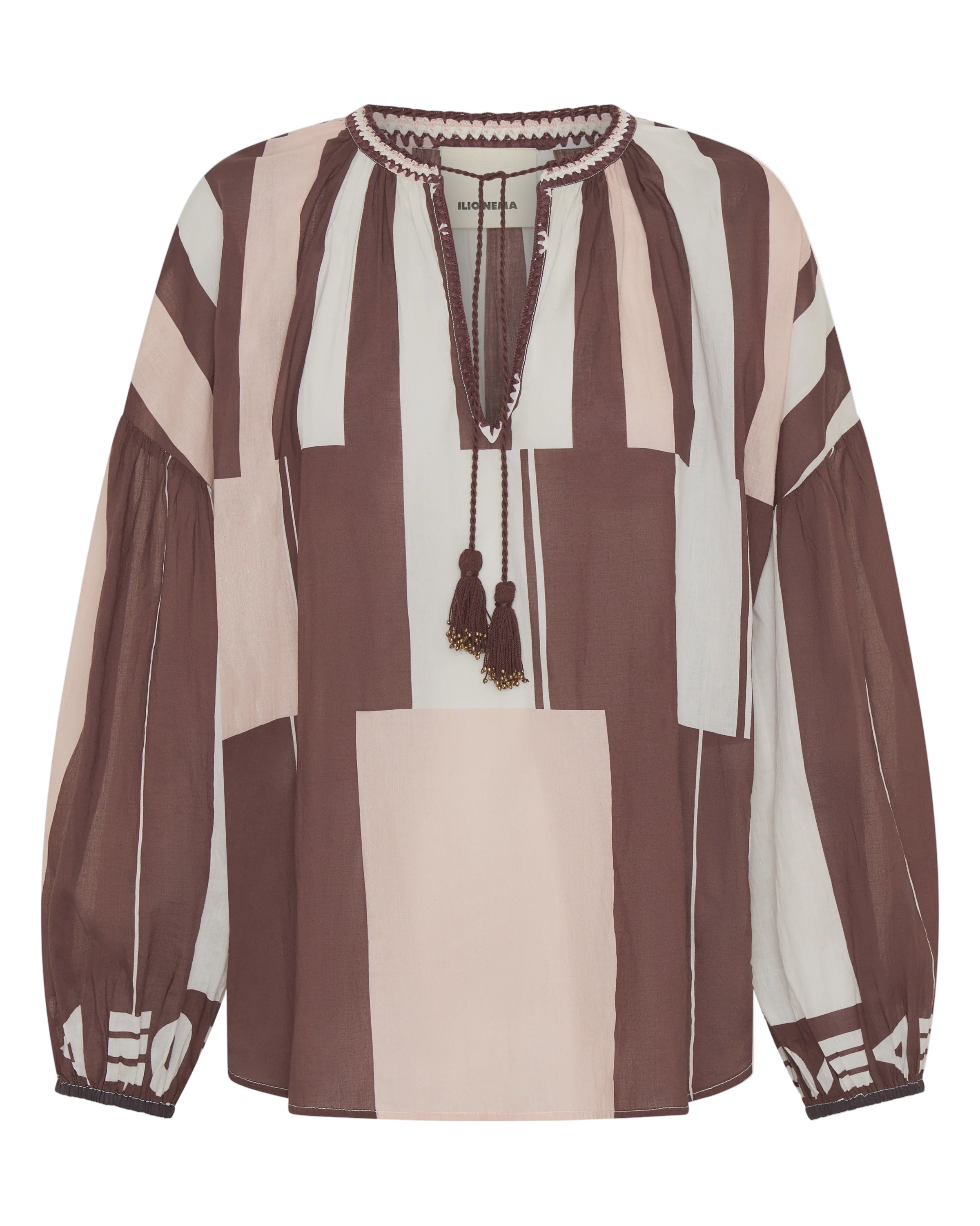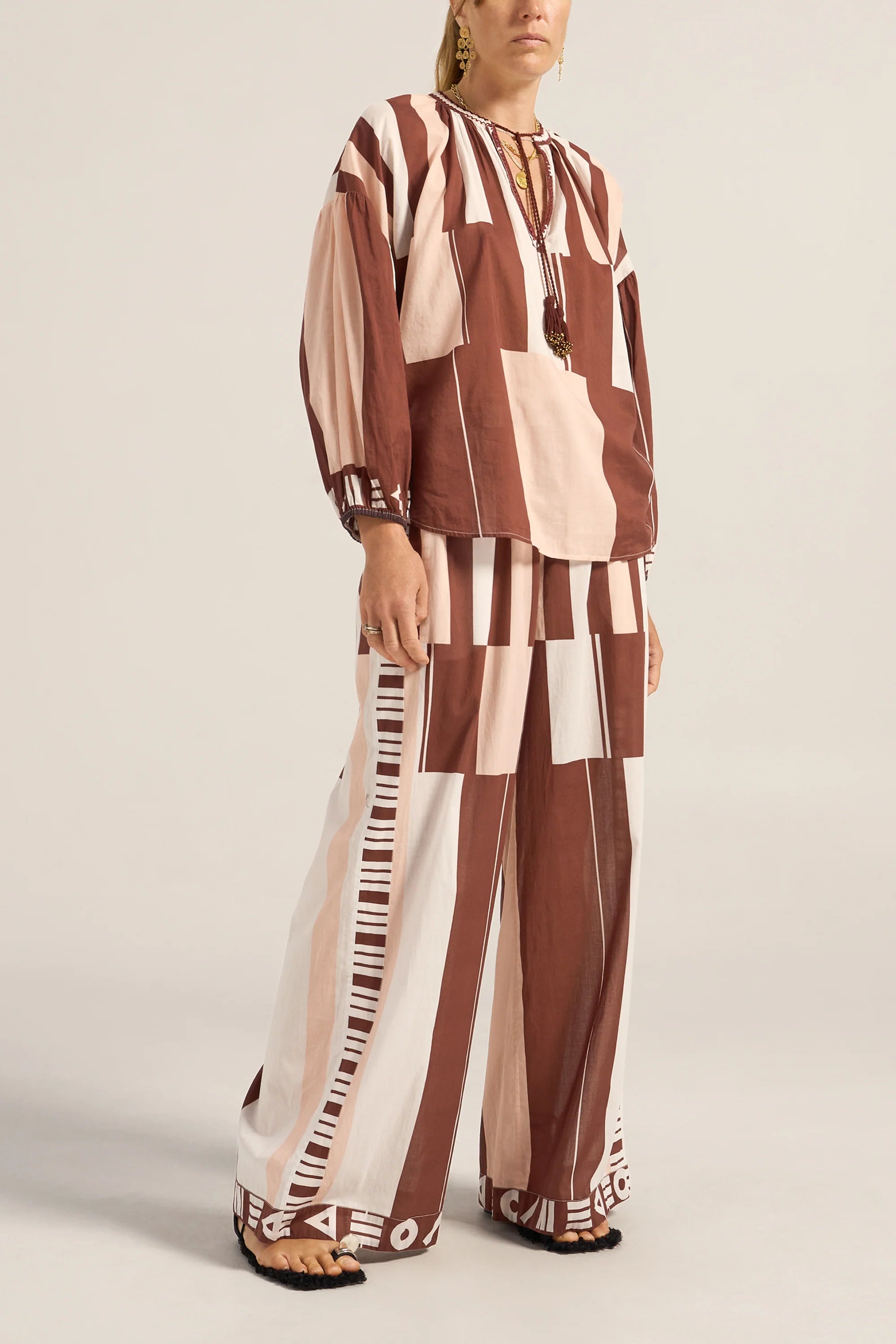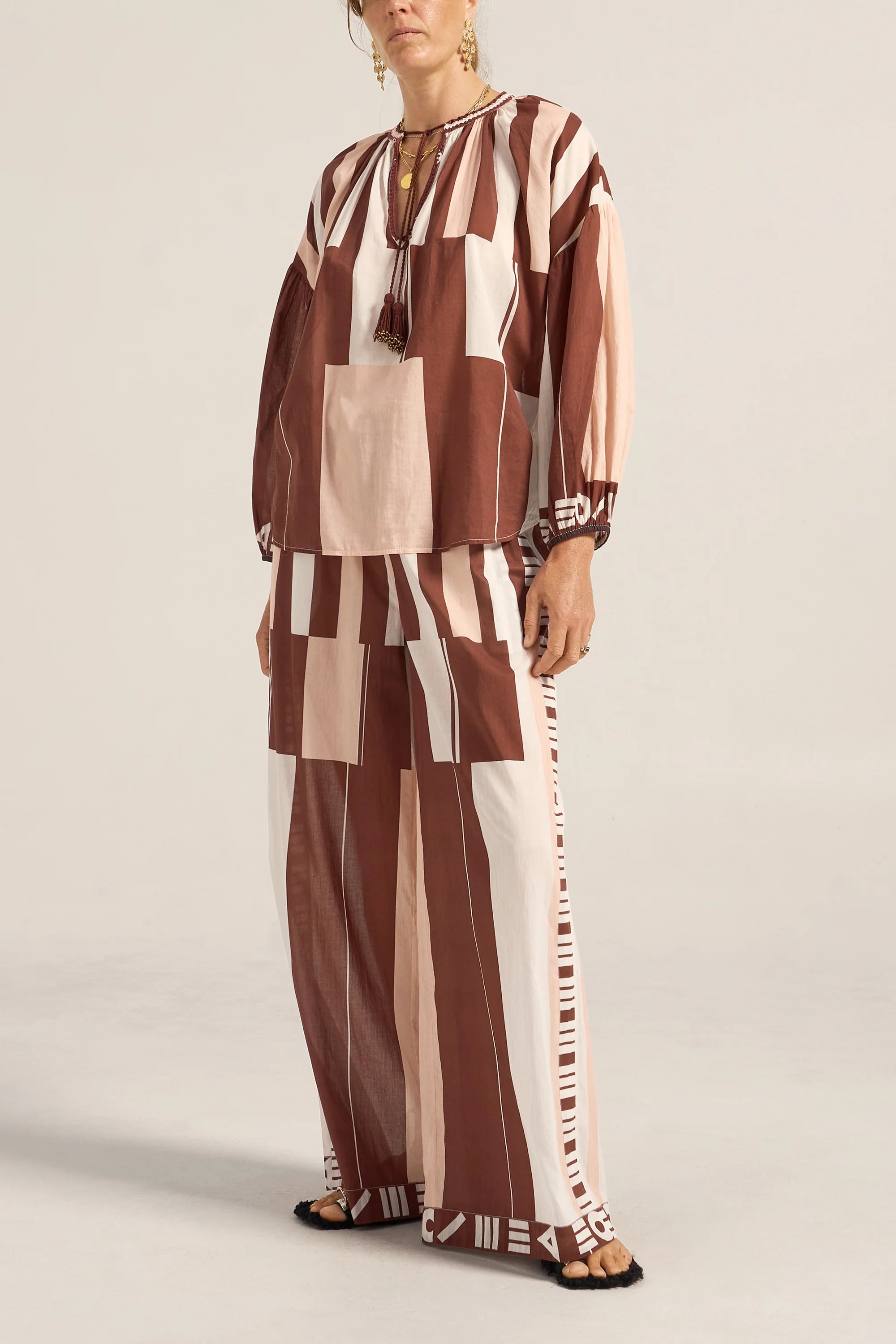 The Tyro Blouse is crafted from our Sarong voile, a lightweight cotton in a warm mix of pink, brown, and white tones. Designed with a relaxed, flowy silhouette, it features a softly gathered neckline finished with delicate hand crochet, hand beaded tassels, and breezy sleeves gathered at the elastic cuffs. Falling to hip height, the Tyro Blouse balances ease and femininity, making it perfect paired with the Clio Pants or your favourite relaxed jeans for effortless, sun-ready style.