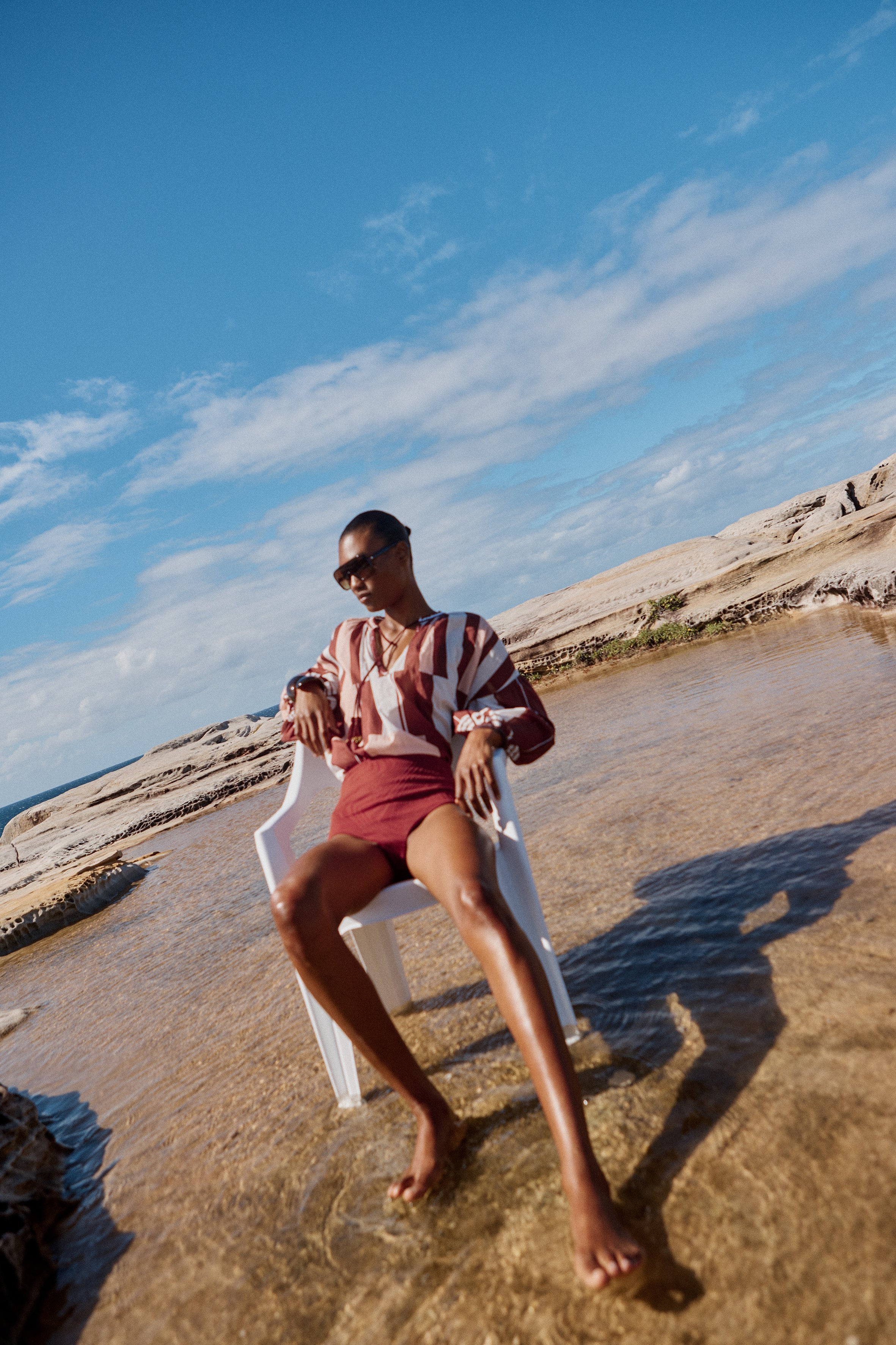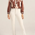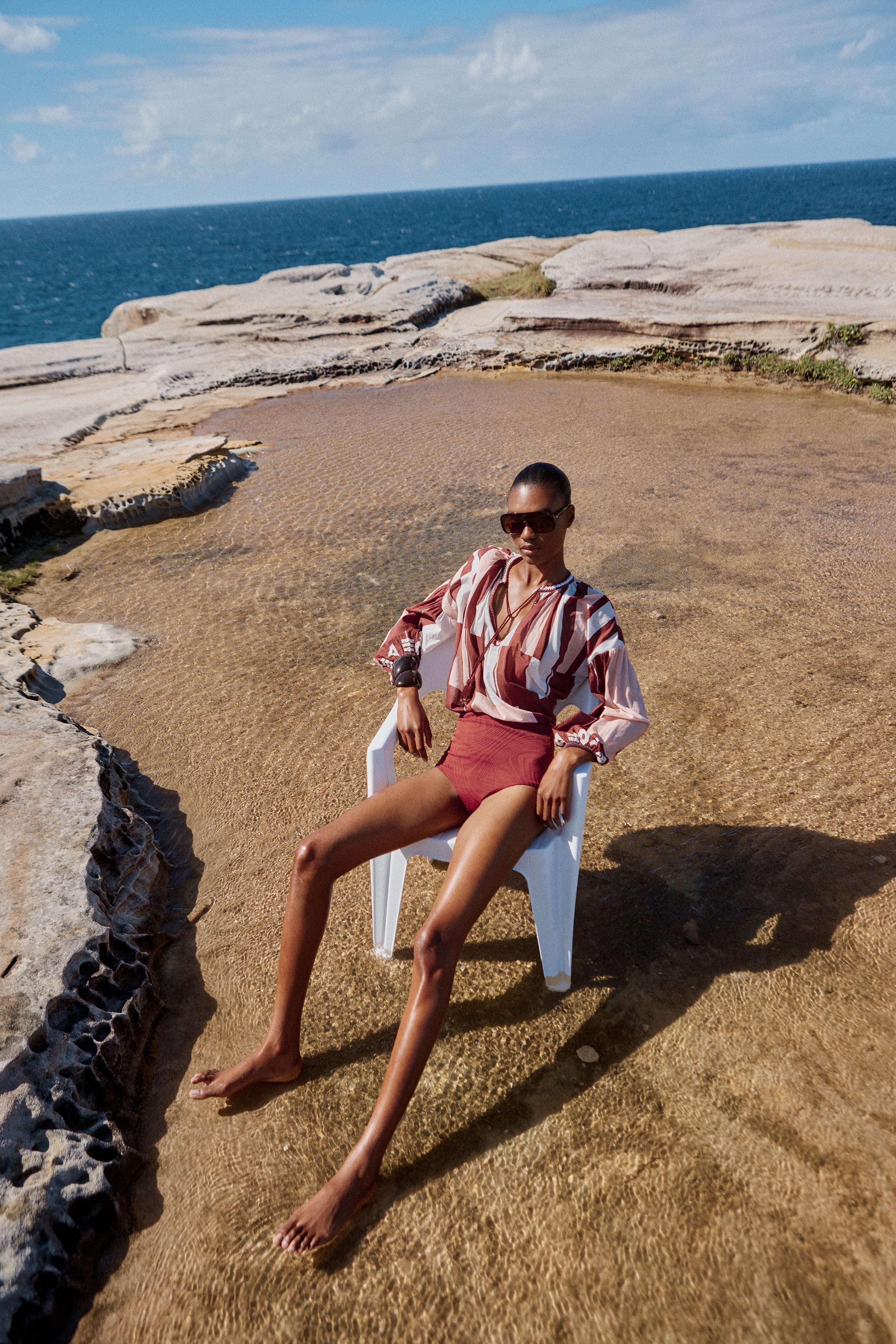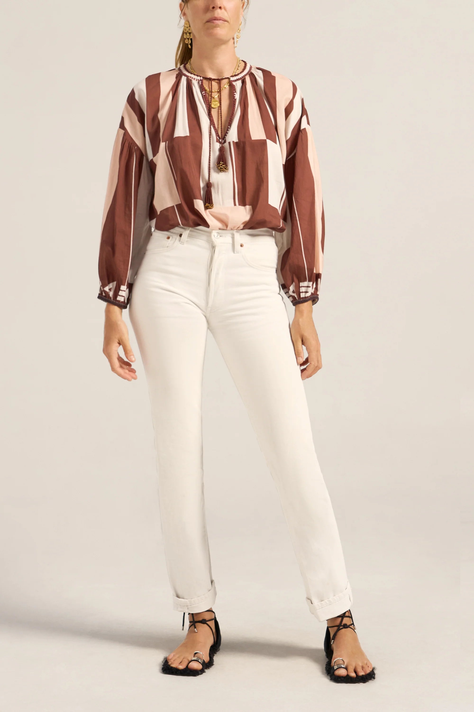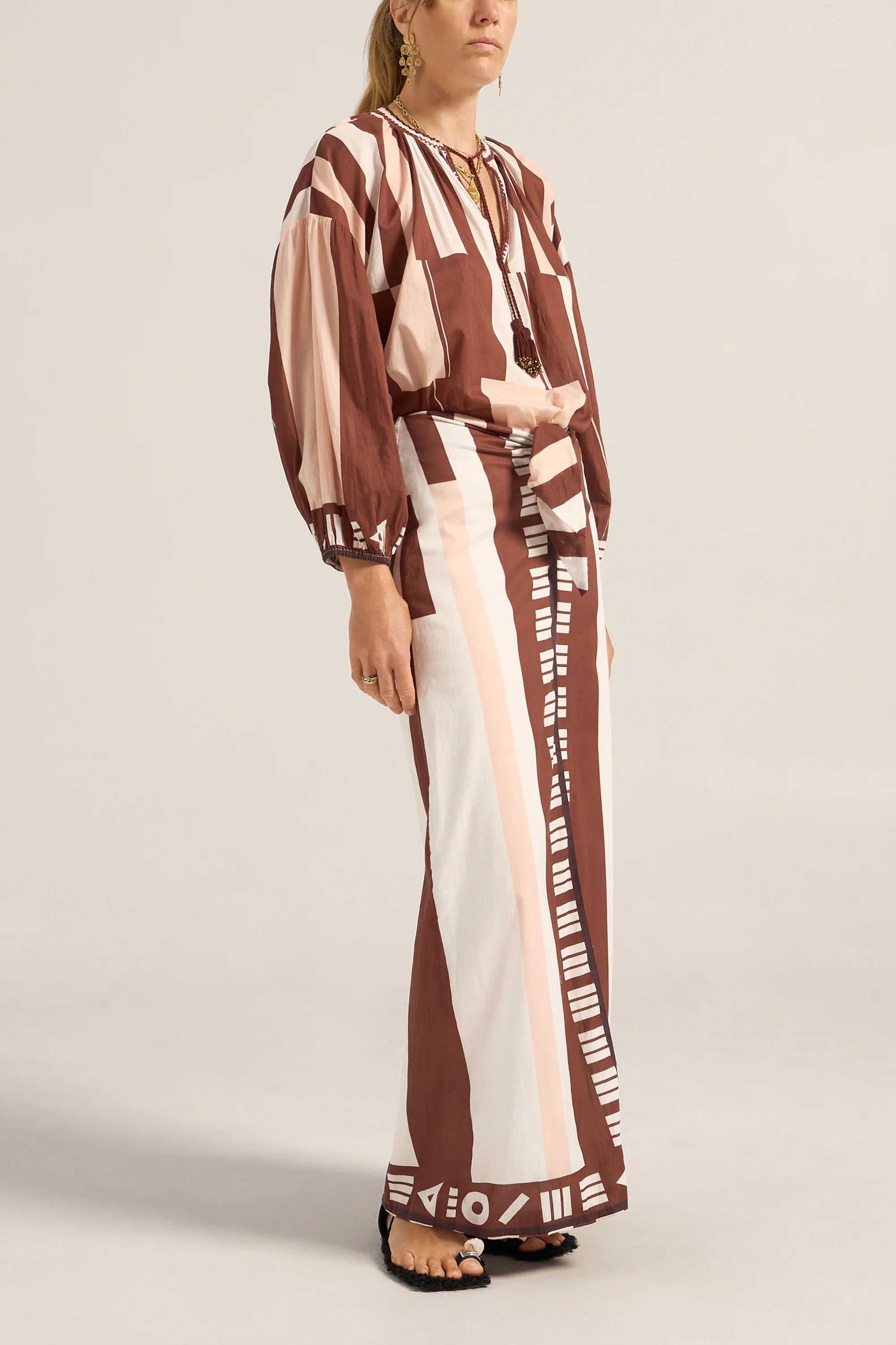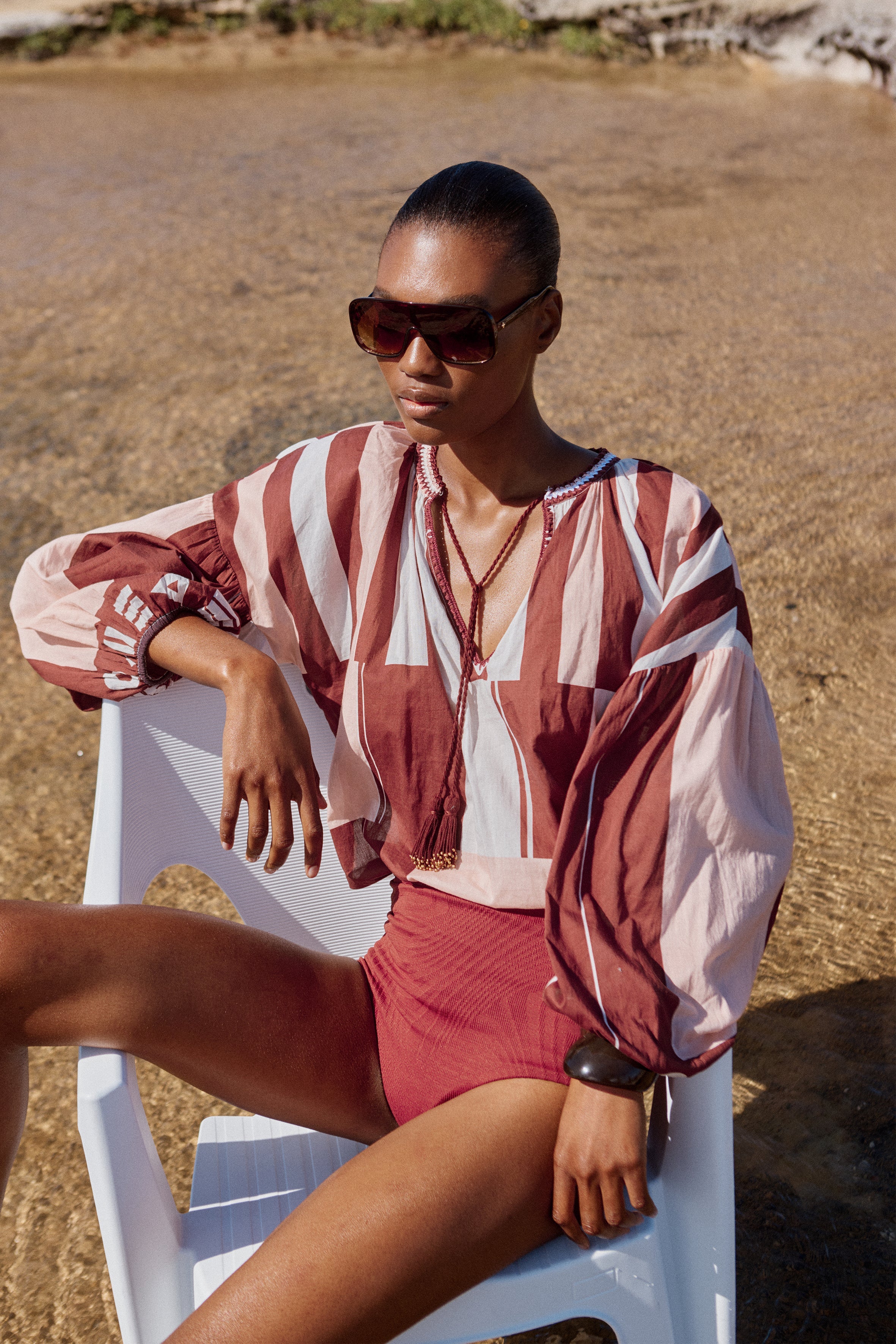 The Tyro Blouse is crafted from our Sarong voile, a lightweight cotton in a warm mix of pink, brown, and white tones. Designed with a relaxed, flowy silhouette, it features a softly gathered neckline finished with delicate hand crochet, hand beaded tassels, and breezy sleeves gathered at the elastic cuffs. Falling to hip height, the Tyro Blouse balances ease and femininity, making it perfect paired with the Clio Pants or your favourite relaxed jeans for effortless, sun-ready style.