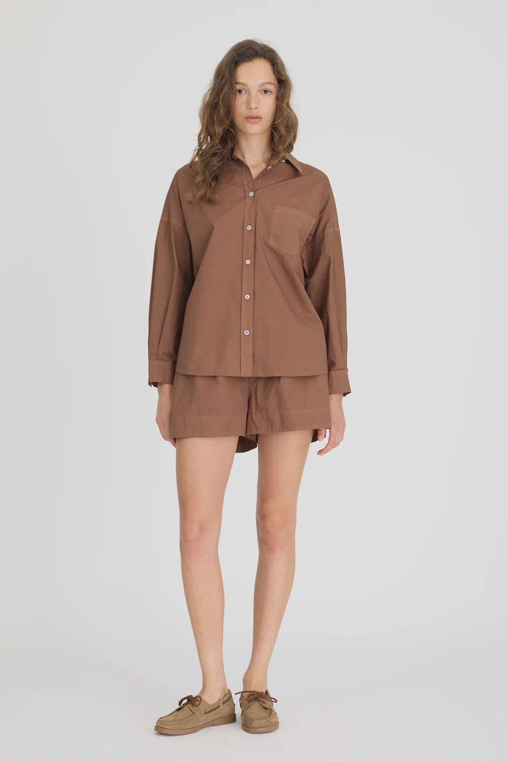 LMND Chiara Long Sleeve Classic in Macchiato. Our Signature Classic button-up shirt featuring customized stripe detail. Crafted from 100% yarn-dyed cotton, this shirt exudes both style and comfort. Features a chest pocket and our signature drop shoulders, creating a slightly loose silhouette that is perfect for layering under cozy knitwear or pairing with your favourite Chiara shorts.