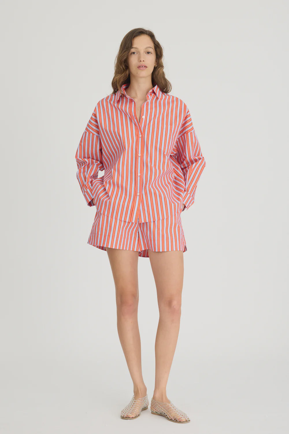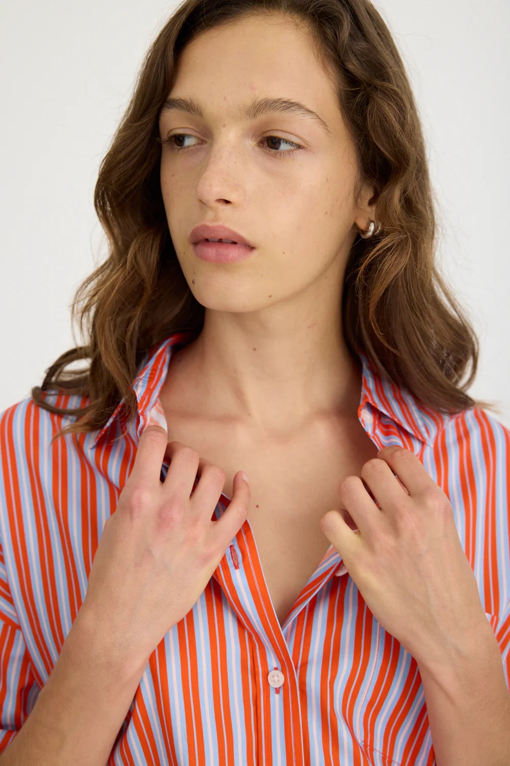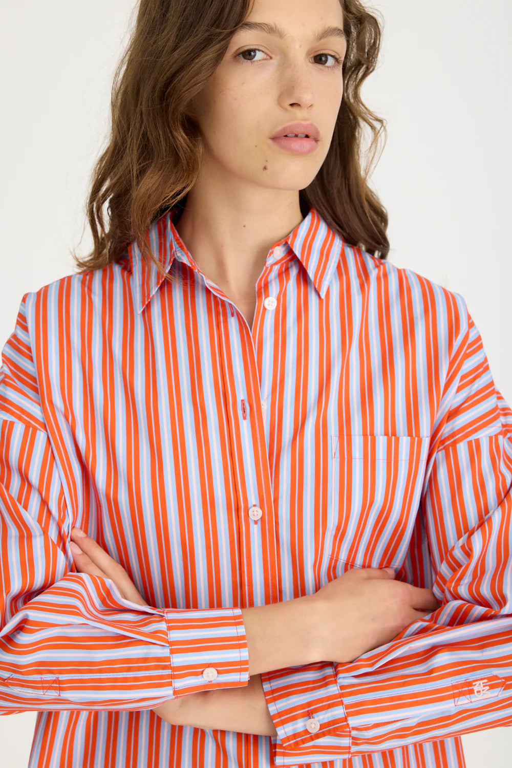 LMND Chiara Long Sleeve Shirt Multi Stripe in Spicy Orange and Himalayan and Blue. Introducing our Signature Classic Button-Up Shirt, featuring a stripe detail. Expertly crafted from 100% yarn-dyed cotton, this shirt effortlessly combines style and comfort. The design includes a practical chest pocket and our signature drop shoulders, creating a slightly loose silhouette perfect for layering under cozy knitwear or pairing with your favourite Chiara shorts.