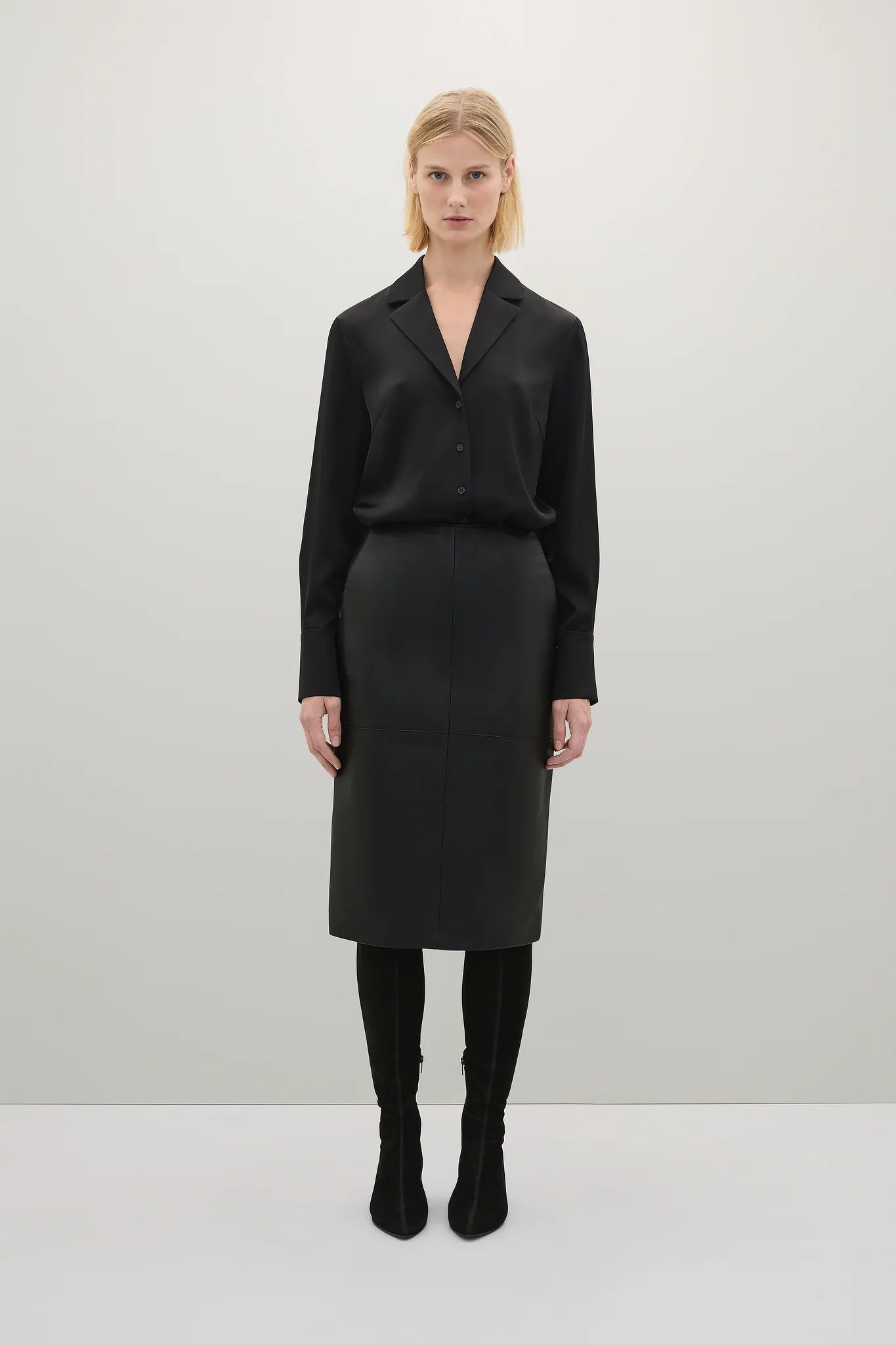 The A Emery Elijah Shirt in Black. The Elijah Shirt is an elegant shirting style crafted from premium Japanese triacetate and features a notched lapel collar, a softly curved hem, buttoned cuffs and buttons down the centre front opening.