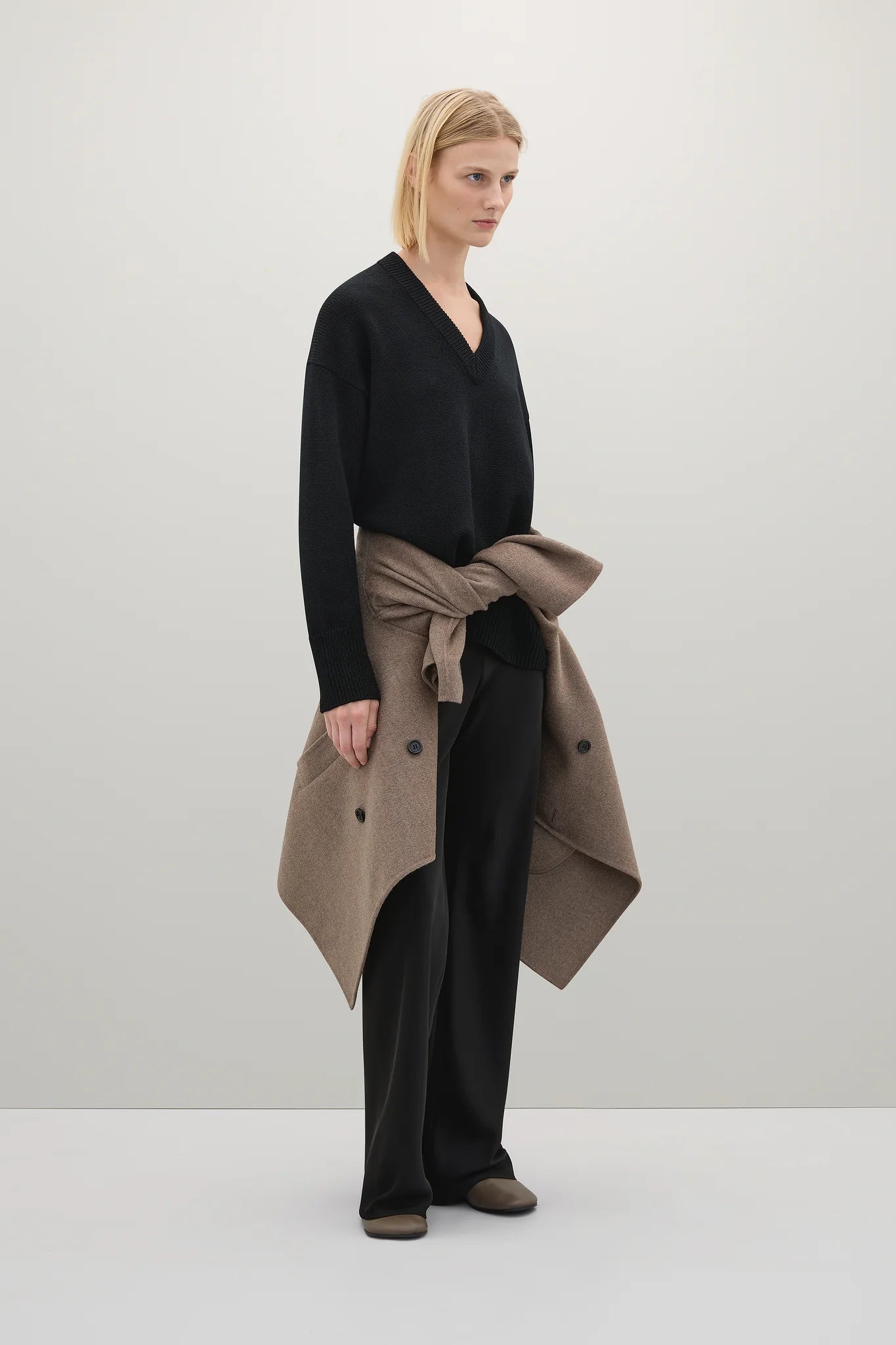 The A Emery Lewis Knit in Black. The Lewis Knit is a boxy V-neck sweater crafted from a premium merino wool blend and features a wide ribbed cuff and hem.