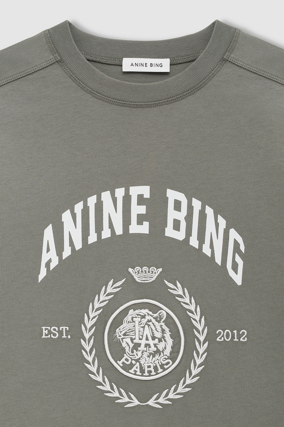 The Anine Bing Jaylin Tee Collegiate in Washed Sage. The Jaylin Tee Bing is your not-so-basic structured essential. Crafted from heavyweight 100% cotton jersey in Washed Sage, this tee delivers a premium feel with a retro-inspired silhouette. Finished with raglan sleeves, flatlock stitching, and ribbed cuffs for subtle edge. Made complete with an ANINE BING printed logo with an embroidered collegiate graphic at the front.