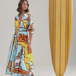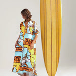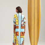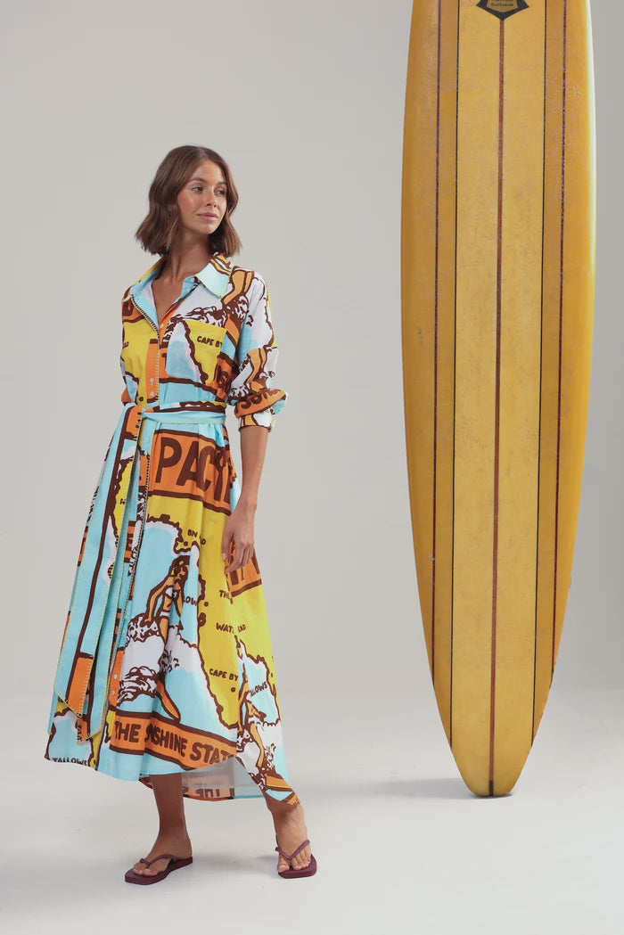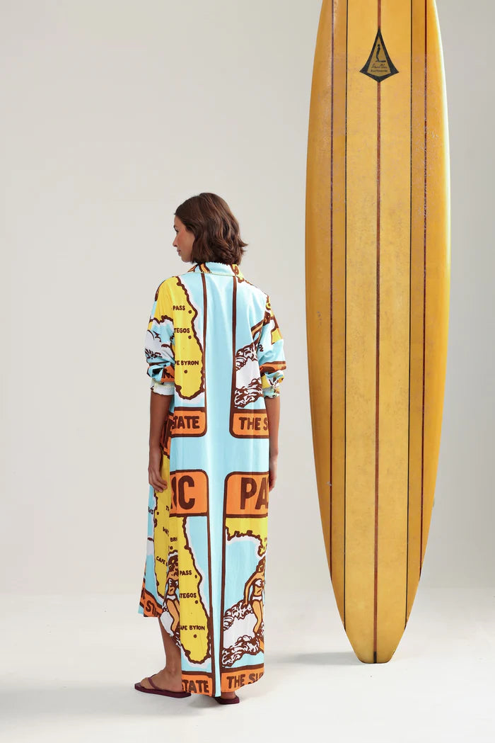 A beautiful combo of colours and built for long lunches. Just like your fine self. THREE BLUE DUCKS features a vintage east coast map, contrast sunshine blanket stitching, and a removable tie for when you need more room for dessert. It’s all cotton, all comfort, all holiday. Fully lined in softest floatiest cotton cambric.