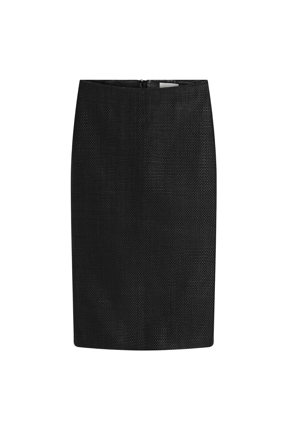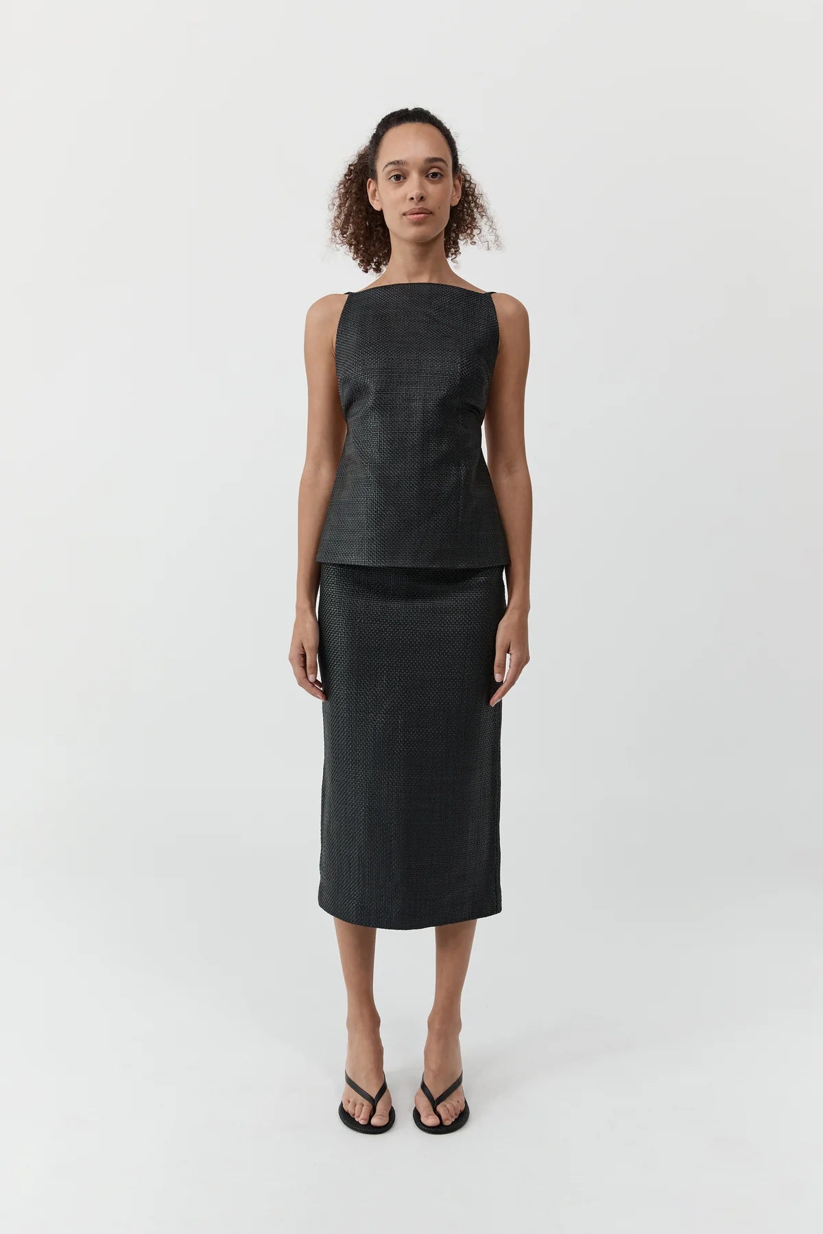 The St Agni Woven Leather Skirt in Black. Lined with breathable TENCEL™ Lyocell, the Woven Leather Skirt sits low on the waist and falls to a mid length. Subtle back darts shape the silhouette, while a discreet back vent allows for ease of movement. Fitted through the body, the Woven Leather Skirt offers a balance of structure and restraint.