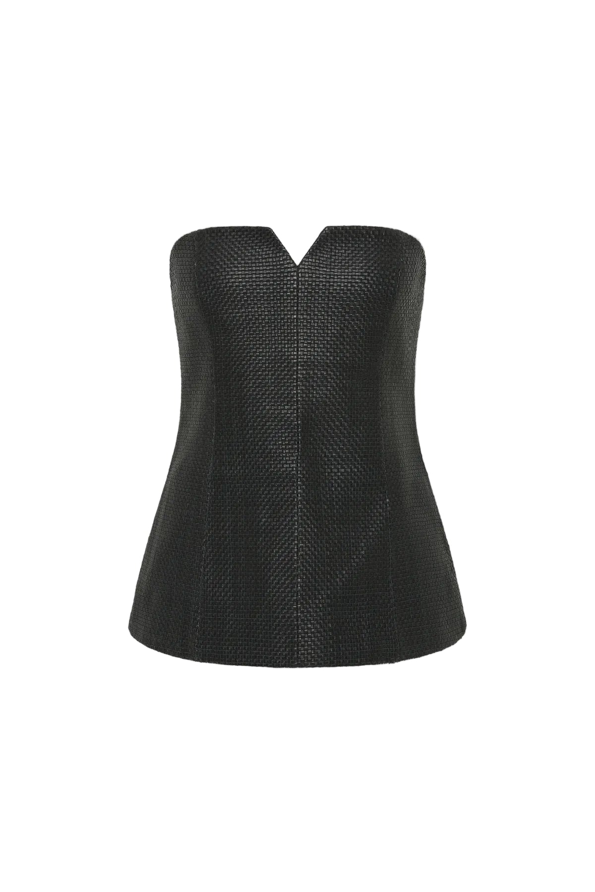 The St Agni Woven Leather Strapless Bodice in Black. The Woven Leather Strapless Bodice is crafted from soft 100% lambskin and lined with TENCEL™ Lyocell. Featuring a clean strapless silhouette with a subtle v-neckline, with front and back panel detailing and internal boning provide structure and support. Shaping the body with intention, the Woven Leather Strapless Bodice pairs seamlessly with the Woven Leather Skirt for a considered ensemble.