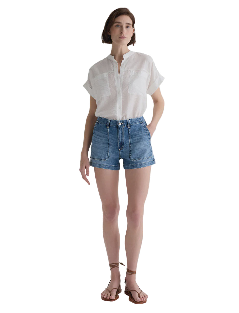 The Analeigh Short is a high-rise style crafted from comfort stretch denim for flexibility and all-day wear. Designed in a light blue wash, it features workwear-inspired pockets that add a utilitarian touch.