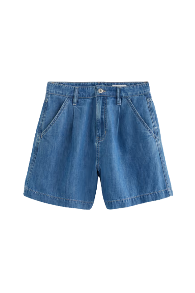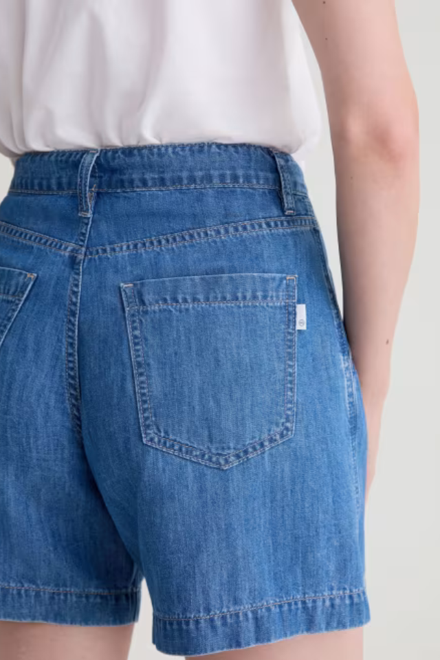 The Mandy Short is a high-rise style crafted from non-stretch Scarlett Irisblue Chambray in a medium blue wash. Designed with trouser pockets and clean stitched hems for a polished, structured look.