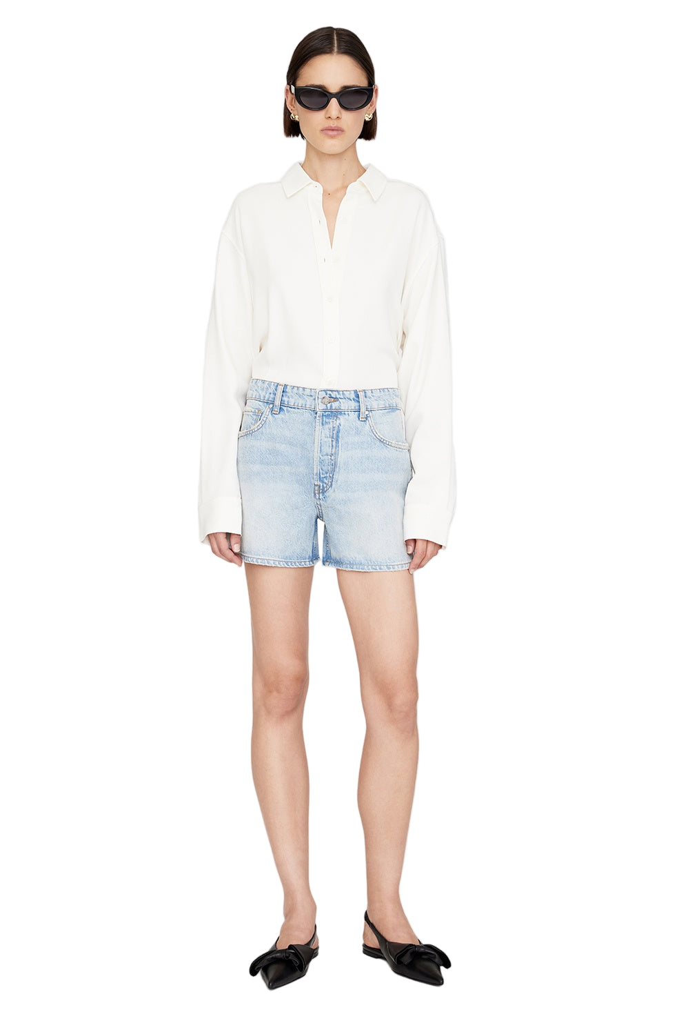 Anine Bing Dalton Short in Bleached Blue. The Dalton Short is constructed from lightweight 100% cotton rigid denim in a pacific blue wash. Its high-waisted silhouette is intended to be worn low on the hips for an ultra-relaxed look.