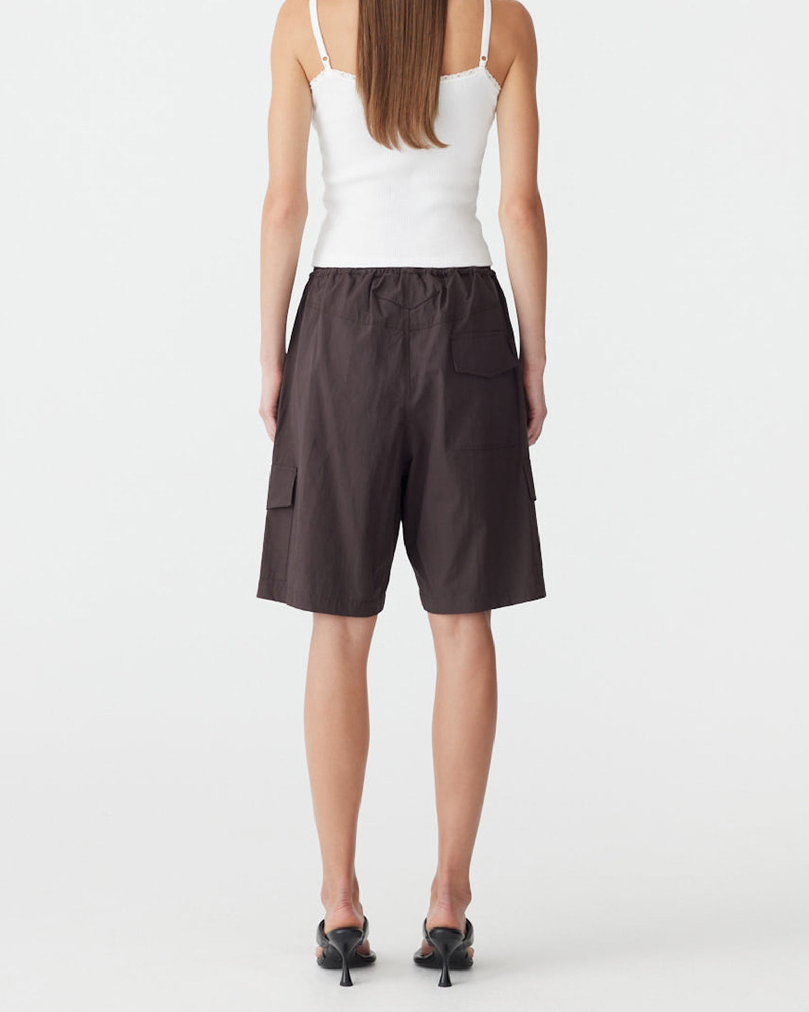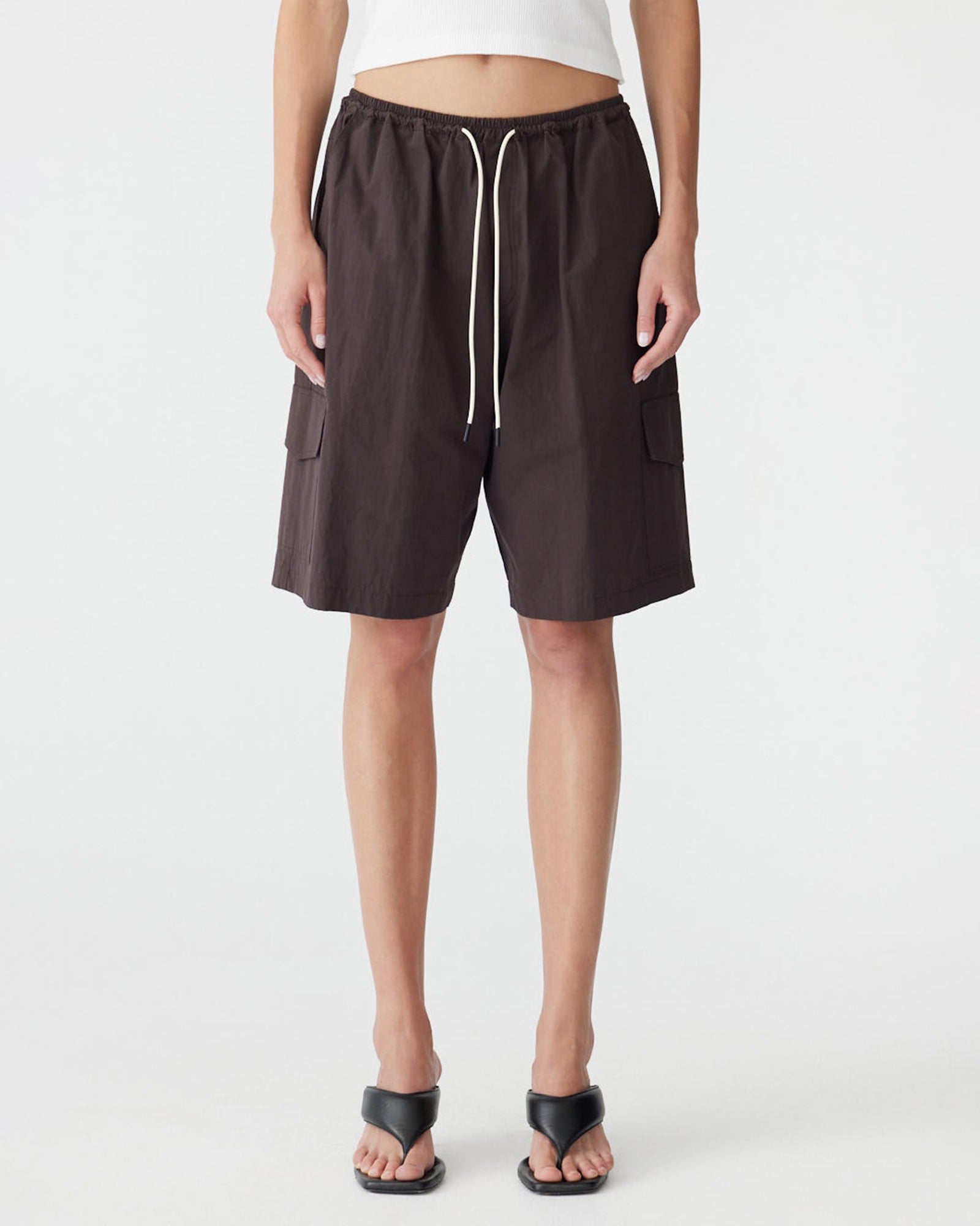 Bassike Crushed Cotton Cargo Short in Chocolate Brown. Voluminous pull-on short crafted from crushed cotton for a soft, textured finish. Designed with a fine elasticated waistband and premade drawcord, featuring cargo flap pockets on each side leg and a flap patch pocket at the back. Finished with a back yoke and Bassike branded stitching.
